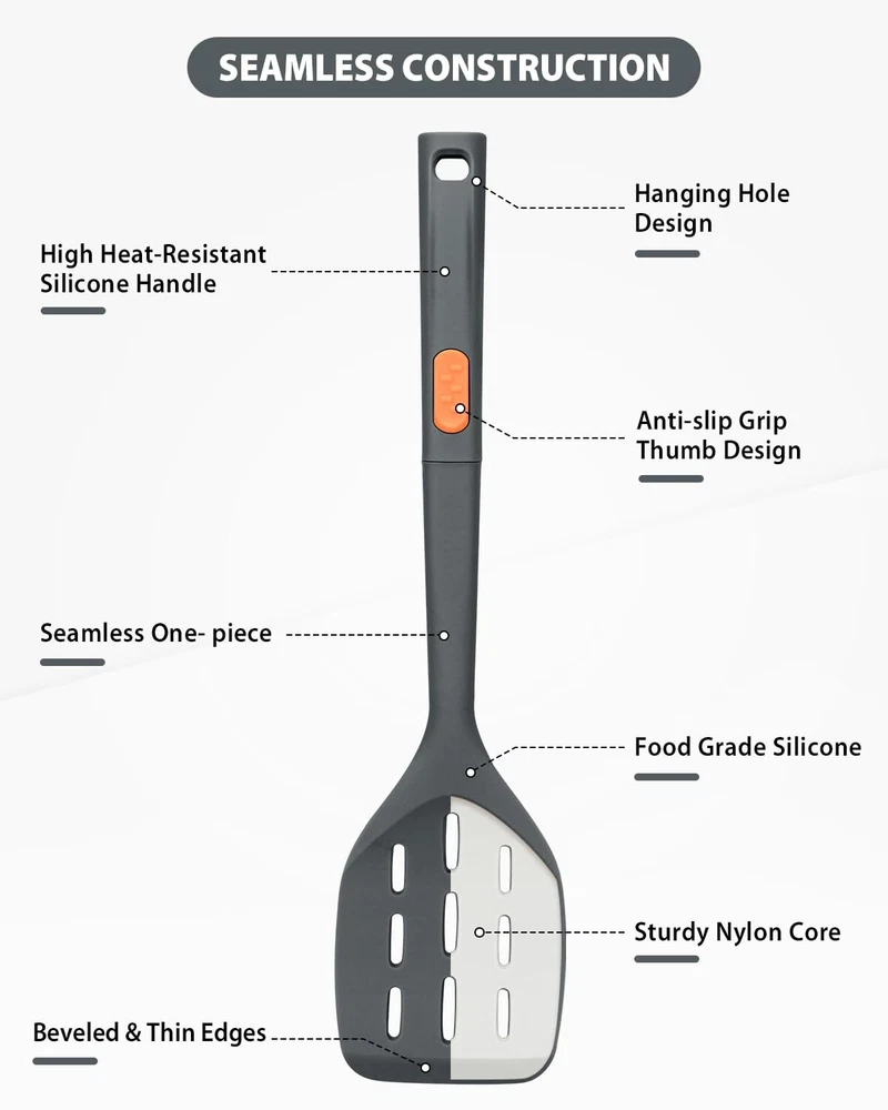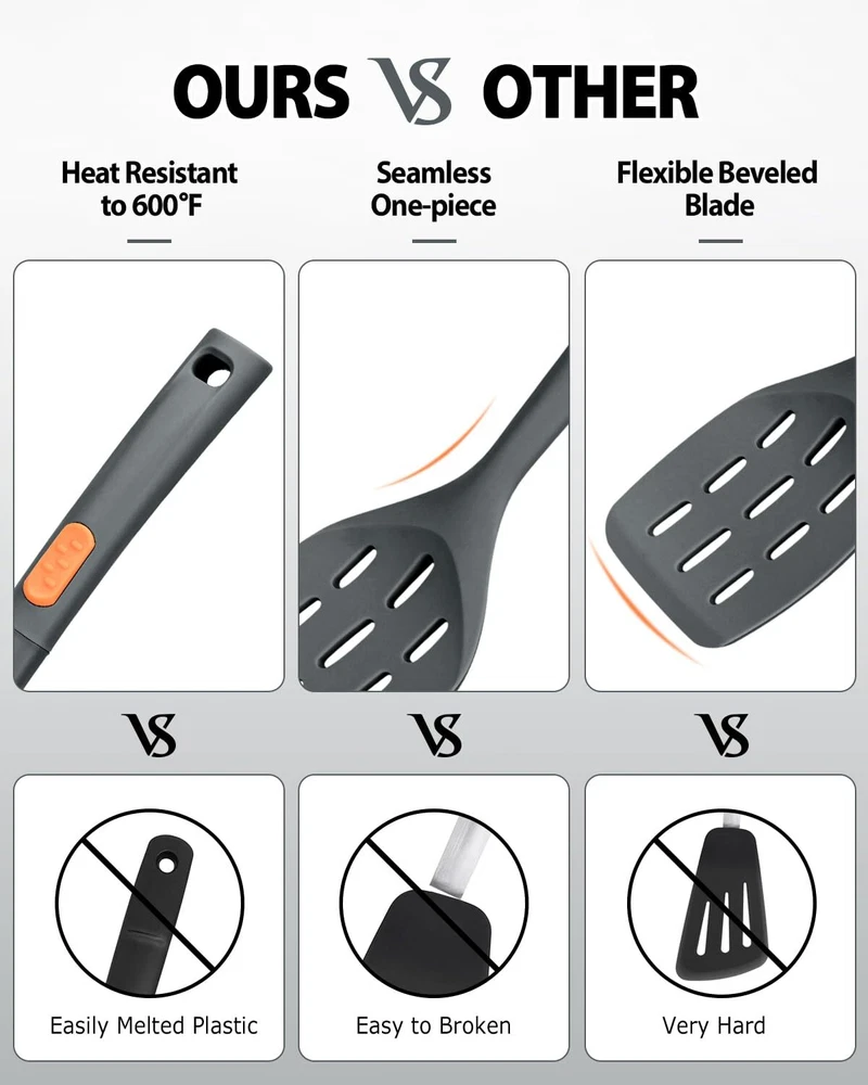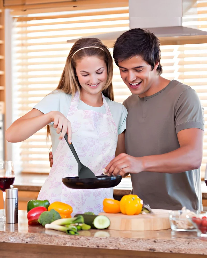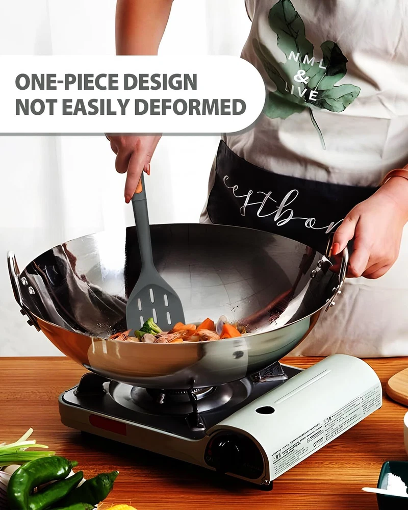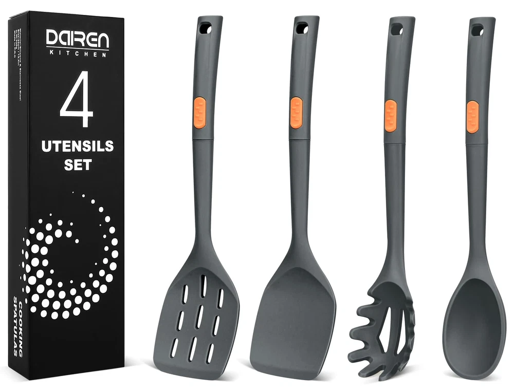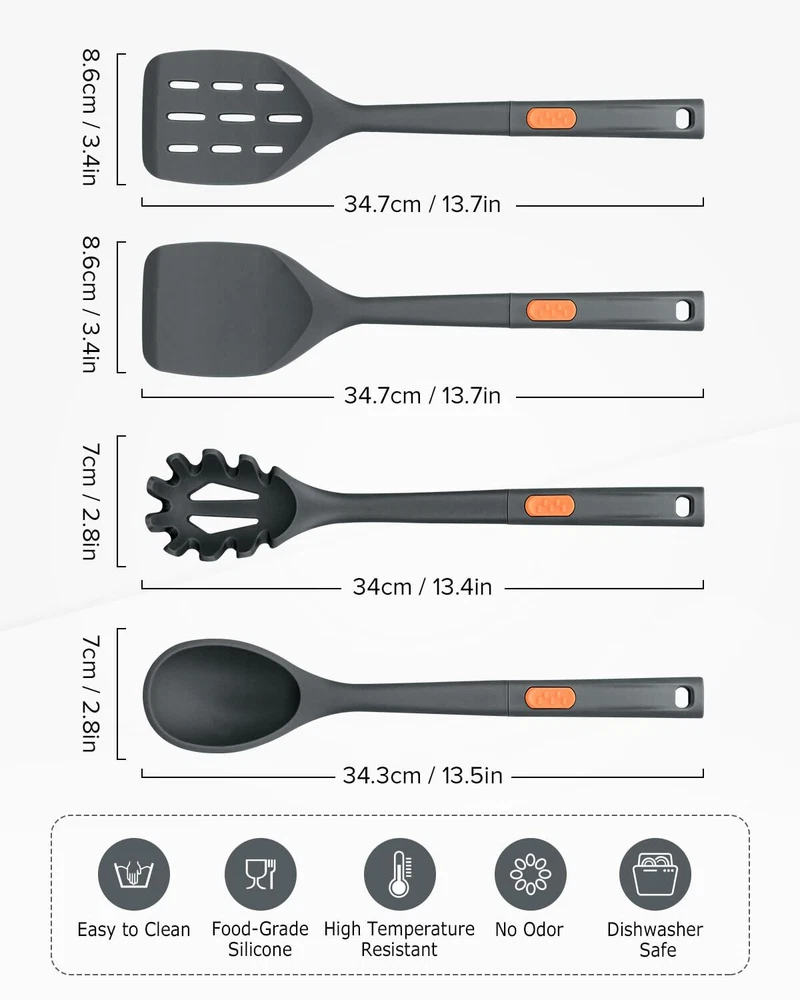 Silicone Cooking Utensils Set: Pack of 4 large silicone cooking spatulas and spoons are nonstick, This kitchen utensils set includes a slotted spatula, a solid spatula, a solid spoon and a Pasta fork, ideal for frying, mixing, serving, draining, turning and stirring. Heat Resistant: Our silicone spatula turner and spoon set is made of food grade silicone . BPA free and will not rust. Even at 600℉, you don't have to worry about melting or deformation. Easy to Clean: Dishwasher Safe Silicone Spatulas for Convenient Kitchen Cleanup Ergonomic Design: Comfortable Silicone Handle Grip for Effortless Cooking Experience Easy to Use for Precision Cooking: Our spatulas feature a beveled, thin, and flexible blade edge that effortlessly slips under food for easy flipping. Whether you're a novice or a seasoned chef, these utensils make cooking simpler and more enjoyable