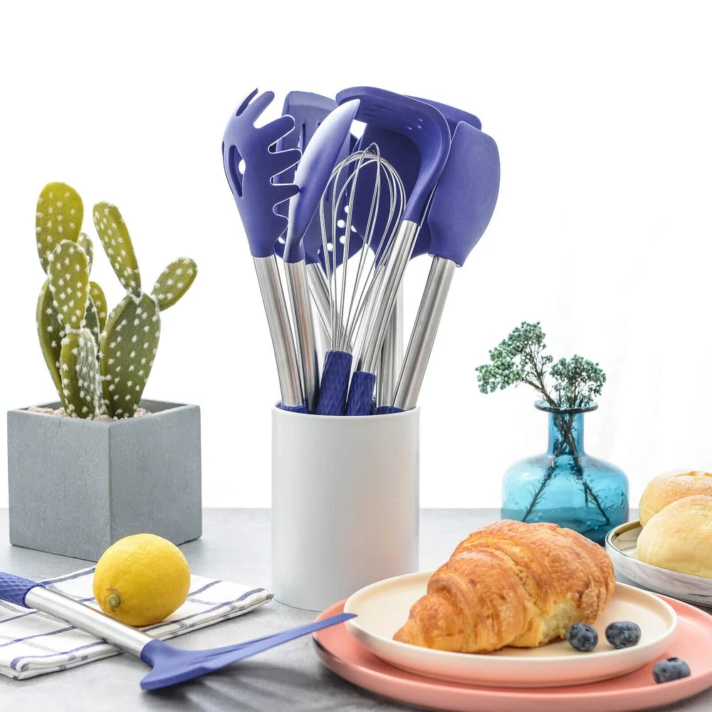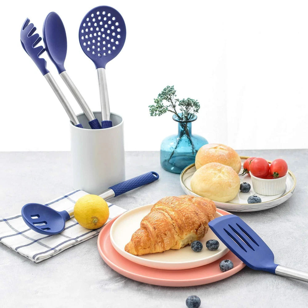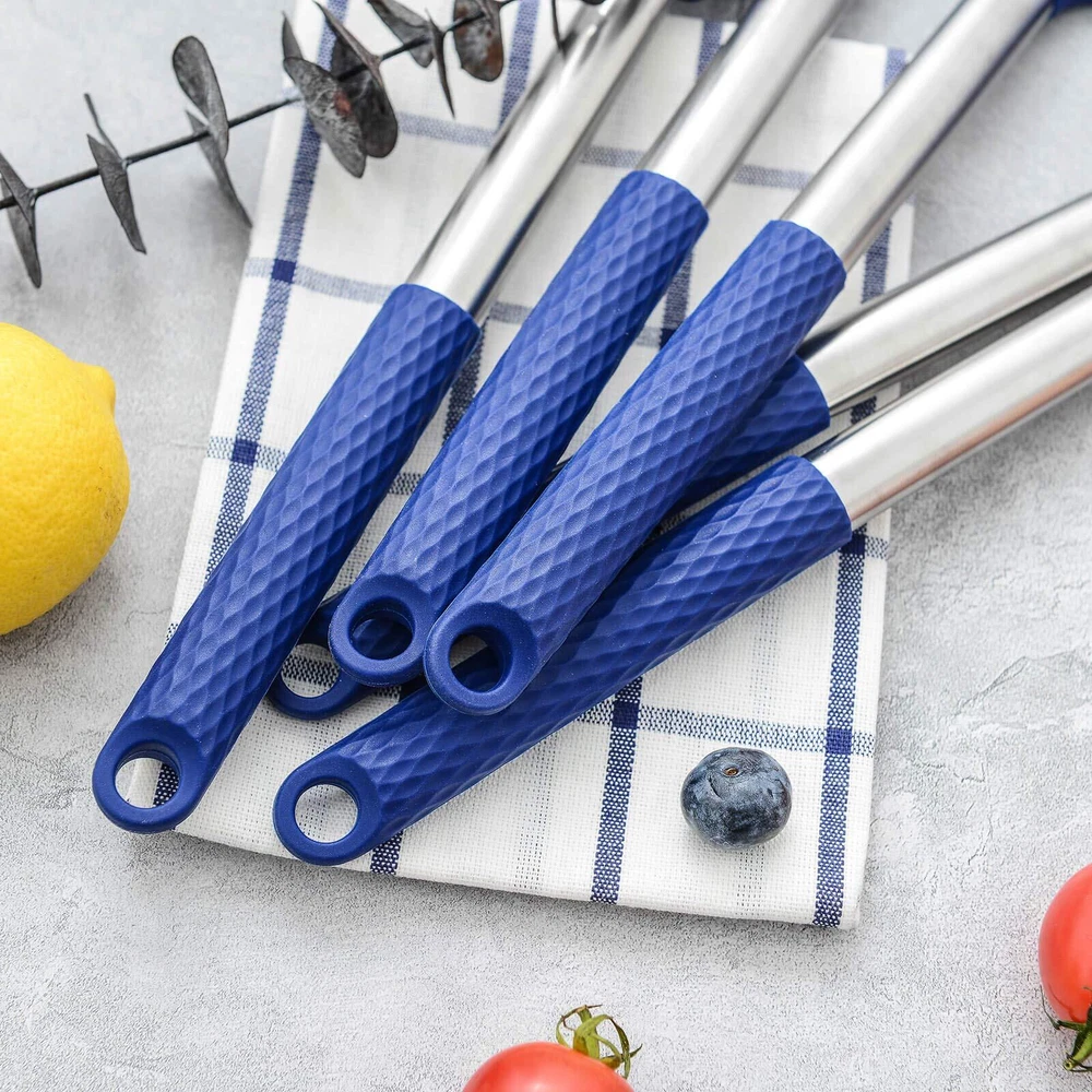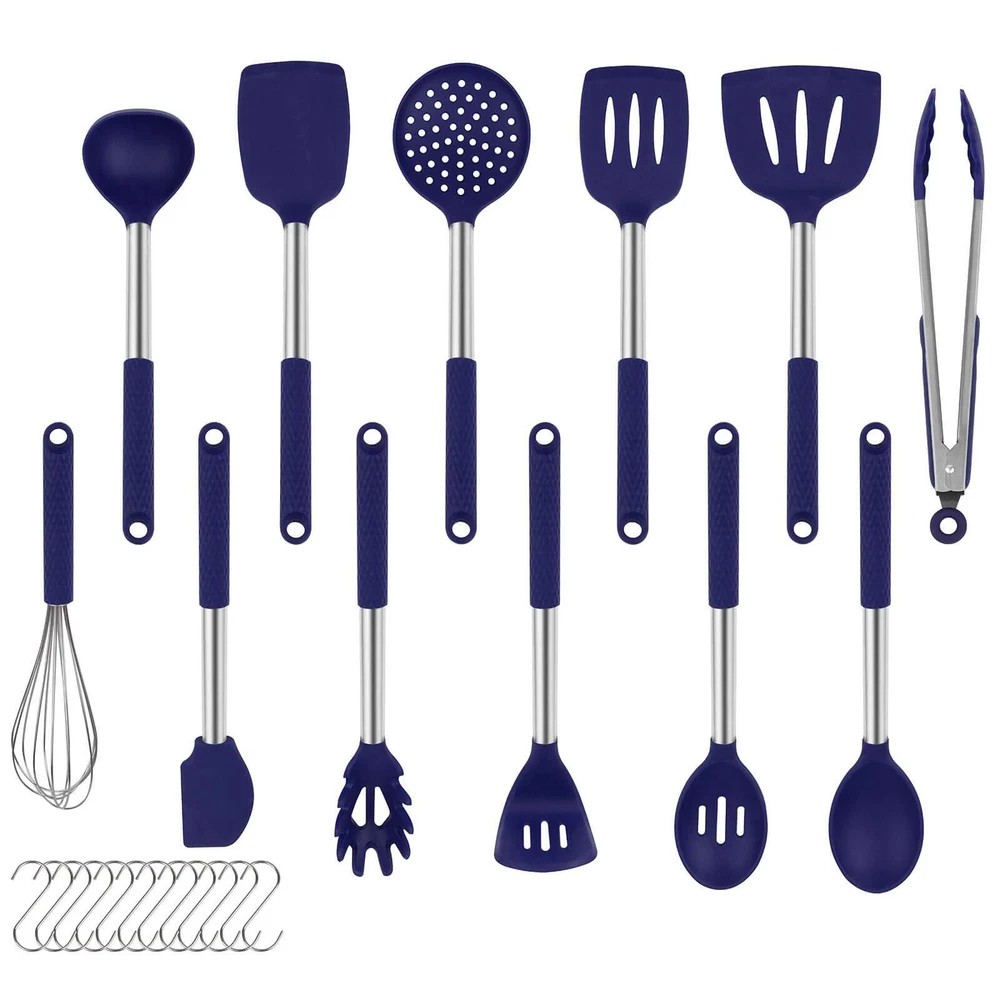 【All You Need For Cooking.】 Set includes slotted spatula, slotted spoon, flexible spatula, slotted turner, solid turner, pasta server, solid spoon, kitchen tongs, draining spoon, whisk, deep soup ladle, spatulas and potato press. 【Heat Resistance and Soft Nonstick Silicone, Protect Your Cookware.】 Heat-resistance up to 482°F (250°C). Bpa free & food grade silicone does not react with food or beverages, or produce any hazardous fumes. 【Stainless Steel Handles with Silicon, Durable and Anti-Skid.】 The stainless steel handle is durable and solid. The silicone coated is non-skid and comfortable to the touch, completely prevents the heat transfer during the cooking process. 【Easy to Clean Up and Storage.】 Dishwasher Safe. The utility hanging hole designed on the handle, Come with 12 hooks, make they easy to hang for store. They also can be stored tidy in the Rotated Utensil Holder. 【Elegant Image, Stylish Color, Ergonomic Design and Functional.】 This kitchen tool set is a perfect gift for many occasions such as Christmas, Thanksgiving, wedding, birthday, and housewarming.
