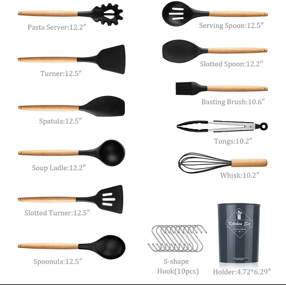 -Brand New - Never Used - Questions: Feel free to ask any Questions - BOX: Never Opened - DESCRIPTION: Protective Design Our kitchen utensils feature anti-scalding wooden handles, ensuring your hands stay safe. The professional silicone set includes all essentials: Pasta Server, Serving Spoon, Turner, and more. Avoid prolonged soaking and dishwashing for longevity. * Safe & Non-ToxicMade from BPA-free, food-grade silicone, these utensils are odorless and safe for high-temperature cooking. Soak for 30 minutes before first use to eliminate any initial smell. * Heat-Resistant & DurableWithstand heat up to 446°F without melting or warping. The soft silicone heads protect your non-stick cookware from scratches. * Sturdy Wooden HandlesDesigned for strength and durability, our wooden handles resist bending and breaking. Contact our customer service for any issues. * * Perfect GiftThis complete set is ideal for cooking enthusiasts and makes a great housewarming or wedding gift, keeping kitchens organized and stylish! - OFFERS: Reasonable offers are considered, LOWBALLERS, Best price and Lowest askers will be ignored - all sales final/no refunds/ no exchanges/ no returns - Disclaimer: I do not own the brand's trademarks, logos, pictures, or products posted. I do not intend to infringe on copyright. I find such content available on the internet. Contents are considered fair use. - Silicone Cooking Utensils 22pcs Kitchen Utensil Set, Wooden Handle Nontoxic BPA Free Silicone Spoon Spatula Turner Tongs Kitchen Gadgets Utensil Set for Nonstick Cookware with Holder and 10 S Hooks Best Christmas Gifts for Your Mom, Friends, or Lover
