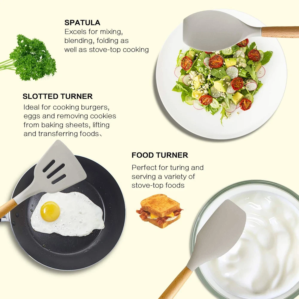Silicone Cooking Utensils Set Our Kitchen Utensils Set is designed to make your cooking easier and faster. Each one of our utensils is sturdy, durable, premium food grade silicone heads that are position firmly in their acacia wooden handles. Our FDA approved, BPA free, non-stick kitchen utensils set are the perfect set for any kitchen. Features: Premium Food Grade Silicone Kitchen Utensils This premium silicone has great flexibility, the soft surfaces prevent scratching, scuffing or damaging your cookwares. The Silicone Heads are LIGHT GREY. Elegant Wooden Handle The wooden handles are sturdy and very durable. Ultimate Kitchen Essentials Utensils Set Our utensil set makes a perfect kitchen gadget gift for any occasions, including birthdays, Christmas, weddings and house warming parties. Stylish Utensils Set Unlike those bright colorful sets, our cooking utensils set will actually bring elegant into your kitchen. With our secure and stylish packaging, it will be a best cooking utensils for anyone. NOTES: Acacia wood should be hand-washed but NOT soaked in water and not exposed to extreme hot or cold temperatures. Please do NOT place them into dishwasher. Do not use steel wool or grinding tools to clean them. Before or after use, please wash it with warm water in time and keep it dry. Package Includes: 16 Pieces Cooking Utensils 1 x Deep Soup Ladle 1 x Solid Serving Spoon 1 x Flexible Spatula 1 x Slotted Turner 1 x Whisk 1 x Turner 1 x Basting Brush 1 x Slotted Spoon / Strainer 1 x Round Spatula 1 x Pasta Server 1 x Tongs 5 x Measuring Spoons 【21 Pcs Organic Silicone Cooking Utensils Set】The silicone kitchen utensil set includes 21 pcs tools that will satisfy all your cooking and baking needs. Our silicone utensil set with holder includes: Slotted Spoon, Soup Ladle, Solid Turner, Slotted Turner, Kitchen Tongs, Egg Whisk, Basting Brush, Pasta Server, Round Spatula, Solid Spoon, Solid Spatula, Spoon Spatula, Spreader Spatula, Also comes with the gift of 5pcs small Measuring Spoons of different sizes and 2pcs silicone oven mitt. 【Safe, Bpa Free, Food Grade Silicone】Our spatula set are made from the highest quality food grade silicone, BPA free, silicone is safe to use for any type of food, does not react with food or beverages, or produce any hazardous fumes. you don’t worry about the health of your families. And it will probably last longer than the other plastic kitchen utensils. This Kitchen Tools is the best gift choice for mom. 【Heat-Resistant, Non-Stick & Non-Toxic】The silicone cooking utensils can withstand temperatures up to 482°F/250°C, Even if they are used in the high temperature environment of frying, you don't have to worry that it will melt when you accidentally leave it in the pot for a while. And it doesn't retain odors or colors when you use it for stirring deep-colored food. Kitchen utensils are also non-stick and non-toxic. This is completely different from cheap plastic kitchenware. 【Anti-Scalding and Ergonomic Design Wooden Handle】 This utensil handle is made of solid wood, smooth and comfortable to the touch, it has great heat insulation, completely prevents the heat transfer during the cooking process to protect your hands. It is ergonomically designed for comfortable grip. A utility hanging hole on each wooden handle for convenient storage organization using hooks or a wall mount. 【Worry-Free After Sales Service】Our kitchen utensil set with holder are under strict quality standards so you can use it with confidence. If you have any questions with this cooking utensil set, please feel free to contact us and we will give you a satisfactory answer.