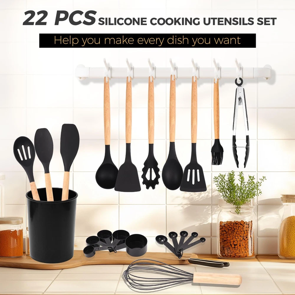 22 SILICONE COOKING UTENSILS SET: Utensil Set includes everything you need to cook that perfect dish, includes Spatula, colander, strainer, scraper, spatula, strainer, oil brush, egg beater, food tongs, pasta grabber, soup spoon, tube, measuring cup (set of 5), measuring spoon (set of 5). HIGH QUALITY MATERIALS: Made of food-grade silicone+Wooden handle, BPA-free, can use in any type of food. And it will probably last longer than the other plastic kitchen utensils. Note: It must be soaked for half an hour when it is used for the first time, and then exposed to the air for about 3 hours, the original smell of silica gel will disappear.This silicone cooking utensils does not react with food or beverages, you don’t have to worry about the health of your families will not retain odors or colors. HIGH TEMPERATURE RESISTANCE: The silicone cooking utensils can withstand temperatures up to 446°F/230°C, even if they are used in a high-temperature frying environment, they will not melt or produce smoke. The wooden handle feels comfortable prevents heat transfer, so you don’t have to worry about scalding the chef’s hands. Silicone head protect your pans, keep the cookware surface not scratched or dented. Extend the life of all your kitchen pans. EASY TO CLEAN AND STORE: Our silicone utensils set for cooking Due to the wooden handles, these kitchen tools are not dishwasher-friendly, but any remaining dirt can be rinsed right out in seconds, and the small holes on the wooden handles allow you to hang them up for storage without taking up too much space. STRONG AND DURABLE: Our wooden kitchen utensils are stronger, ensuring no wear and tear from daily use. Designed not to bend, break or rust, and full of flexibility. Molded in one piece, without any gaps to catch food. Anti-scratch silicone head pairs perfectly with your expensive non-stick pans, pots and bakeware.