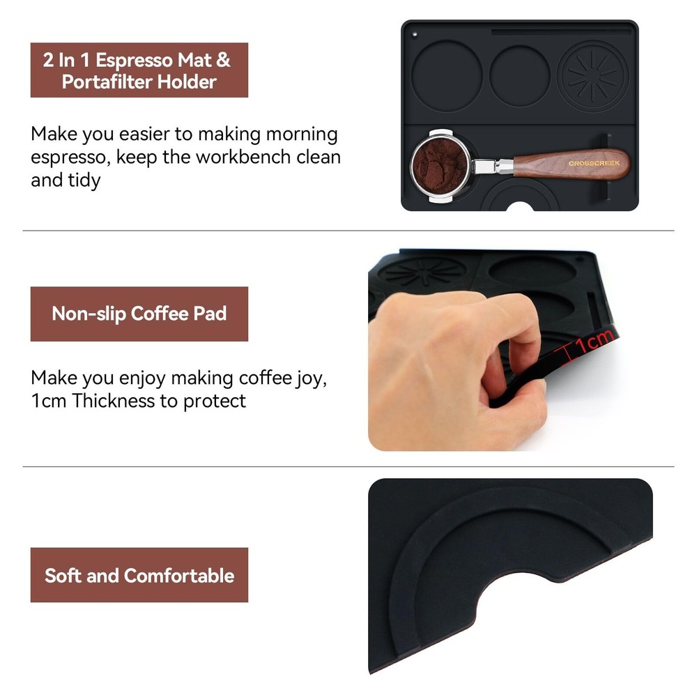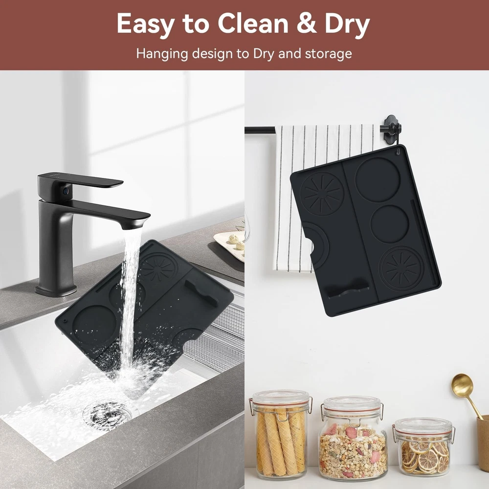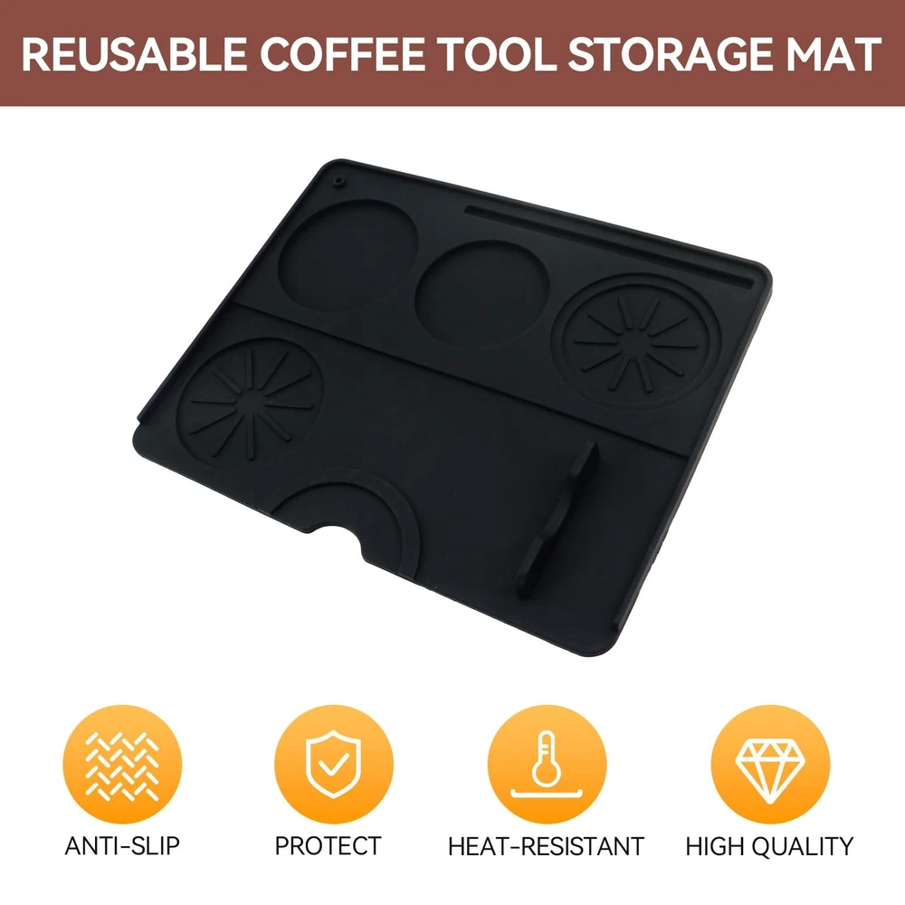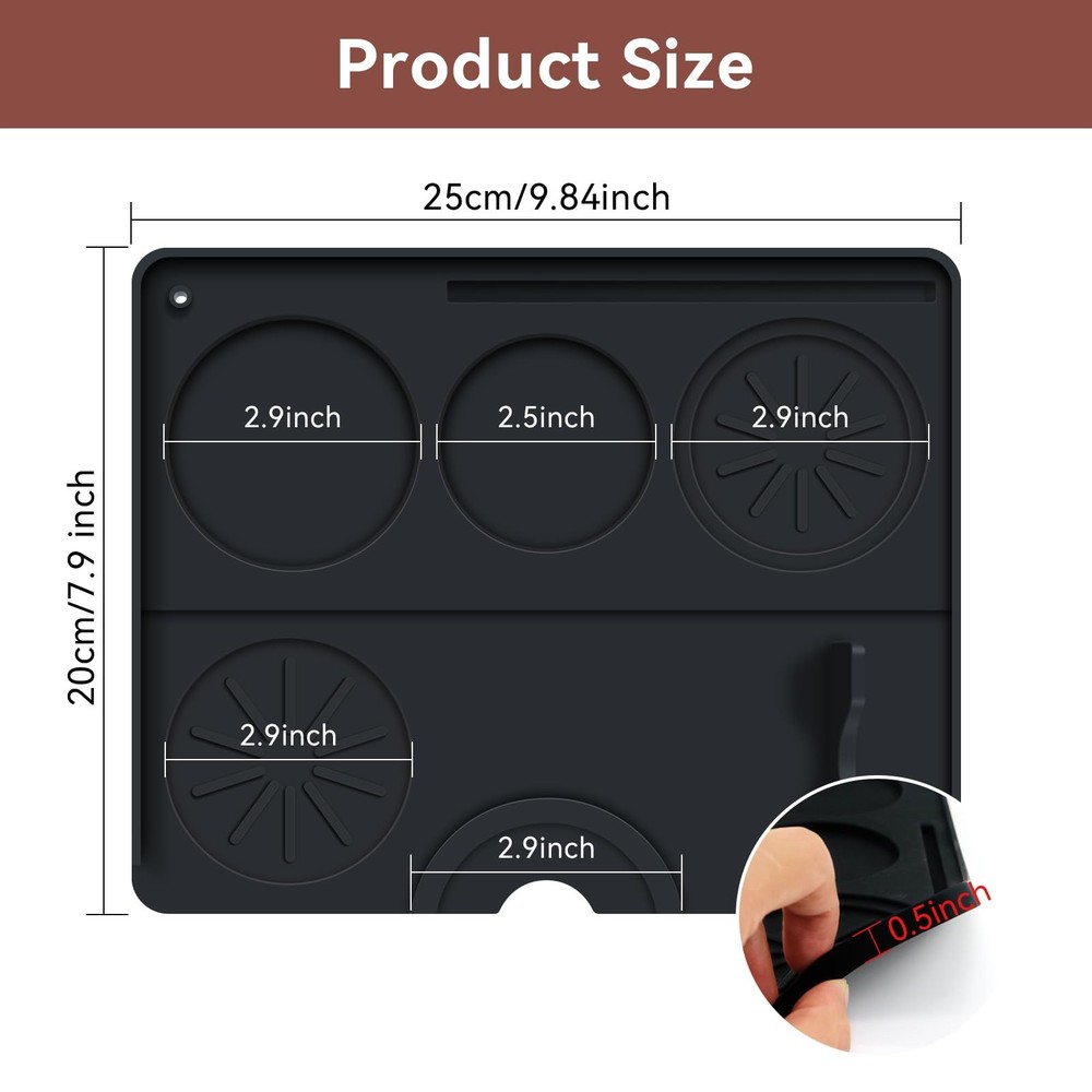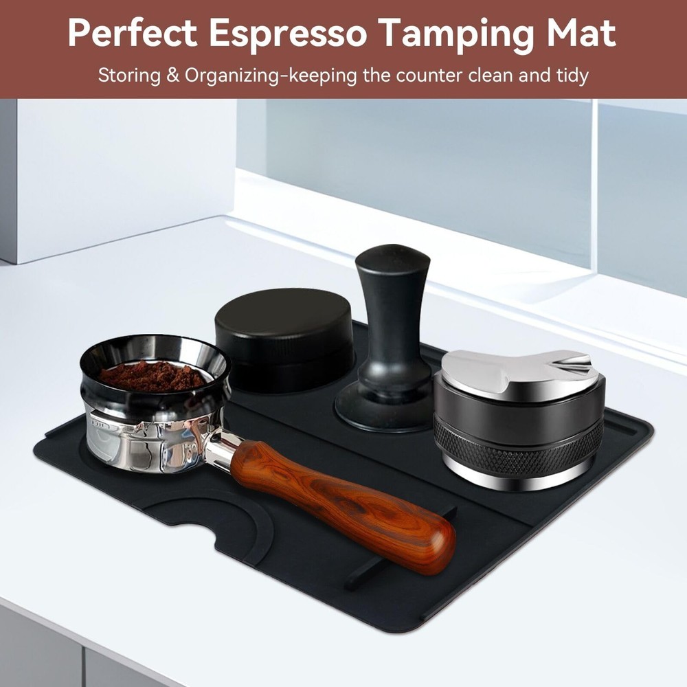 Descriptions: As a espresso enthusiast if you are looking for simple, practical and effectively coffee tamper mat, this non-slip base-4 fluted round holes will meet your need. 2 in1 espresso-making and storage mat made of silicone, is waterproof, soft, comfortable, easy to clean and dry. Storage and production in one, make you enjoying to making espresso every day. Size: 20cm/7.9inch x 25cm/9.84 inch Material: Silicone Color: Black Package: 1 x Espresso Tamping Mat Simple and Efficiently: Espresso mat made of high quantity silicone, non-slip bottoms designed, 4 fluted round holes to store tamper and coffee beads-keep it from sliding, this will save time, make you easier controlled to make morning espresso, collecting and organizing espresso accessories, maintaining a clean and orderly workspace Perfect size: Espresso mat for counter (25cm/9.84inch x 20cm/7.9inch), offer espresso tamper a nice place to sit, 1cm thickness to protect counter, keep the tamping tool to steady Solid & Waterproof Tamper Mat: Great mat for organizing tools, small and cozy allows to easily tamp espresso, without damaging countertop and helps with cleanup from any coffee grounds that spilled. small and compact size convenient to stored Easy to Clean & Dry: Washing off residue is a breeze, only take the coffee mat cleaning under the faucet, coffee mat’s upper right has a small hole to hanging dry and convenient to storage. Easy-to-clean espresso machine mat makes espresso-making to be a joy, enhance coffee-making experience Small and Comfortable: Espresso tamping mat thicker and sturdier, it's nicely instore with spots for portafilter, tamper, and coffee distributor. It also includes 4 nice grooves for holding the portafilter steady while tamping the coffee. It's ease of use makes preparing espresso cleaner, more streamlined process