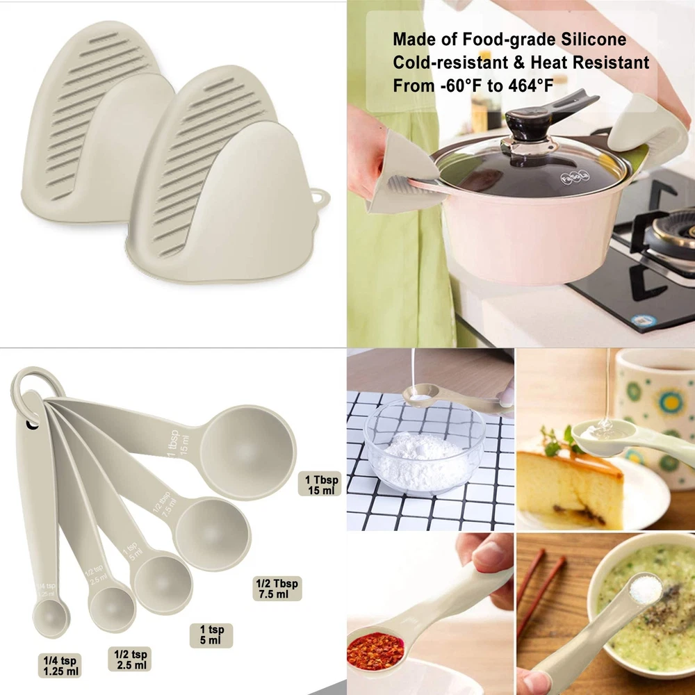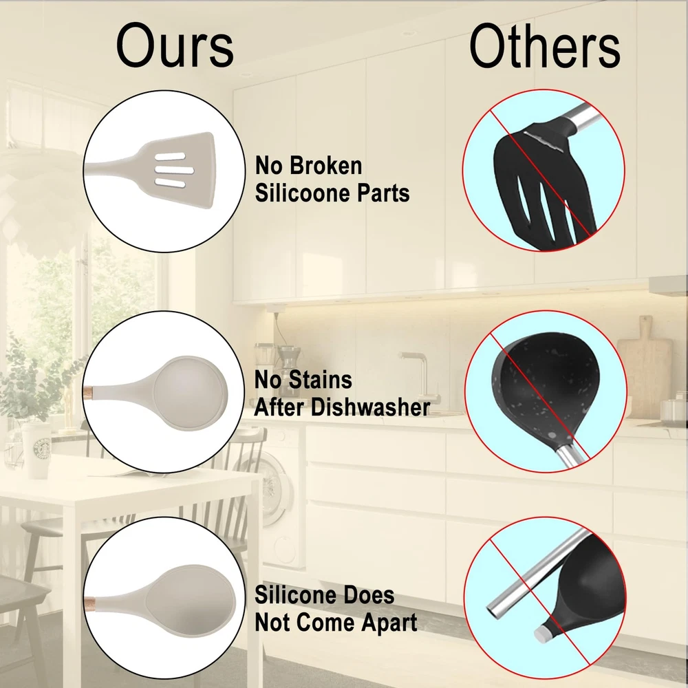 【19pcs Premium Kitchen Utensils Set】Silicone kitchen utensils set includes 12pcs cooking tools that will suit all your cooking and baking needs. Our silicone kitchen utensil set includes: Tong, Whisk, Basting Brush, Slotted Spoon, Slotted Turner, Pasta Server, Spoon, Spatula, Round Spatula, Solid Turner, Soup Ladle.Also come with the gift of 5pcs small Measuring Spoons of different sizes and 2pcs Silicone Mini Gloves all are in gold color. 【Heat-resistant & Non-stick & Non-Toxic】Our silicone kitchen utensils set use food grade silicone which are super heat resistant up to 464°F/240°C.The high heat tolerance of the silicone heads prevents the utensil from melting when exposed to heat. Kitchen utensils are also non-stick and non-toxic,easy to use and store. Only the basting brush silicone head and wooden handle are designed to be detachable, it can be put back at any time without affecting the use and easy to clean. 【Safe Cooking Utensils for Kitchen】Our kitchen tools are made of high quality thermoplastic silicone heads designed to protect the surface of precious non-stick cookware. silicone is safe to use for any type of food .The kitchen utensil set does not react with food or beverages, or produce any hazardous fumes. 【Solid Wooden Handle to Prevent Burns】This cooking utensils set combination of silicone head and wooden handle, the wooden cookware handle is ergonomically designed for comfortable grip, does not transfer heat to protect your hands and provide protection against rust. 【Easy Storage with Holder】Our silicone kitchen utensils set comes with a plastic holder for convenient storage organization. Each wooden handle has a practical hanging hole for wall hanging using hooks.