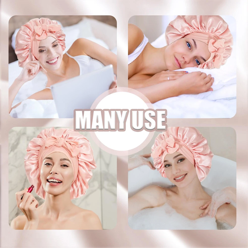 Pink Bonnet Satin Silk Hair Bonnet With Tie Band for Sleeping Large Bonnets Hair Wrap with Adjustable Straps Hair Sleep Caps for Women Curly Braid Hair [Size]: The pink bonnet size is adjustable. Under normal conditions, the diameter is 15.7 inches, suitable for people with a head circumference 19-24 inches. [Double layer material]: The satin bonnet is designed with double-layer fabric can wrap the hair well, and after using the hair mask, it will not stain the sheets when sleeping. [Silk material]: The soft silk bonnet material is used to fit the skin, there will be no inappropriate places, and the texture is soft enough to make it comfortable to use anyway. [Applications]: This adjustable bonnet can be used to wrap the hair while sleeping so that it will not be messy, and it can also protect the hair from getting wet when taking a bath. [Multifunctional]: This sleep bonnet Can also be worn during makeup, bathing, housework