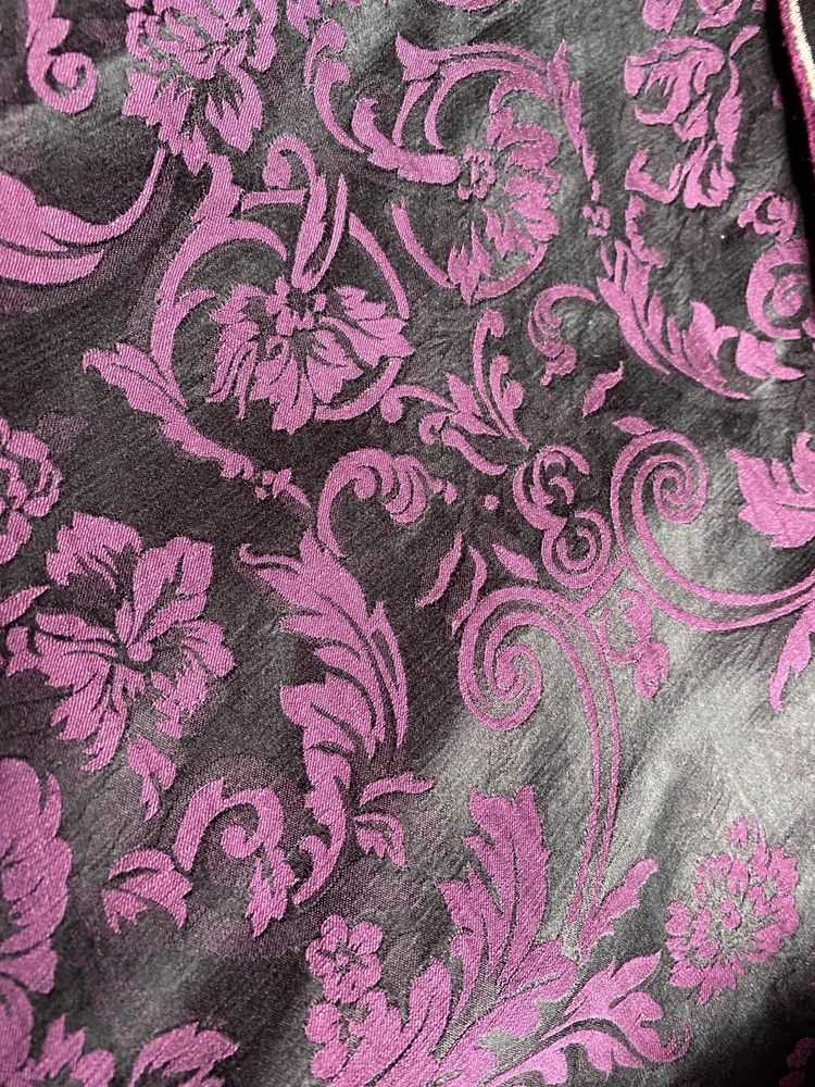 60% silk, 40% linen All natural fiber brocade fabric Beautifully textured Heavy 42 momme One of a kind Width: 44 inches Sold by half yard Thickness: 42 momme. Color: purple/black. Can be reversible. Please check photos for exact color. They were taken under different lighting. Care instruction: dry clean highly recommended. absolutely gorgeous! stunning!! One of a kind fabrics for your creative projects. From a smoke free environment