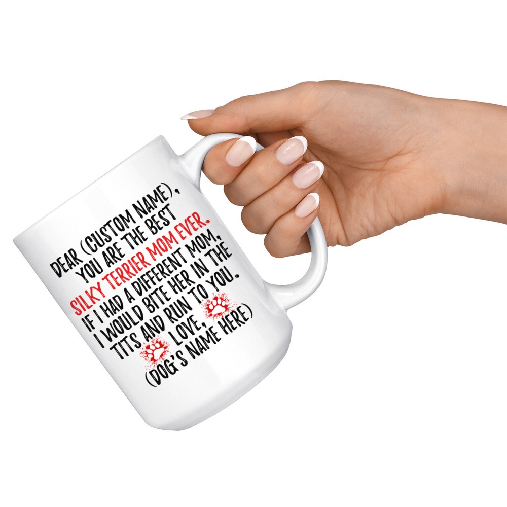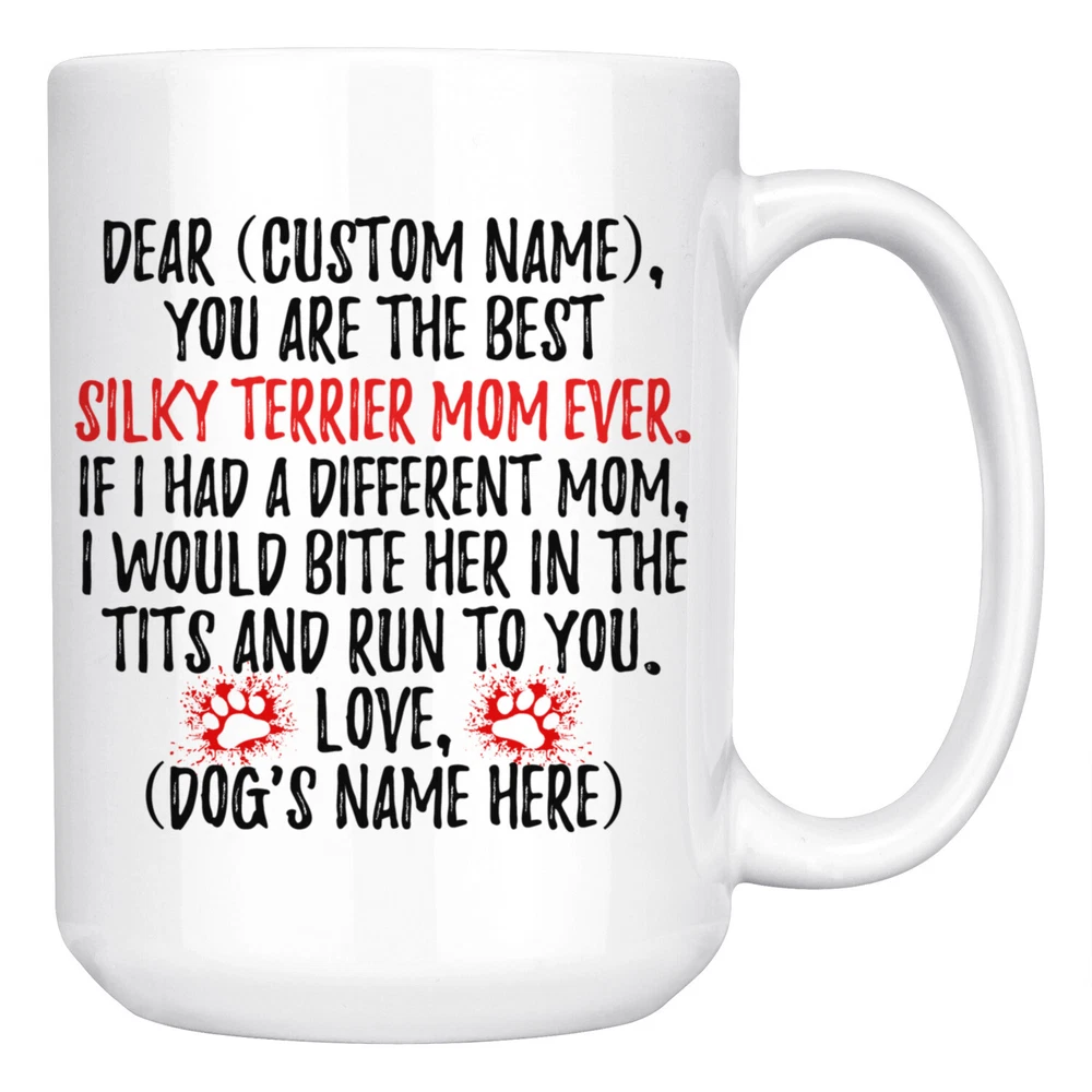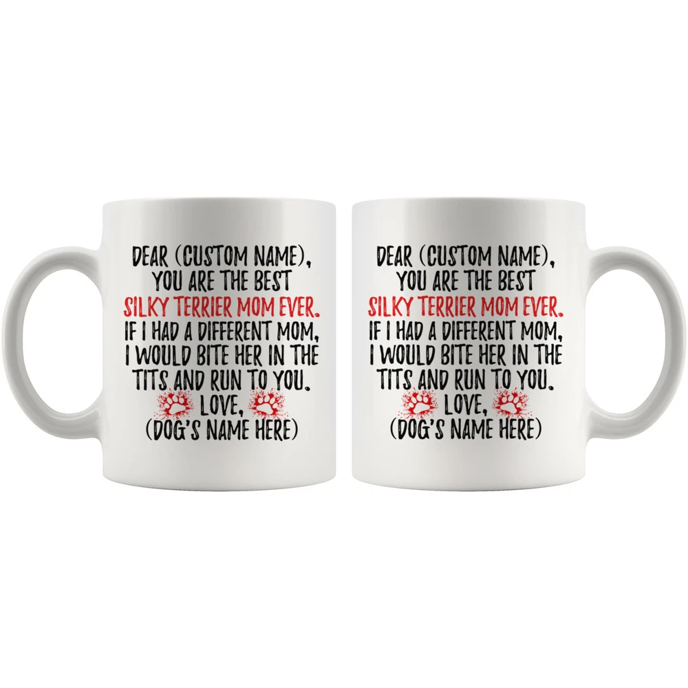 personalized silky terrier mug, sydney silky coffee mug, australian silky terrier dog gifts, silky terrier mom present gift, silky terrier mommy mug, silky terrier owner mug, i love silky terrier, custom silky terrier gift, dog coffee cup, mothers day gift This is the perfect coffee mug with content "DEAR 'CUSTOM NAME', YOU ARE THE BEST SILKY TERRIER MOM EVER. IF I HAD A DIFFERENT MOM, I WOULD BITE HER IN THE TITS AND RUN TO YOU. LOVE, 'DOG'S NAME HERE' ". CUSTOM MOM'S NAME AND DOG'S NAME Please put the mom's name and dog's name in the notes at the checkout or send us a message. By not doing this, it will delay your order. Example: Mom's Name: Mary; Dog's name: Charlie PERFECT FUNNY GIFT FOR A SILKY TERRIER DOG MOM! This special coffee cup can be a great gift for every Silky Terrier mom. DISHWASHER AND MICROWAVE SAFE! This version of ceramic mug shows it's true colors with quality assurance to withstand heat in the microwave and put it in the dishwasher as many times as you like, the quality will not be Altered. THE MUG DESIGN IS PRINTED ON BOTH SIDES! No matter if you hold your teacup in your right or left hand, you and everyone else will be able to see this unique design. Looking at this cute coffee mug will put a smile on everyone's face! We want you to be 100% satisfied, so please let us know if there is anything wrong with your order so we can fix it right away.
