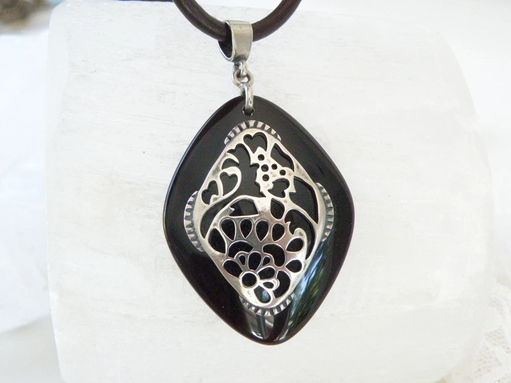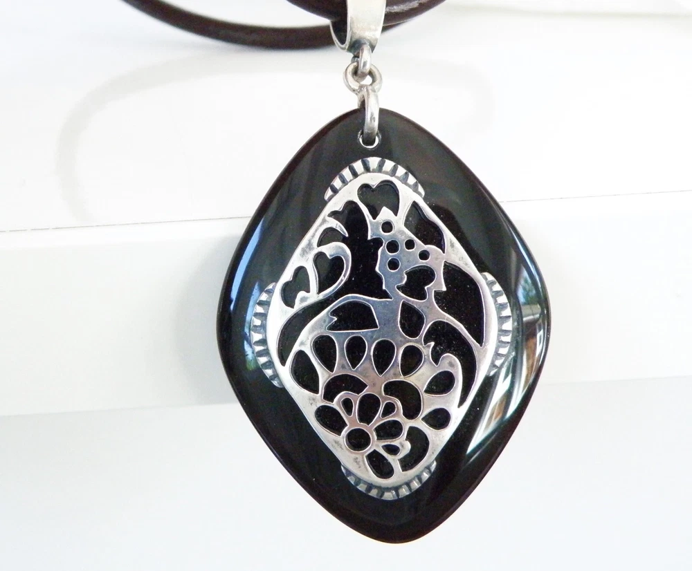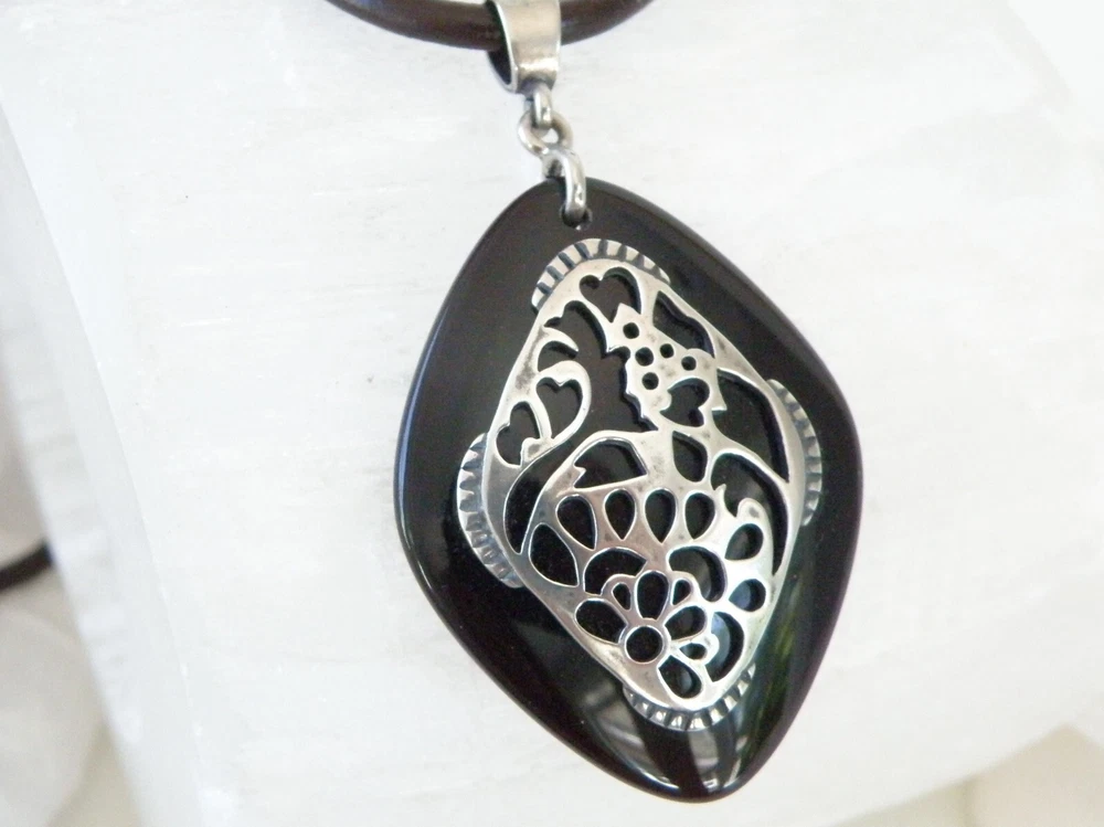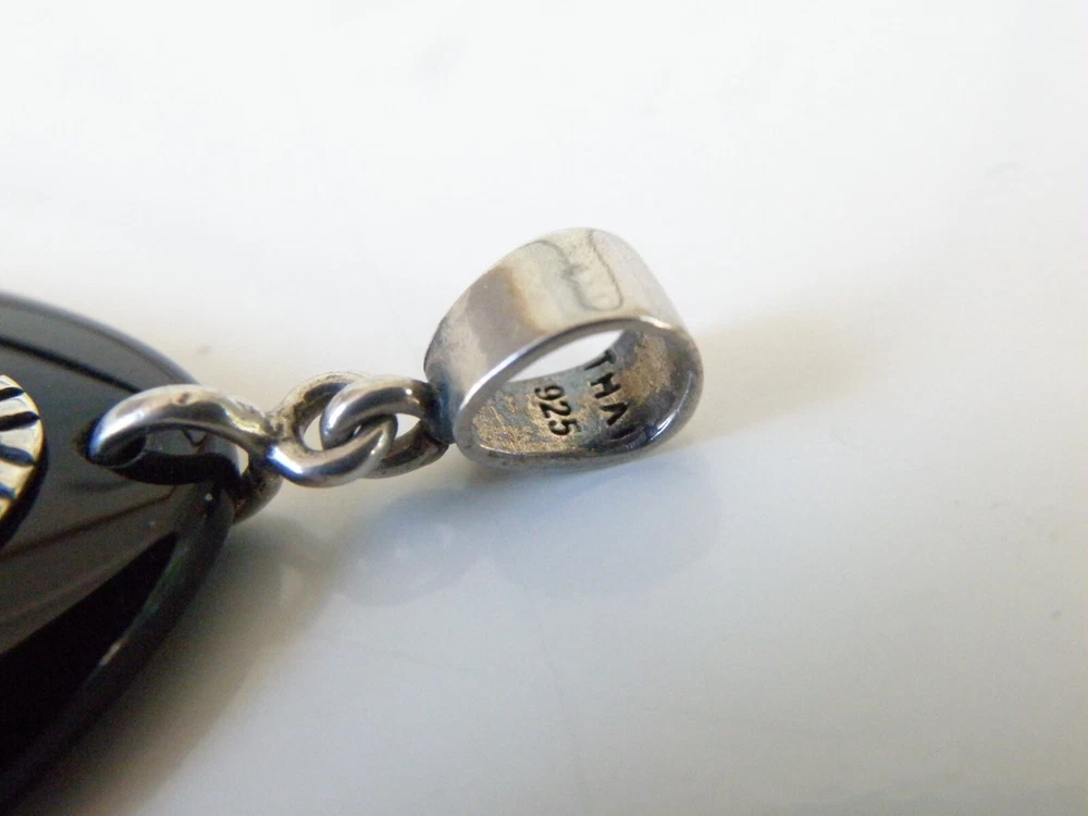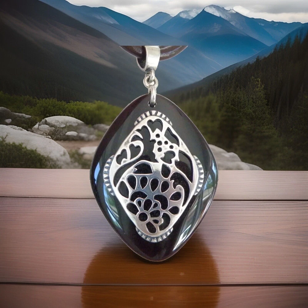 Beautiful Silpada Sterling Silver Black Pendant Perfect gift for someone special or for yourself. Please review all pictures, shipping/return details, listing details, and ask any questions before buying. I added the necklace - I believe it is leather. It is not sterling silver or Silpada. Measures approx. 2.28" with the bail x 1.28" widest. Necklace is approx. 18" long Marked for sterling silver and silpada inside the bail. Necklace is not marked Weight 18.4 grams combined