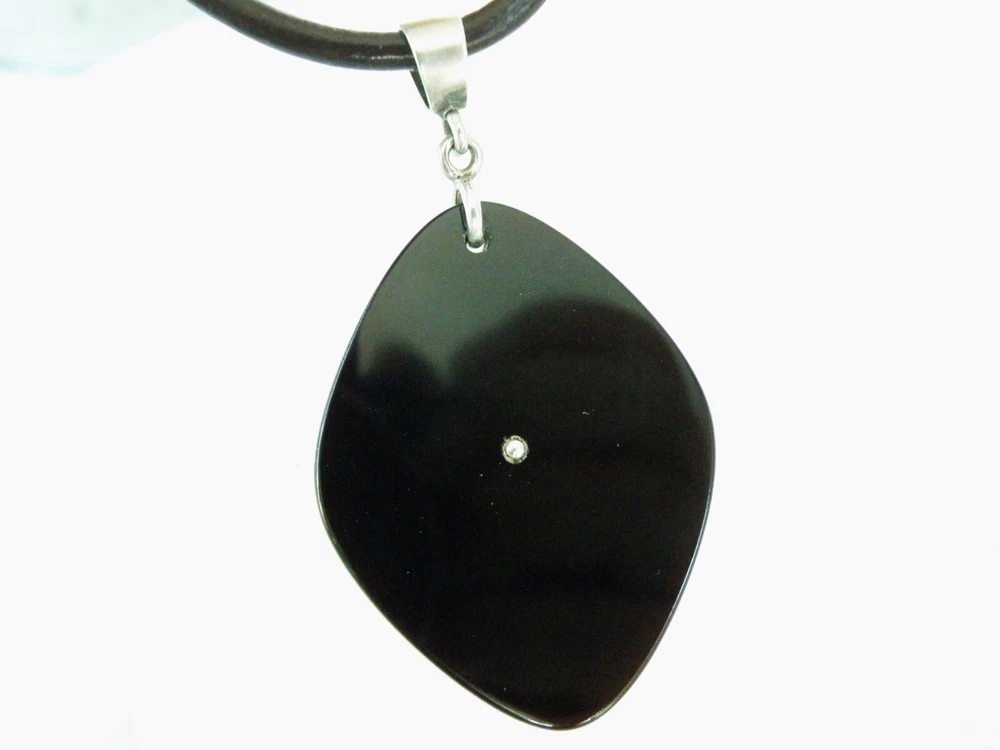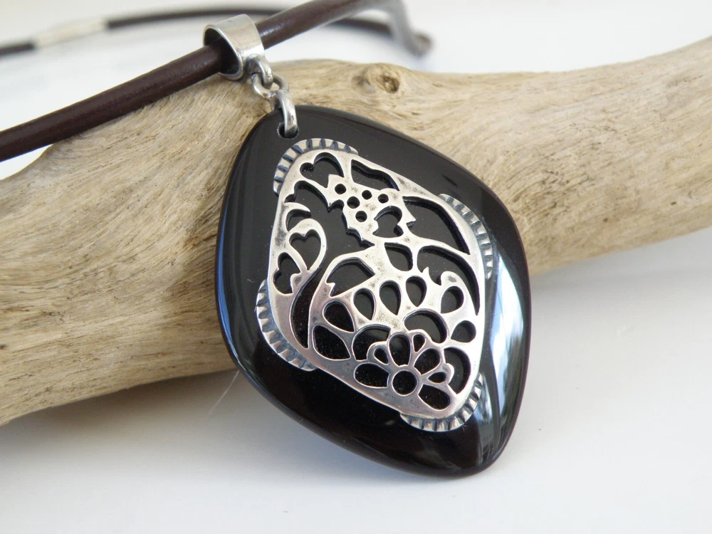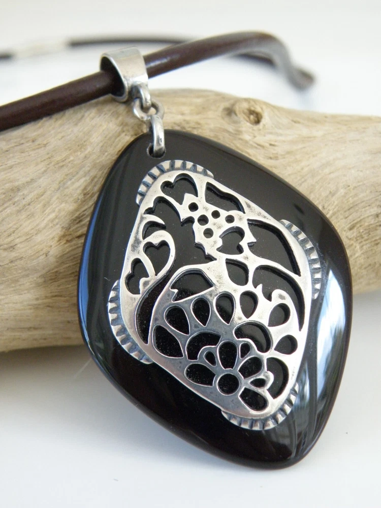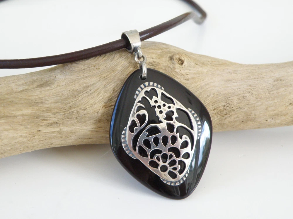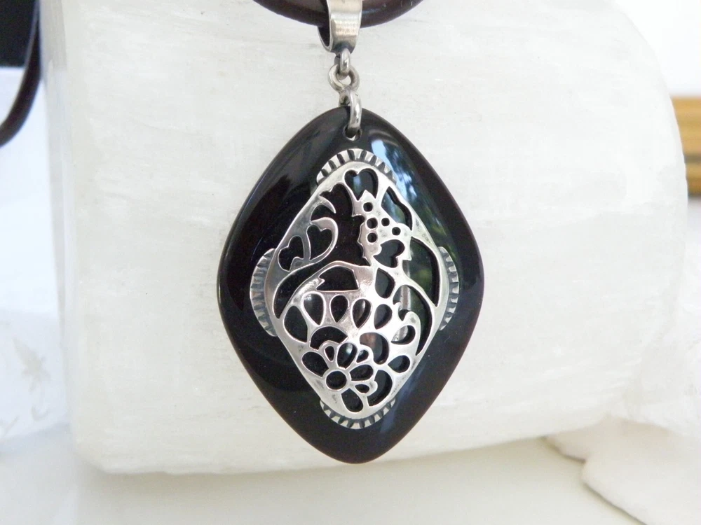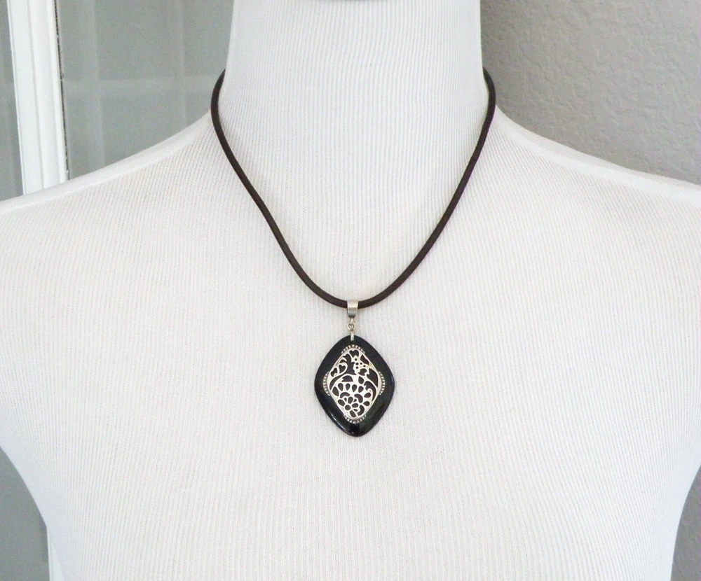 Beautiful Silpada Sterling Silver Black Pendant Perfect gift for someone special or for yourself. Please review all pictures, shipping/return details, listing details, and ask any questions before buying. I added the necklace - I believe it is leather. It is not sterling silver or Silpada. Measures approx. 2.28" with the bail x 1.28" widest. Necklace is approx. 18" long Marked for sterling silver and silpada inside the bail. Necklace is not marked Weight 18.4 grams combined