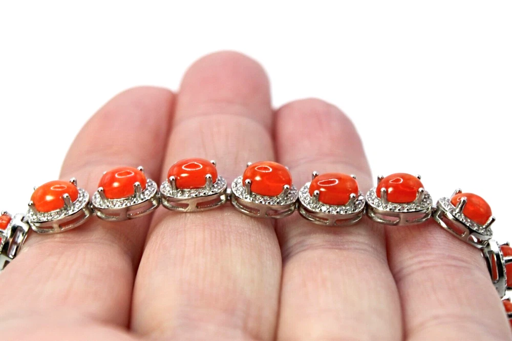 Solid sterling silver 925 stamped white gold coated bracelet featuring genuine natural mined oval cabochon orange fire opal gemstones each measuring 7mm x 5mm each individaully set within a border of 1mm x 1mm bright white round cut faceted lab created zircon stones. The bracelet measures 16.5 to 21.5cm 6 1/2 inches but can be fastened up to 8 1/2 inches using the integral extender chain. Total weight 14g / 9.48 carats GIFT BOXED Thanks for looking and please take time to view my other listings #18063