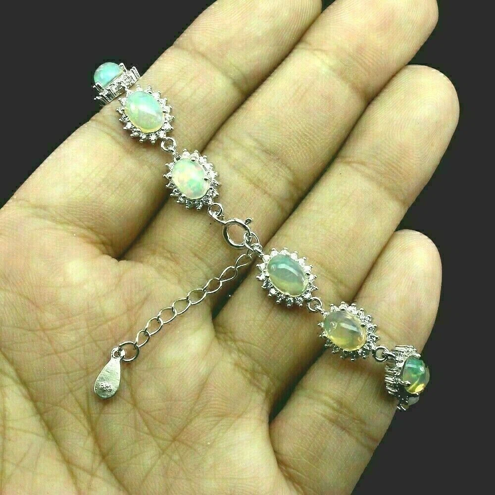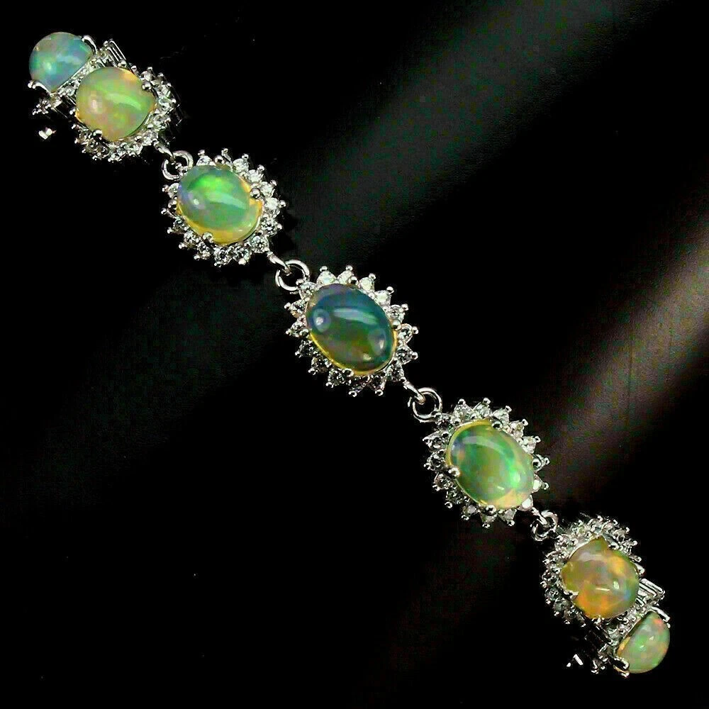 Solid sterling silver 925 stamped gold coated bracelet featuring genuine natural mined oval cabochon african opal gemstones with fire luster within each measuring 7mm x 5mm each individually set within a border of 1mm x 1mm bright white round cut faceted lab created zircon stones. The bracelet measures 16.5 to 19.6cm 6 1/2 to 7 3/4 inches using the integral extender chain. Total weight 16g / 7.9 carats GIFT BOXED Thanks for looking and please take time to view my other listings #14902