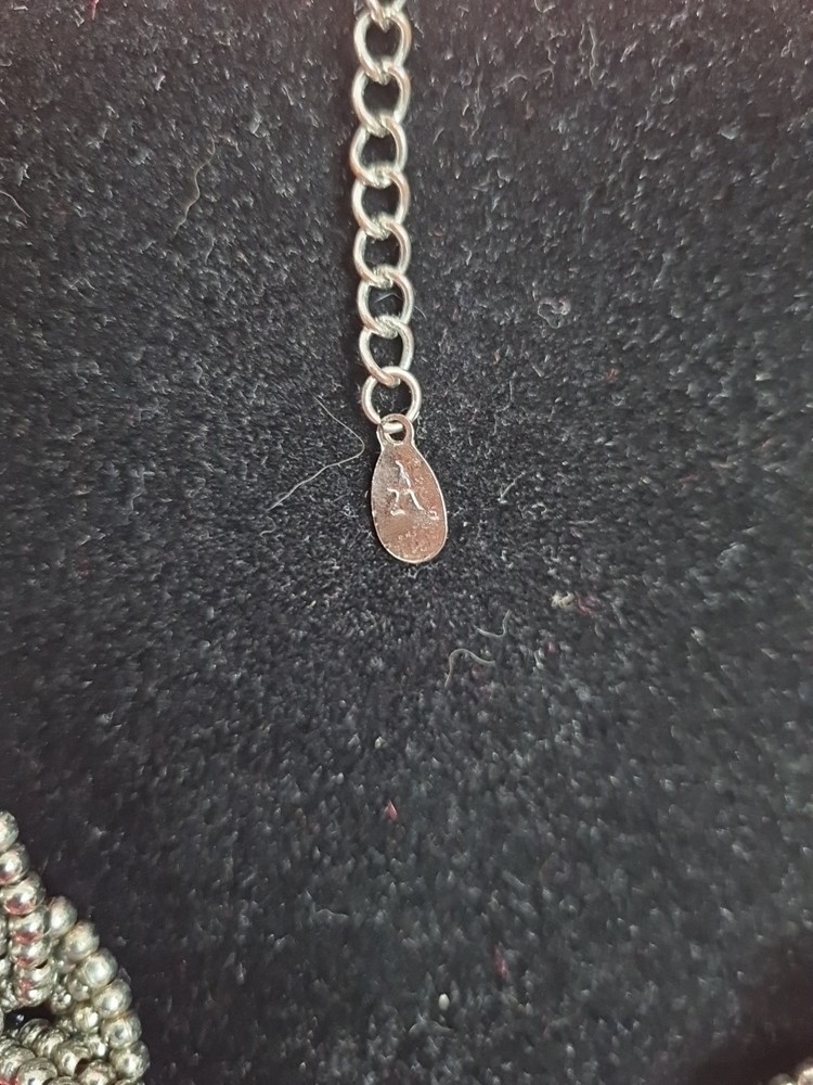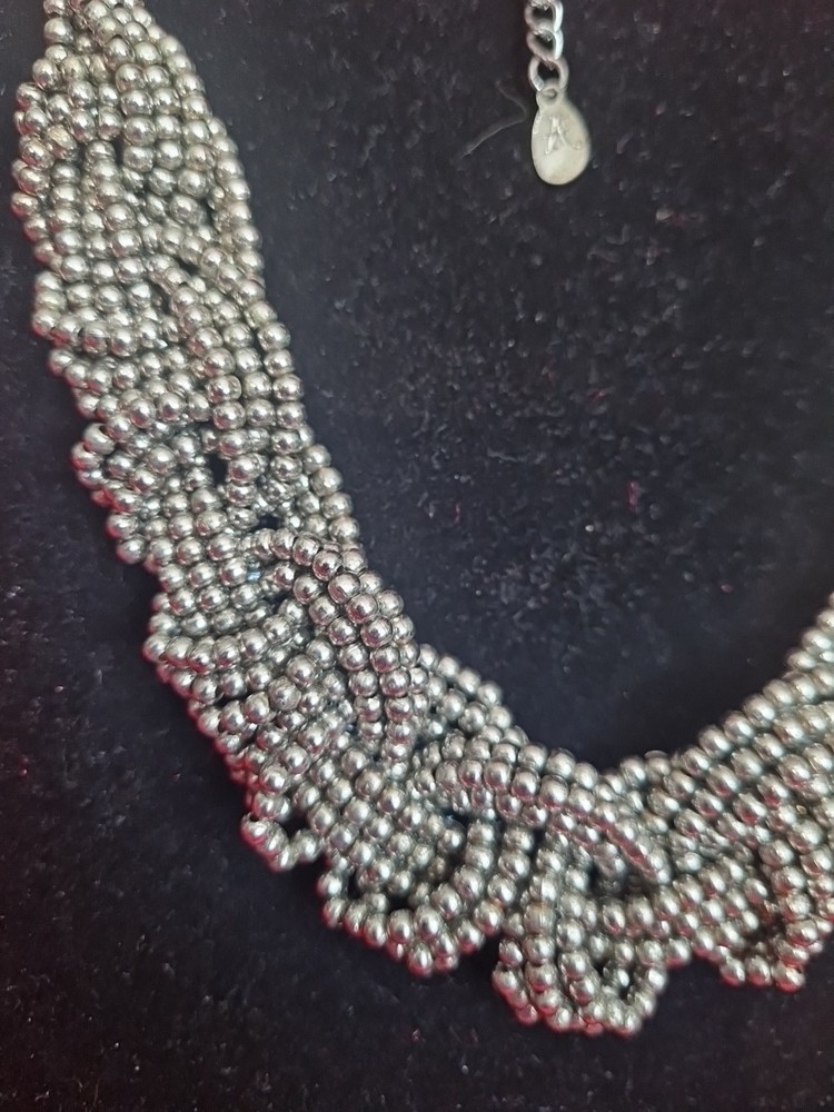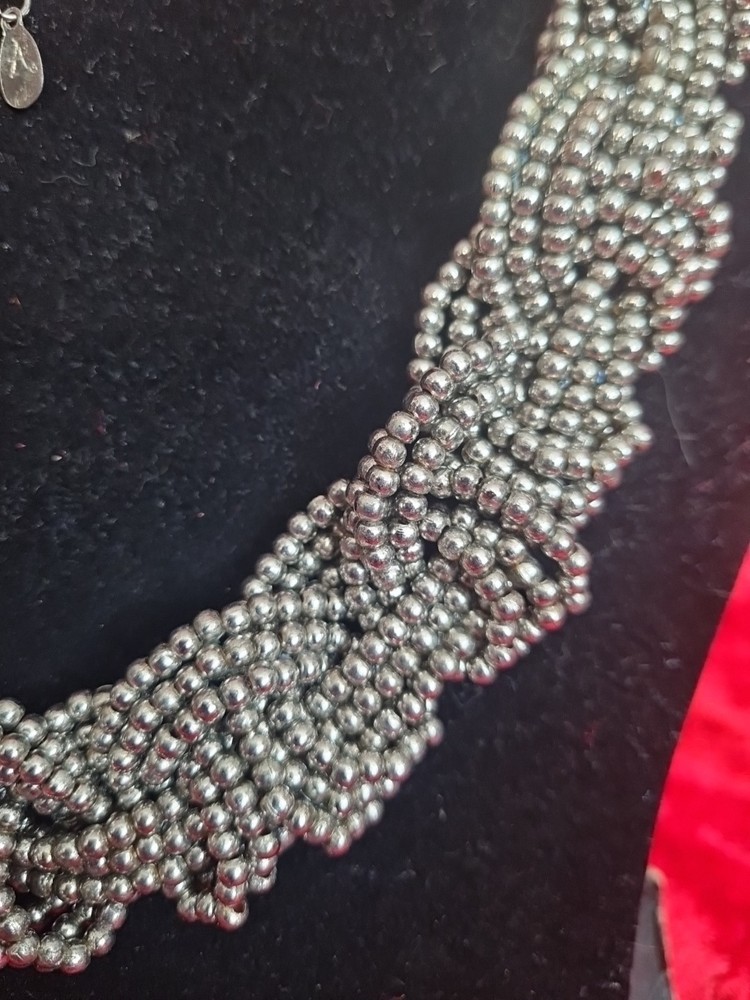 A lovely chunky necklace by Accessorize. If is made of six strands of metal beads knotted in threes to create this stunning look. It measures c.50cm in length so hangs at c.25cm when closed. The length is adjustable to a degree as there are extra links you can close on.