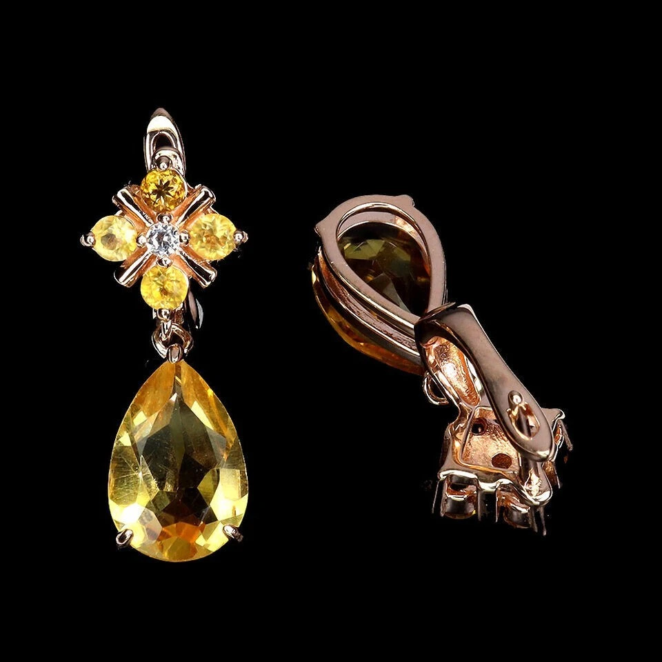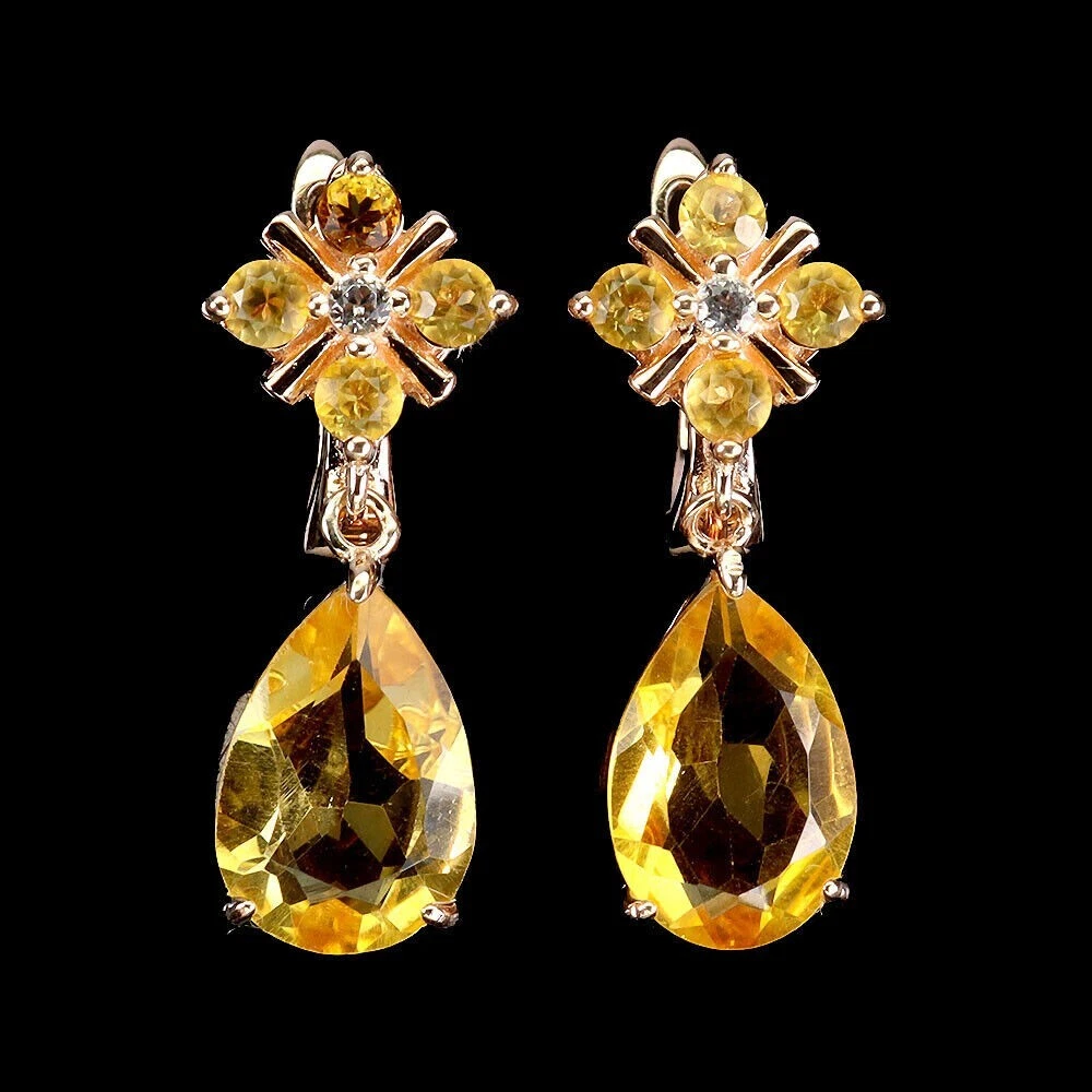 Solid sterling silver 925 stamped rose pink gold coated earrings featuring pear and round cut faceted genuine natural mined golden citrine gemstones each measuring from 3mm x 3mm to 12mm x 8mm set with bright white round cut faceted lab created stones each measuring 1.5mm x 1.5mm. The earrings measure 25mm x 10mm, have a leverback fastening and weigh 3g each. GIFT BOXED Thanks for looking and please take time to view my other listings #18081