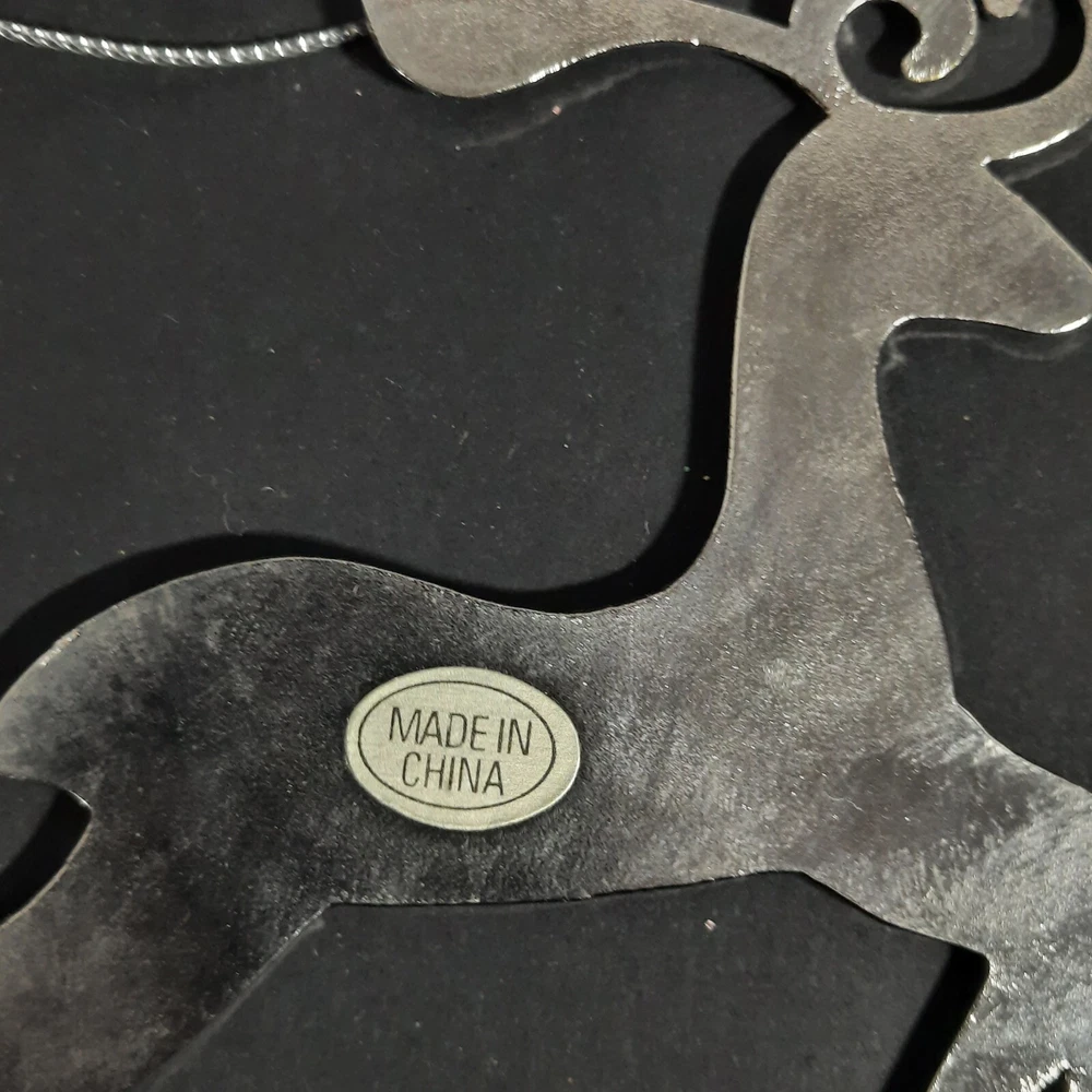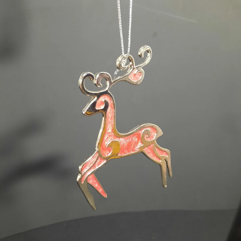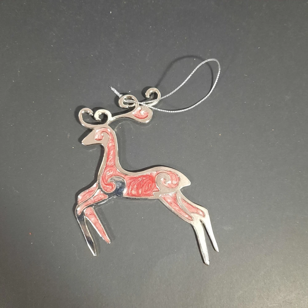 This reindeer ornament is a sophisticated addition to holiday decor. Featuring a sleek silver outline with pink enamel detailing, it provides an elegant touch to any Christmas tree. • Silver outline with pink enamel detailing • Hanging string included • Made in China