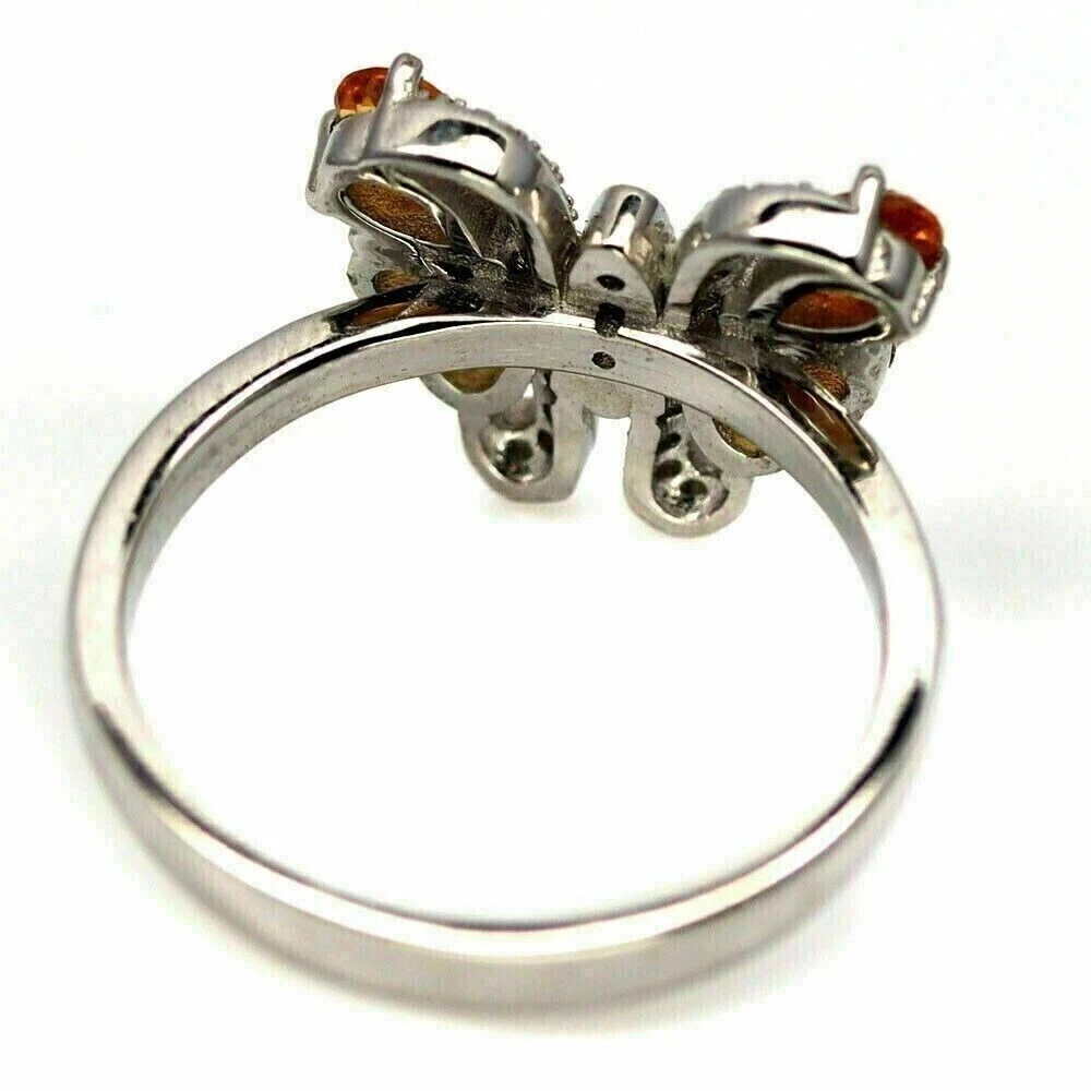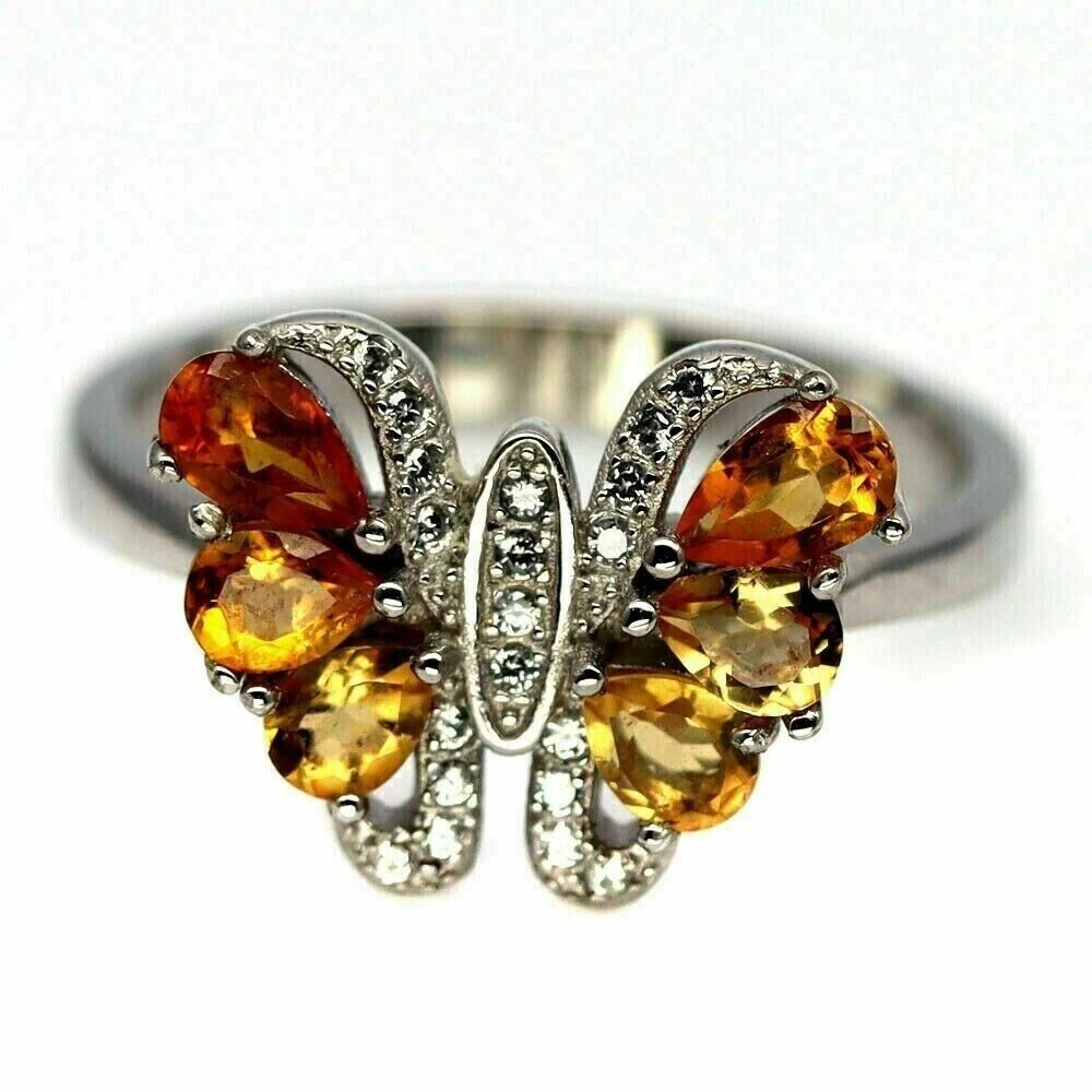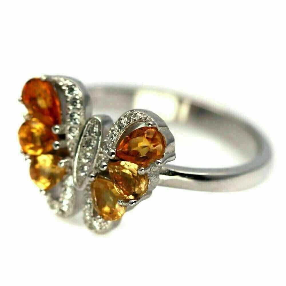 Solid sterling silver 925 stamped white gold coated ring featuring pear cut faceted genuine natural mined golden citrine gemstones each measuring 5mm x 3.5 mm and 4.5mm x 3.5mm set within a butterfly design set with round cut faceted bright white lab created zircon stones each measuring 1mm x 1mm and 1.2mm x 1.2mm . The face of the ring measures 16mm x 13mm and it is a size P (US 7.75). GIFT BOXED Thanks for looking and please take time to view my other listings #16514