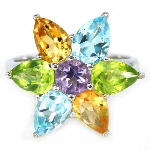 Solid sterling silver 925 stamped white gold coated ring featuring a central genuine natural mined round cut faceted purple amethyst gemstone measuring 5mm x 5mm surrounded by genuine natural mined pear cut faceted 7mm x 5mm green peridot, golden citrine and heated blue topaz gemstones. The face of the ring measures 20mm x 20mm and it is a size O (US 7.25). GIFT BOXED Thanks for looking and please take time to view my other listings #4796
