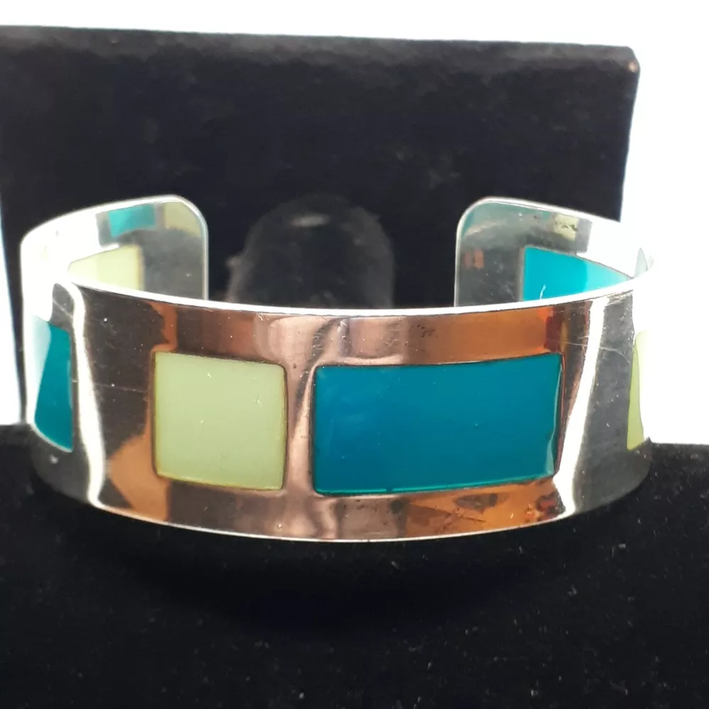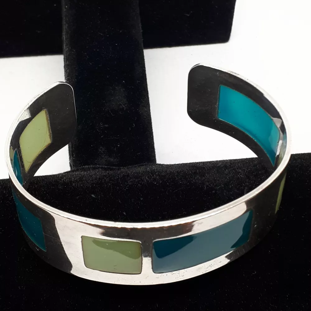 Silver Tone Bracelet Cuff Art Deco Style with Resin Inset Green and Yellow Silver Plated This art deco style bracelet was tarnished when I found it, and cleaned up nicely with silver polish. I do not know if the color pieces are resin or Bakelite. Unknown maker, no mark. The Bracelet opening is 1-1/4" wide. Bracelet width 2-1/4" Height is 1-3/4" Ships FAST from Canada with Tracking Canada to USA shipping is direct, usually within 4 to 7 mail days Note: C refers to Canadian Price and US refers to US price for US buyers, (as the exchange rate is in your favor). We take extra care in packaging to ensure safe arrival of your item. All parcels are shipped with tracking so that you can monitor the shipment progress and delivery. Please Follow Our Store for Updated Weekly Items . ** Have a Great Day! Happy Holidays! USA buyers save with currency exchange on purchase.We ship UPS, Canada Post and Fedex as postage requires. Thank you for being a valued customer!