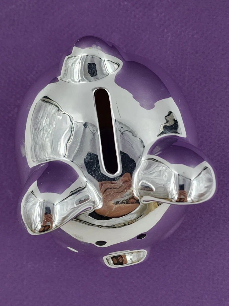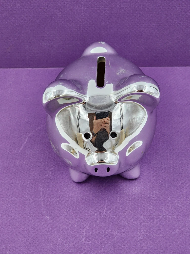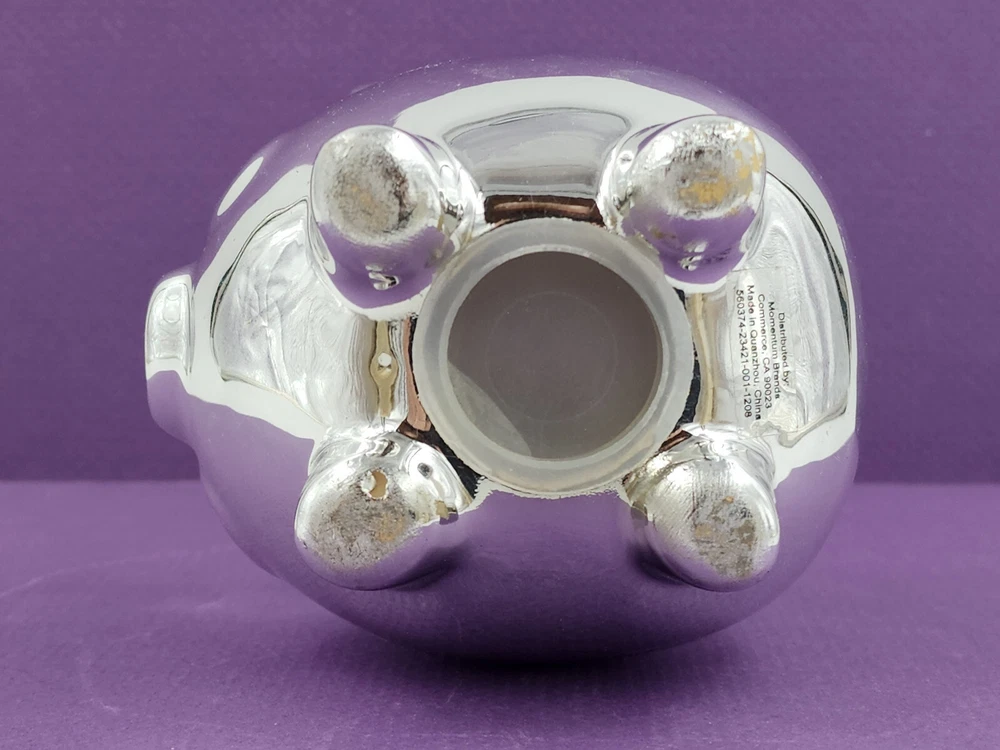 Silver Tone Metal Piggy Coin Bank 4x4" W/Plug Momentum Brands Good pre-owned piggy bank. Minor use/handling marks noted. See photos for condition detail. Great way to encourage young children to save or for the piggy bank collector!