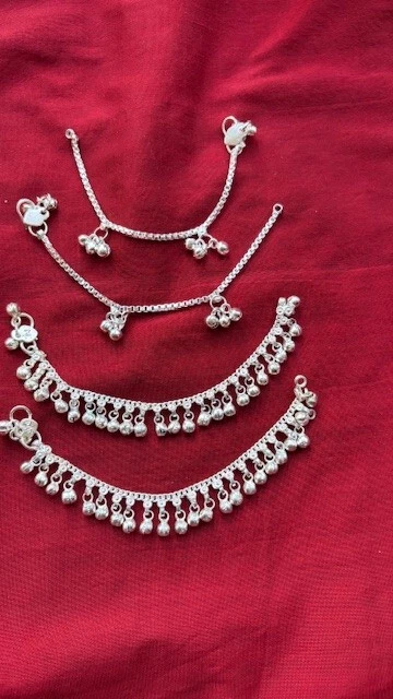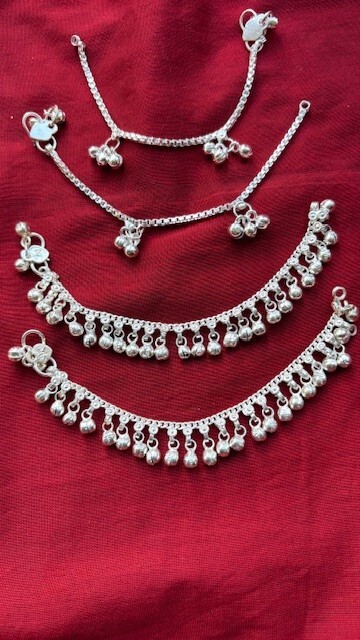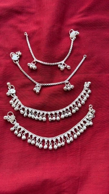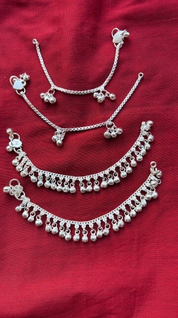 Absolutely adorable and well-crafted! These tiny silver anklets with delicate bells are perfect for little ones—lightweight, comfortable, and so charming. The traditional design adds a sweet touch, and the 6" size fits perfectly. Comes as a set of two, making it great for gifting or keeping a spare. Love the authentic Indian craftsmanship!