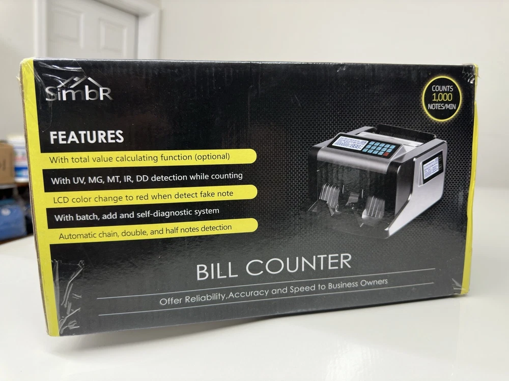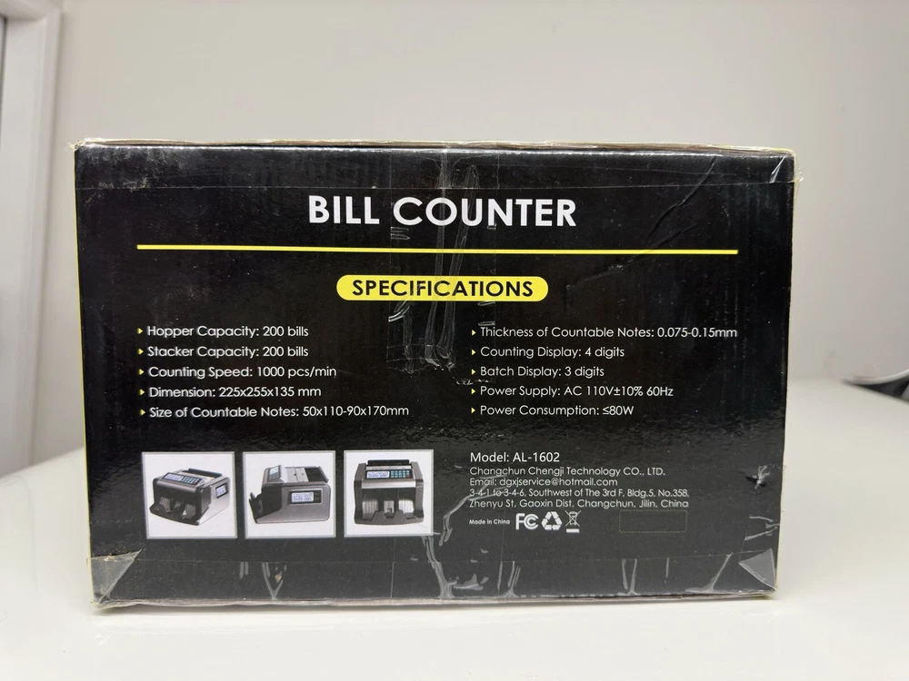 ### Bill Counter Description The Simbr Bill Counter is designed to provide reliability, accuracy, and speed for business owners. This advanced machine comes with a variety of features and specifications to ensure efficient and accurate counting of bills. #### Features: - **Total Value Calculating Function (Optional)**: Allows for the calculation of the total value of counted bills. - **Detection Capabilities**: Equipped with UV (Ultraviolet), MG (Magnetic), MT (Magnetic Thread), IR (Infrared), and DD (Dimension Detection) detection to identify counterfeit notes while counting. - **LCD Display**: The LCD changes color to red when a fake note is detected. - **Batch, Add, and Self-Diagnostic System**: Facilitates batch counting, adding up totals, and performing self-diagnostics for efficient operation. - **Automatic Detection**: Automatically detects chain, double, and half notes to prevent counting errors. - **Counting Speed**: The machine can count up to 1,000 notes per minute, enhancing productivity. #### Specifications: - **Hopper Capacity**: 200 bills - **Stacker Capacity**: 200 bills - **Counting Speed**: 1,000 pieces per minute - **Dimensions**: 225 x 255 x 135 mm - **Size of Countable Notes**: 50 x 110 - 90 x 170 mm - **Thickness of Countable Notes**: 0.075 - 0.15 mm - **Counting Display**: 4 digits - **Batch Display**: 3 digits - **Power Supply**: AC 110V ± 10%, 60Hz - **Power Consumption**: < 80W #### Model Details: - **Model**: AL-1602 - **Manufacturer**: Changchun Chengji Technology Co., LTD. - **Contact**: dgxservice@hotmail.com - **Address**: 3-4-1 to 3-4-6, Southwest of the 3rd F, Bldg 5, No. 358, Zhenyu St, Gaoxin Dist, Changchun, Jilin, China. - **Certifications**: CE, FCC, RoHS This bill counter is a valuable asset for any business requiring rapid and reliable counting of currency, ensuring accuracy and security with its advanced detection systems.