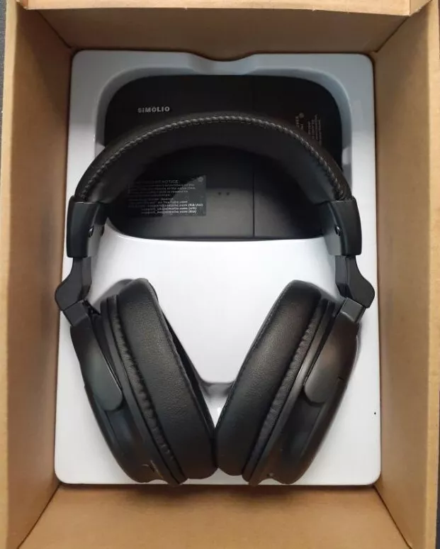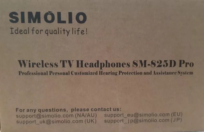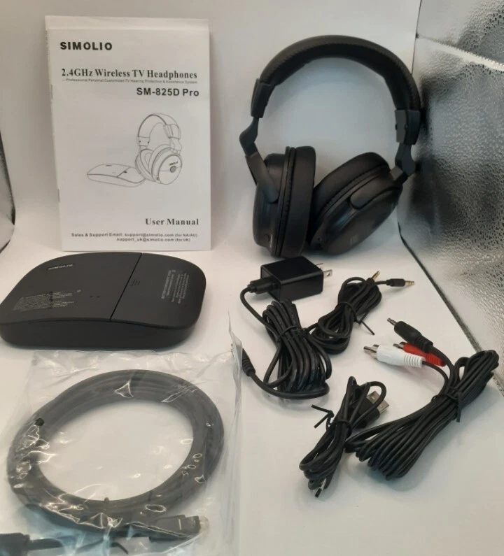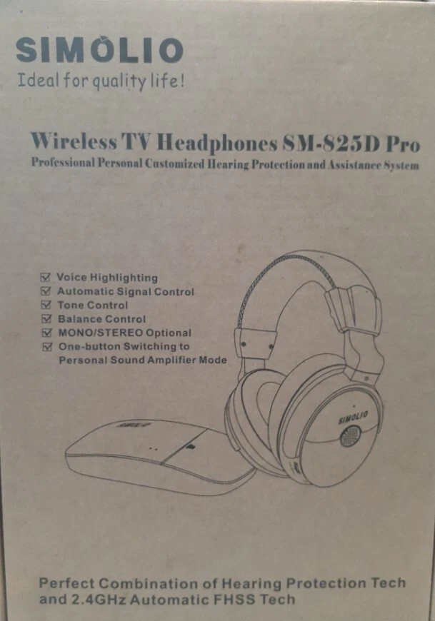Simolio ASM-825D PRO Wireless TV Headphones with Clear Dialog Mode. Enhanced Voice Control for Seniors Hard of Hearing. Enjoy your favorite programs in healthy & clear sound. NEW in Box. Voice Enhancement No Audio Lag Automatic Signal Control Tone Optional (Treble/Normal/Bass) Balance Adjustment. One Button Push Long Range Up to 100ft.