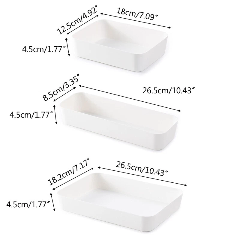 Features: combination: It can be combined and at will, reasonably allocated and stored, and the space is neat and orderly without being messy. Three sizes: Three kinds of specifications for storage, light stacking to release space. Wide use: Wide of use, can store office stationery, socks, cosmetics and more,refreshing countertop. Premium material: High-quality PP material, thick, anti-drop, wear-resistant and durable. Smooth and no burr: The corners are rounded and smooth for a comfortable feel. Specification: Material: PP Optional sizes: S/for M/L S: approx.18x12.5x4.5cm/7.09x4.92x1.77in M: approx.26.5x8.5x4.5cm/10.43x3.35x1.77in L: approx. 26.5x18.2x4.5cm/10.43x7.17x1.77in Color: White Quantity: 1Pc Note: Please allow 0-1cm error due to manual measurement. pls make sure you do not mind before you bid. Due to the difference between different monitors, the picture may not reflect the actual color of the item. Thank you! Package Contents: 1xStorage Box(other accessories in the picture is not included.)
