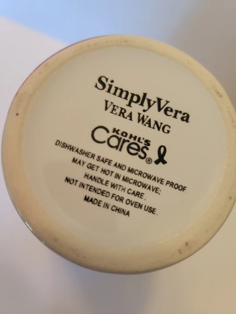 Simply Vera Wang Breast Cancer Awareness Pink Ribbon Ceramic Coffee Mug Tumbler. From Kohls Cares. Hot pink rubber lid and gripper on outside. Nice condition. 6 1/2" high.