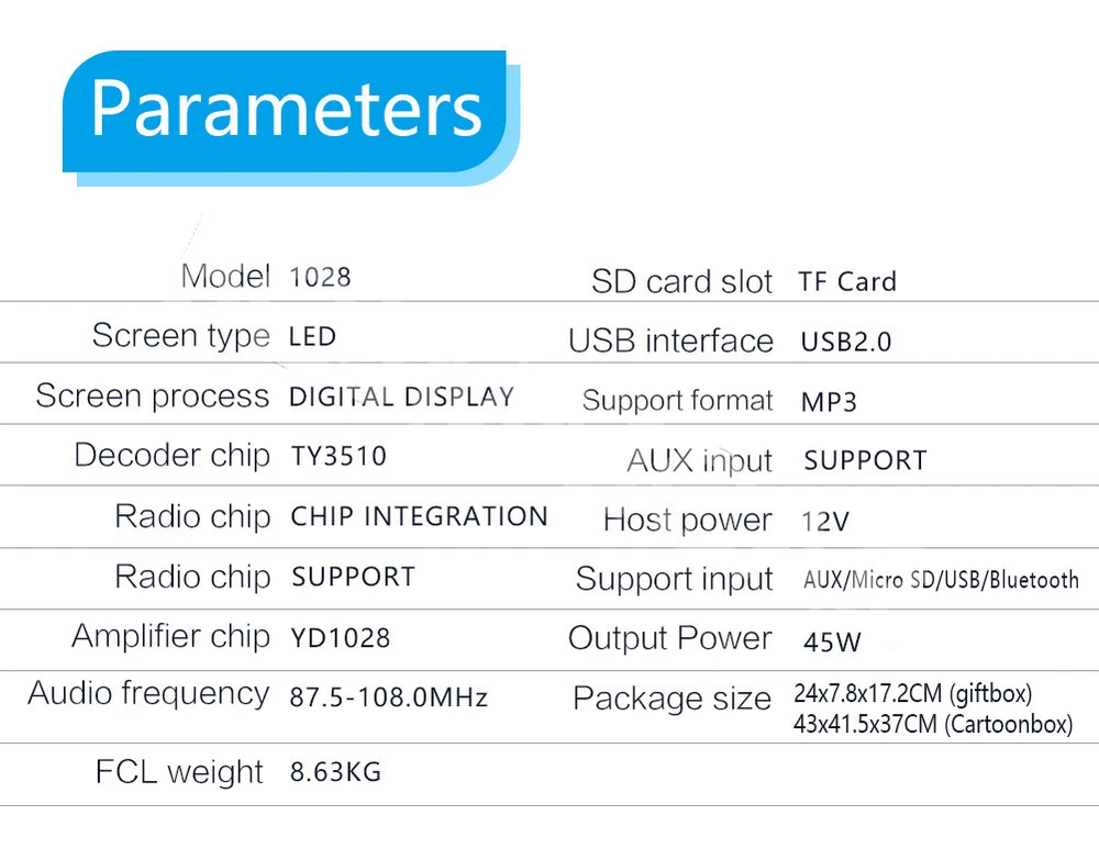Home Payment Shipping About us Contact us Store Categories Store Categories Other Details Car Stereo MP3 Player Bluetooth USB Car AUX FM Radio Auto Receiver Remote Control Multimedia Player Specifications: Bluetooth specification: V2.0 Supports Advanced Audio Distribution Profile Time display function High quality FM Digital Stereo Radio Preset stations (frequency: 87.5-108.0 MHz) USB / SD / Bluetooth / Aux Audio Support: MP3 Mute and strong control L / R RCA audio output jacks Model: 1028, 1030 Remote control battery (Not included): CR2025 3V FM Radio Tuning range: 87.5-108.0 MHz Sensitivity: less than 20 dB Stereo separation: more than 25 dB SNR: more than 60 dB Power supply 12V: 11 - 16V Note: This machine is a 12V machine, not according to the 24V power supply Description: Quiescent current speaker impedance: 4 ohm Frequency response: 20 - 20000Hz Fuse red: 1A yellow: 15A Type: car MP3 player Special Function: FM Radio, Bluetooth, Hands Free Calls, MP3 Player, USB Flash Memory Output power: 4x60W Voltage: 12V Music source: SD card, 3.5mm stereo headphone jack, mobile phone, Flash drive Package includes: 1 x Radio Car 1 Remote control (without battery) 1 x wire cable 1 x Installation Tool Kit 1 x User Manual Shipping Policy Payment Method Returns Policy Shipping Policy Payment Method Returns Policy Home Payment Shipping About us Contact us Home Payment Shipping About us Contact us Store Categories Store Categories Details Car Stereo MP3 Player Bluetooth USB Car AUX FM Radio Auto Receiver Remote Control Multimedia Player Specifications: Bluetooth specification: V2.0 Supports Advanced Audio Distribution Profile Time display function High quality FM Digital Stereo Radio Preset stations (frequency: 87.5-108.0 MHz) USB / SD / Bluetooth / Aux Audio Support: MP3 Mute and strong control L / R RCA audio output jacks Model: 1028, 1030 Remote control battery (Not included): CR2025 3V FM Radio Tuning range: 87.5-108.0 MHz Sensitivity: less than 20 dB Stereo separation: more than 25 dB SNR: more than 60 dB Power supply 12V: 11 - 16V Note: This machine is a 12V machine, not according to the 24V power supply Description: Quiescent current speaker impedance: 4 ohm Frequency response: 20 - 20000Hz Fuse red: 1A yellow: 15A Type: car MP3 player Special Function: FM Radio, Bluetooth, Hands Free Calls, MP3 Player, USB Flash Memory Output power: 4x60W Voltage: 12V Music source: SD card, 3.5mm stereo headphone jack, mobile phone, Flash drive Package includes: 1 x Radio Car 1 Remote control (without battery) 1 x wire cable 1 x Installation Tool Kit 1 x User Manual Shipping Policy Payment Method Returns Policy Shipping Policy All items will be checked before packing. All items are new and of high quality. Item will be shipped within 1 business days upon receipt of payment, excluding weekends and public holidays. If to USA,we will ship your order by USPS,it will take about 2-6 working days to you,and you can track it on line. Payment Method We accept payment by PayPal ! Payment should be completed within 5 days after buyer places the order,or else an unpaid case will be opened in order to cancel the transaction. If you can not pay in time, please contact us. e-check from PayPal will only be processed once the payment clears. All of the items will be shipped to buyer's EBAY address,please confirm your address on Ebay before you buy.Your order will be usually shipped out the same or next business days once the payment is made and cleared. Returns Policy 30-day Warranty with Exchange for defective, malfunctioned, incorrect or parts-missing items. Please notify us and return the item with all parts and accessories packed and marked "FOR EXCHANGE" within 14 days of receipt. If defective, malfunctioned or parts-missing items are no longer available, a refund may be issued. Home Payment Shipping About us Contact us BCSMMCAR