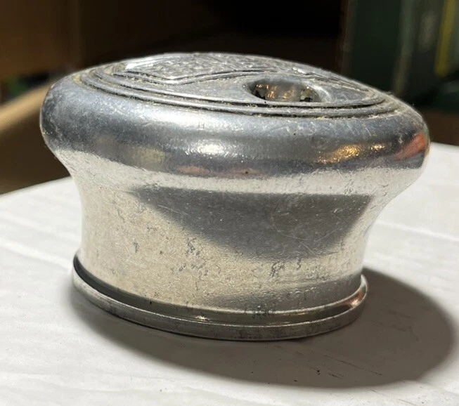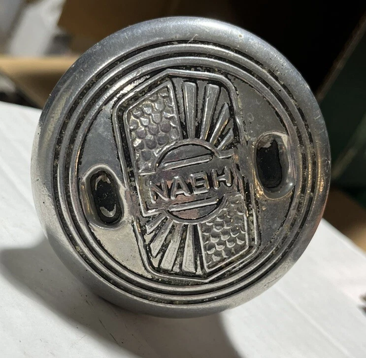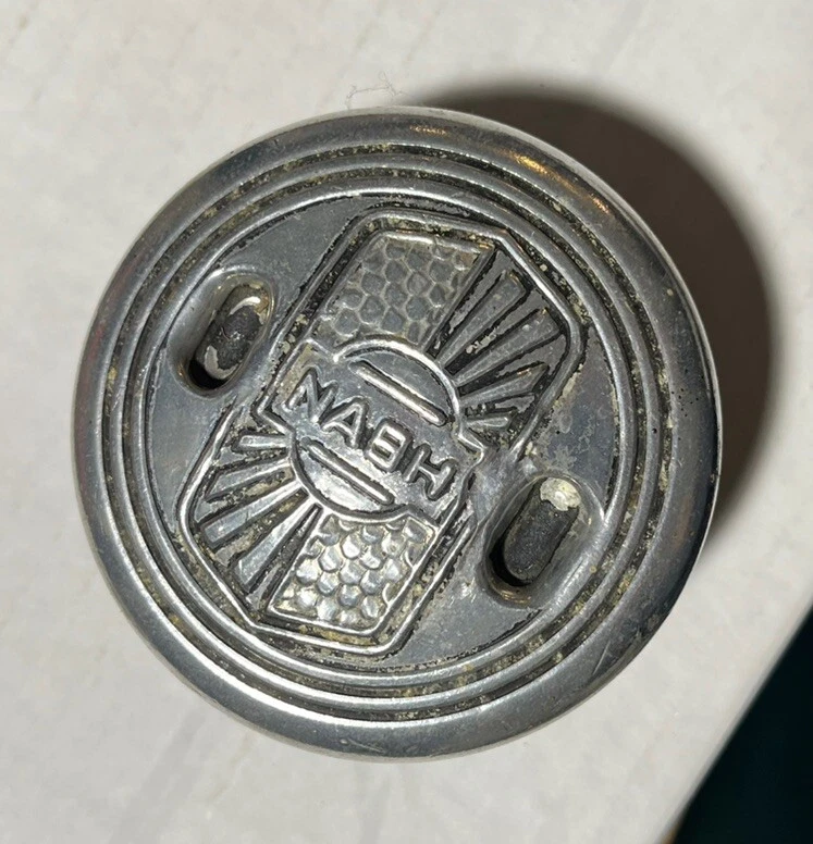 This is a single Nash wheel center cap from the 1920s Brass Era. It is a vintage metal cap with Nash emblem, designed for easy installation on the lower part of the wheel hub. Made in the United States, this silver cap serves as a threaded dust cover and grease cap for a classic Nash vehicle.