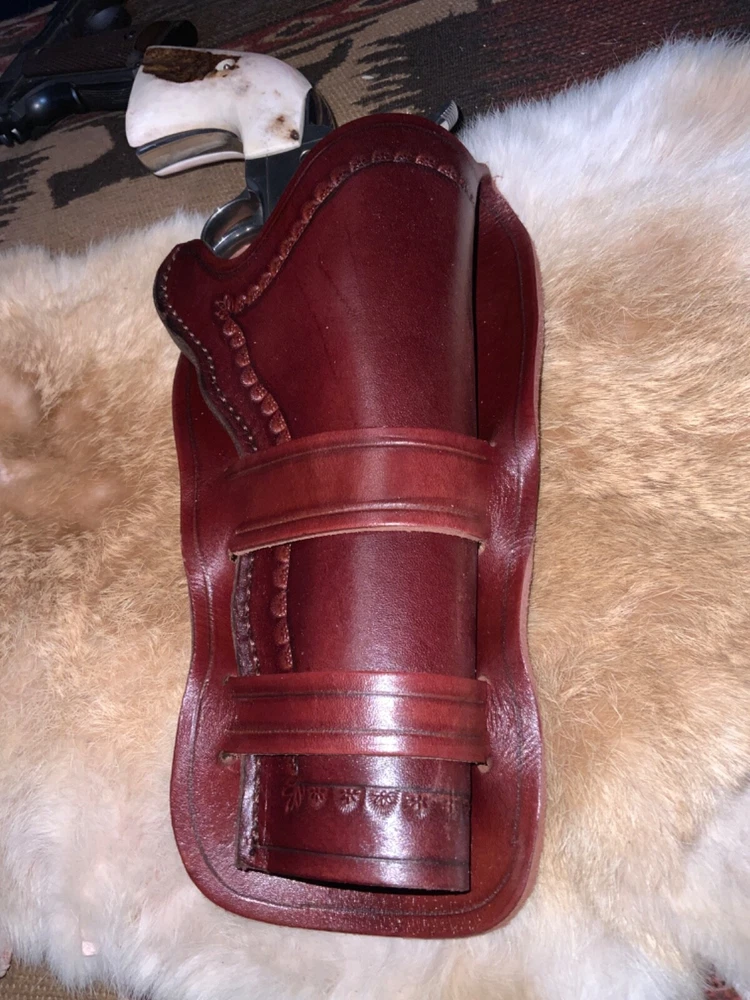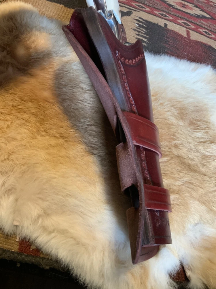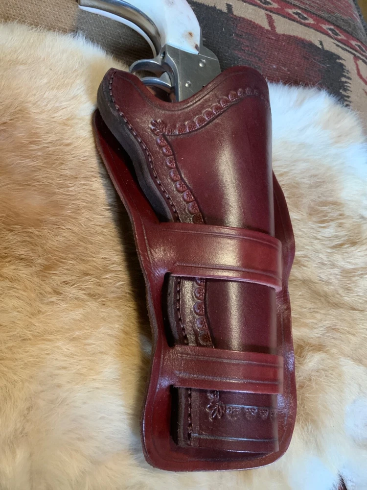 This single action revolver holster by Wylie Leather is the perfect addition to any cowboy or Western enthusiast's collection. Designed for Colt SAA models and the Ruger Vaquero, this holster fits up to a 5 1/2" barrel and features a 3 o'clock carry position with a neutral cant. The holster is made of high-quality mahagony dyed and finished Hermann Oak American leather and is suitable for right-handed individuals. The holster comes in a classic belt (OWB) style and is perfect for hunting or any other outdoor activity. It is manufactured in the United States and is a must-have for any gun owner. Don't miss out on this opportunity to add a Cheyenne Loop Western holster to your collection! Actual holster is shown.