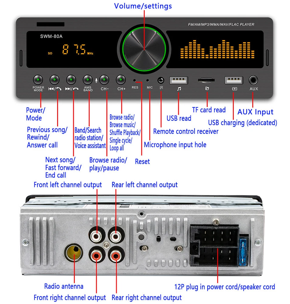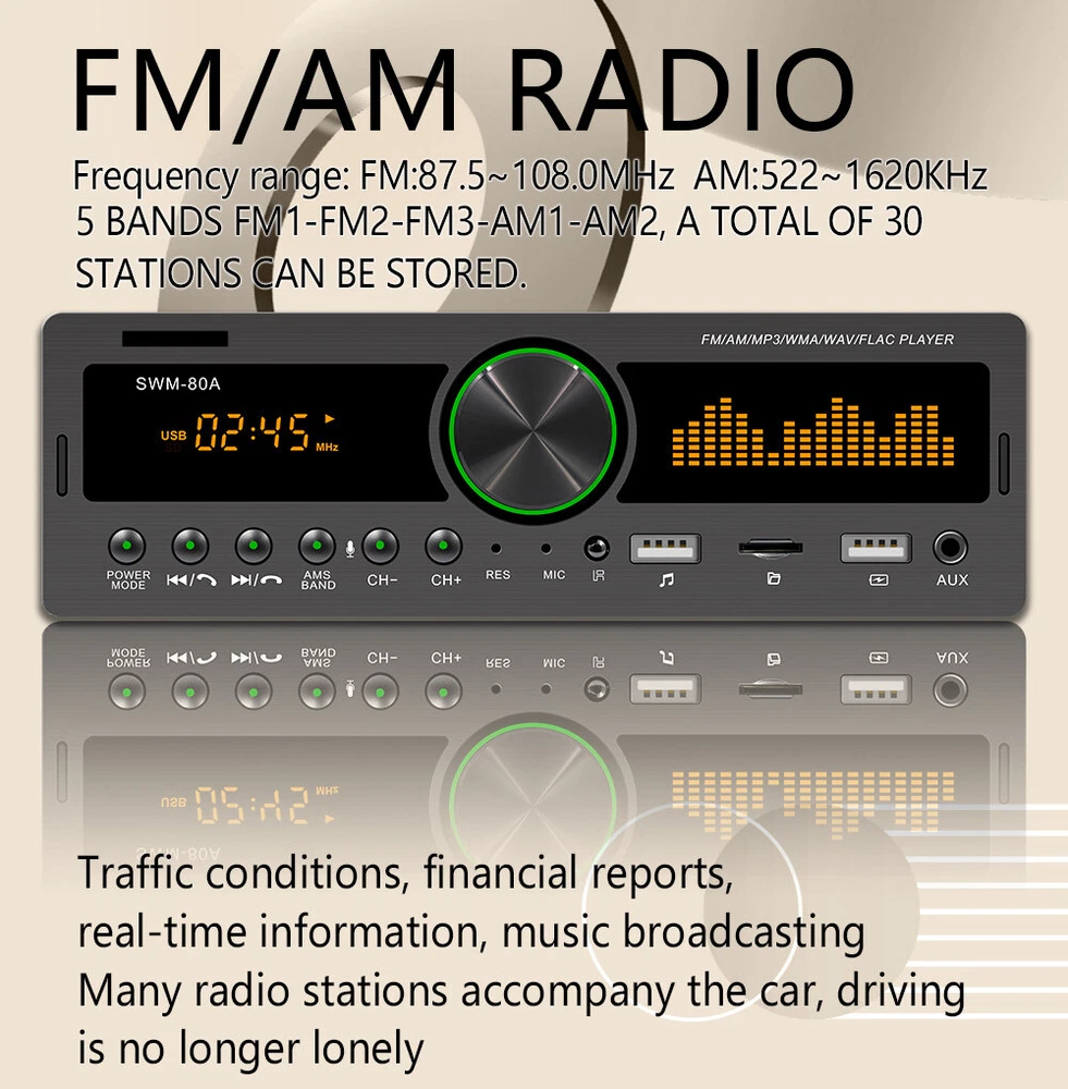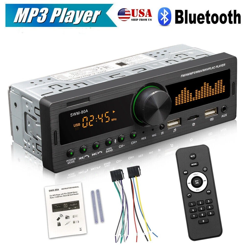 Features: Bluetooth + built-in microphone 2 USB, USB fast charging Support for hands-free calls. Support car locate via smart-phone APP. Support advanced audio transmission mode. Support the clock indicating that the power is off. High-quality digital stereo AM/FM radio Radio frequency:FM(87.5~108MHz)/AM(522~1620KHZ) Support for USB / TF card reader Audio support: MP3 / WMA / WAV formats and so on. Support folder reading function Support for remote control. Electronic rotary volume control MP3 playback supports pause / preview / repeat / random play and 10 up / down selections. Electronic type bass / treble / left and right balance / front and rear balance volume control Front AUX audio input port Rear L / R terminal RCA audio output port. 4-track high-power output (4 high-power speakers) Working voltage: DC12V Radio: Model: SWM-80A Main function: MP3, 2 USB, TF interface, AM, FM, Bluetooth, auxiliary input Audio format: MP3 / WMA / WAV formats and so on. Amplifier output power / channel: 60W x 4 Interface: 2 USB / TF / AUX IN Input voltage: 12V Bluetooth version: V4.0 Dimensions: 183mm (L) x 53mm (H) x 60mm (W) Note: 1. This car multimedia player is compatible with all cars. Please check the size of the product. 2. Installation requires knowledge of electronic products. Please install it with professional help. 3. If you are unsure whether this model is suitable for your car or not, you can send a message to our customer service for assistance. Package Included: 1x car stereo 1x remote control 1x power cable 1x English user manual 1x mounting kit Shipping 1. We ship to Worldwide,e xcluded some far away places. 2. We only ship to confirmed PAYPAL address; your PAYPAL address must match your Shipping address. 3. Any non-received items caused by invalid address registered on PayPal are not in our full refund or replacement policy. Shipping fee has including the local handing and packaging fee. 4. All the items will be shipping within 1-2 working days after receiving the payment, except some holidays. 5. When the shipping method is express delivery, some areas need to pay remote fees to the courier company. Taxes, Customs & Duties 1. Some countries are required to collect customs duties. Please confirm your local customs duties before placing orders. 2. We will not be responsible for any custom delay or tax, because transit time is highly depended and provided by postal Service. Returns 1. If you have not satisfied as you received the item, please return it within 30 days for a replacement or money back. Please contact us before you return it. 2. All returned items must be in the original packaging with all components and accessories included, and you must provide us the return shipping information (The shipment or the tracking number) 3. Return shipping fee is to be paid by the buyers. We will not be responsible for any custom duty or import tax. Warranty 1.One Year Manufacturer's Warranty for defective items (excluding items damaged and/or misused after receipt). 2.Defective items must be reported and returned to us within the warranty period (and in the original packaging, if possible). You must tell us what the defect is and give us your eBay ID. We do not repair or replace items with an expired warranty. Feedback