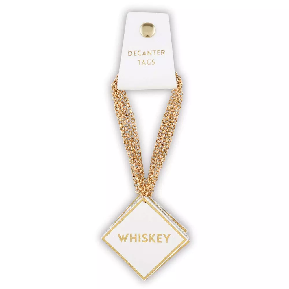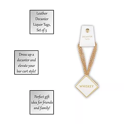 Style your bar cart and dress up a decanter with these leather tags. each of Gin, Rum, Tequila, Whiskey, and Vodka. The perfect gift awaits! To put it simply, at they make what they love and they love what they make. Since 1976, it has been their mission to create beautifully designed, high-quality giftware products that you are inspired to give and want to keep. Their passion for finding the next wonderful product has translated into a broad line drawn from the works of the most talented and trendsetting designers. Browse them all by searching for products from . SET OF 5 WHITE LEATHER BOTTLE TAGS with gold foil stamping and gold metal chains; dress up a decanter and elevate your bar cart style DIMENSIONS: Each bottle LABEL measures 2 x 2-inches 5 DIFFERENT LABELS: each of Gin, Rum, Tequila, Whiskey, and Vodka SEARCH FOR SIPPIN' PRETTY DRINKWARE AND BAR ACCESSORIES to pair with coordinating items to complete your bar set up or to give as a gift : Has been offering quality-made, designer home décor and gifts since 1976
