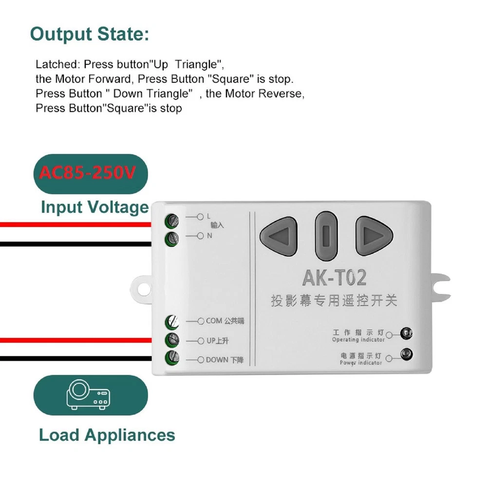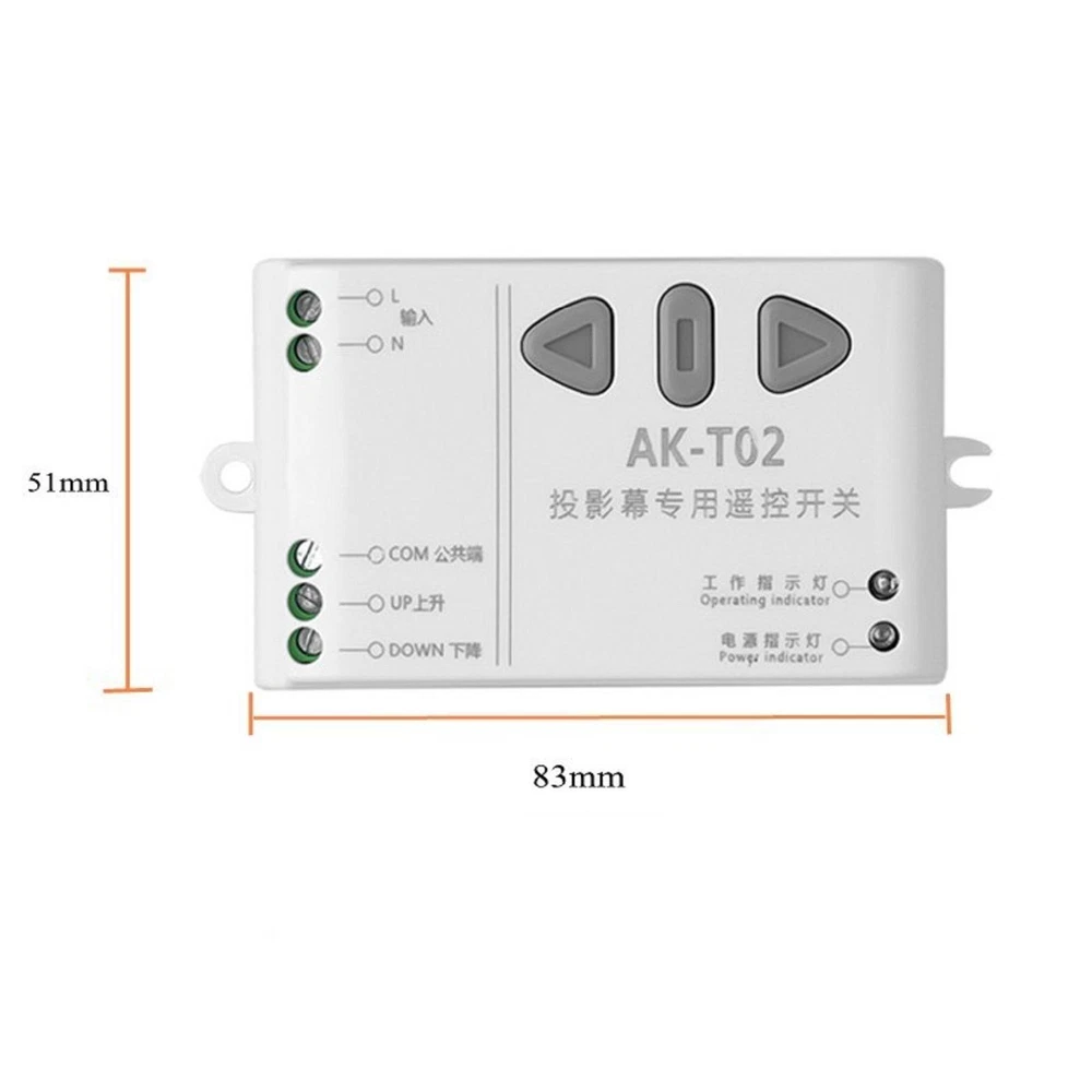 SAFE & SECURE SHOPPING 100% SATISFACTION GUARANTEED FAST SHIPPING Store Categories Store Categories You may also like 433.92mhz AC85-250V intelligent digital RF wireless remote control switch system Product Description 433.92mhz AC85-250V intelligent digital RF wireless remote control switch system for projection screen Receiver Specifications: Working voltage: AC85~250V Maximum power: ≤ 500W Standby current: 10mA Wireless sensitivity: -105dbM Remote control distance: Approx. 30 meters Frequency: 433 MHZ Receiver size: 83x51x25mm Remote control size: 120 x 45 x 18mm Remote control battery: 1* 12V/23A battery(Not included) Features: Applicative Motor: ≤500W or less 3 Lines Forward Reverse Motor (Forward Line +Reverse Line+ COM Line) Encoding Type: Learning Code (Learning Button to add Remote control). Remote control & Receiver Button: ''Up Triangle'' Up/Motor Forward; Button '' Down Triangle'' for Down/Motor Reverse; Button ''Square'' for Stop More intelligent design can make our lives more convenient Instruction Manual: 1. Clear code: Long press the up button or down button of the receiving controller, the work indicator flashes slowly 3 times after 3 seconds, and the work indicator flashes 3 times quickly after 8 seconds, which means the code clearing is successful. (After the code is cleared successfully, all the remote controllers that have been coded cannot be controlling the receiving controller. Please re-code the code if you need to use it) 2. Learning Code: Long press the up button, the work indicator will flash slowly after 3 seconds. At this time, press and hold the △ button on the remote control, and the work indicator will flash 2 times quickly, indicating that the up button is successfully paired. Long press the down button, the work indicator will flash slowly after 3 seconds. At this time, press and hold the ▽ key on the remote control, and the work indicator will flash 2 times quickly, indicating that the down button is successfully paired. (After finishing the study, press the up or down button on the remote control to see the work indicator light up) Otherwise, please study again. The buttons on the controller and the buttons on the remote control can work in linkage and use each other. Package Includes: 1X Receiver 1X Remote control(Not included 1* 12V/23A battery) Note: *For your convenience, the remote control and receiver have been paired. *Only the above package content, other products are not included. *Light reflection and different displays may cause the color of the item in the picture a little different from the real thing. The measurement allowed error is +/- 1-3cm. *Don't operate control buttons rapidly and frequently , because the controller is controlled. by microprocessor , each operation state will response in 1second. *If discover the LED lights darken or remote distance shorter, please replace the battery. Shipping Returns Contact Us Payment Shipping 1. Items sent from US warehouse. 2.Receiving time = Processing time + Shipping time 3. Processing Time: Around 1-2 business Days 4. Shipping Time: 3-5 business day it may have a little delay during some holiday (such as Christmas),any problem ,please feel free to contact Returns 1. 30 days warranty from the purchased date. Please contact us via email before returning the defective item. 2.Our warranty does not extended to any product that are physically damaged or that are not under normal operating conditions as result of misuse or improper installation on the buyer/user's part. 3.Return items should include the original packaging and all accessories. buyers MUST contact us for the returning address. 4.In all cases, buyers pay shipping fees at their own cost to return products for exchange or refund. We will be responsible for the postage of replacements. Refund will be made upon receipt of the returned item. Contact Us Pls contact us if you have any problems,we will try our best to solve for you Payment We accept all verified payment from eBay. Copyright © 2022 Tongtool