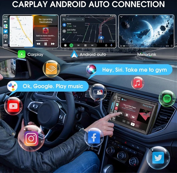 Brand ABSOSO Connectivity Technology Bluetooth Mirror Link USB Controller Type Touchscreen, Siri Google Assistant Special Feature Bluetooth Mirrorlink Spotify Pandora, AM FM Preamp Subwoofer Video Output Preset EQ, 7 Inch CarPlay Touchscreen 1080P Video Play, Apple CarPlay Android Auto Voice Control GPS Navigation, Backup Camera Input USB SD AUX-inBluetooth Mirrorlink Spotify Pandora, AM FM Preamp Subwoofer Video Output Preset EQ, 7 Inch CarPlay To… See more Compatible Devices Subwoofer, Tablet, Amplifier, Smartphone, Speaker Connector Type RCA 【Double Din CarPlay Radio with Bluetooth & Phonelink】: The carplay audio system with built-in bluetooth technology for hands-free calling and audio streaming, you can enjoy the driving entertainment. The car stereo receiver supports navigation function and phonelink for the android cell phone via the app and iPhone via the original charging cable. Note: Only compatible with Android 11.0 or below version, iPhone XR, iPhone 8 Plus or below version. The stereo headunit is not a GPS unit 【Mechless Digital Multimedia Receiver】: With the 7-inch HD touchscreen monitor, you can enjoy your favorite movies or music from your devices with the Aux input/USB port/micro SD, supporting audio format: MP3/WMA/AVI/MKV/MP4/WMV/RMVB/MPEG and video format: RM/RMVB/DVD(VOB)/VCD(DAT)/MP1/MP2/DIVX/XVID/MP4/H263/H264/FLV/3GP/SWF/AVI/ASF/MJPEG etc. This double din stereo is not a CD/DVD Player 【Rear Front View Camera】: The bluetooth car radio supports rear and front view camera with an automatic display of the image on the screen when in reverse. A waterproof HD rear camera with 170° ultra-wide viewing angle included in the package 【Perfect Vehicle Fit】: 100% standard mounting size perfectly match your cars, please double check the dash size before ordering. It features pre-amp, subwoofer outputs, AM/ FM radio receiver, steering wheel controls, wireless remote control, built-in preset, 7 multicolor buttons, and USB charging option