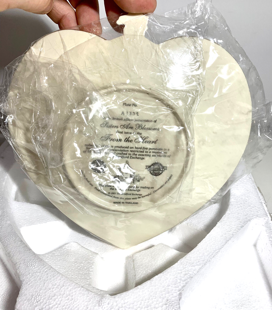 Bradford Exchange Sisters Are Blossoms from the Heart Collector's Wall Plate 2002 New old stock Bradford Exchange wall hanging plate Heart shaped Sister's are Blossoms Measures: 7.25" wide x 7.5" high Has original Styrofoam packaging with some wear/marks Has Certificate of Authenticity Please view all the photographs for Condition of the Item! Thank You and Have a Great Day !