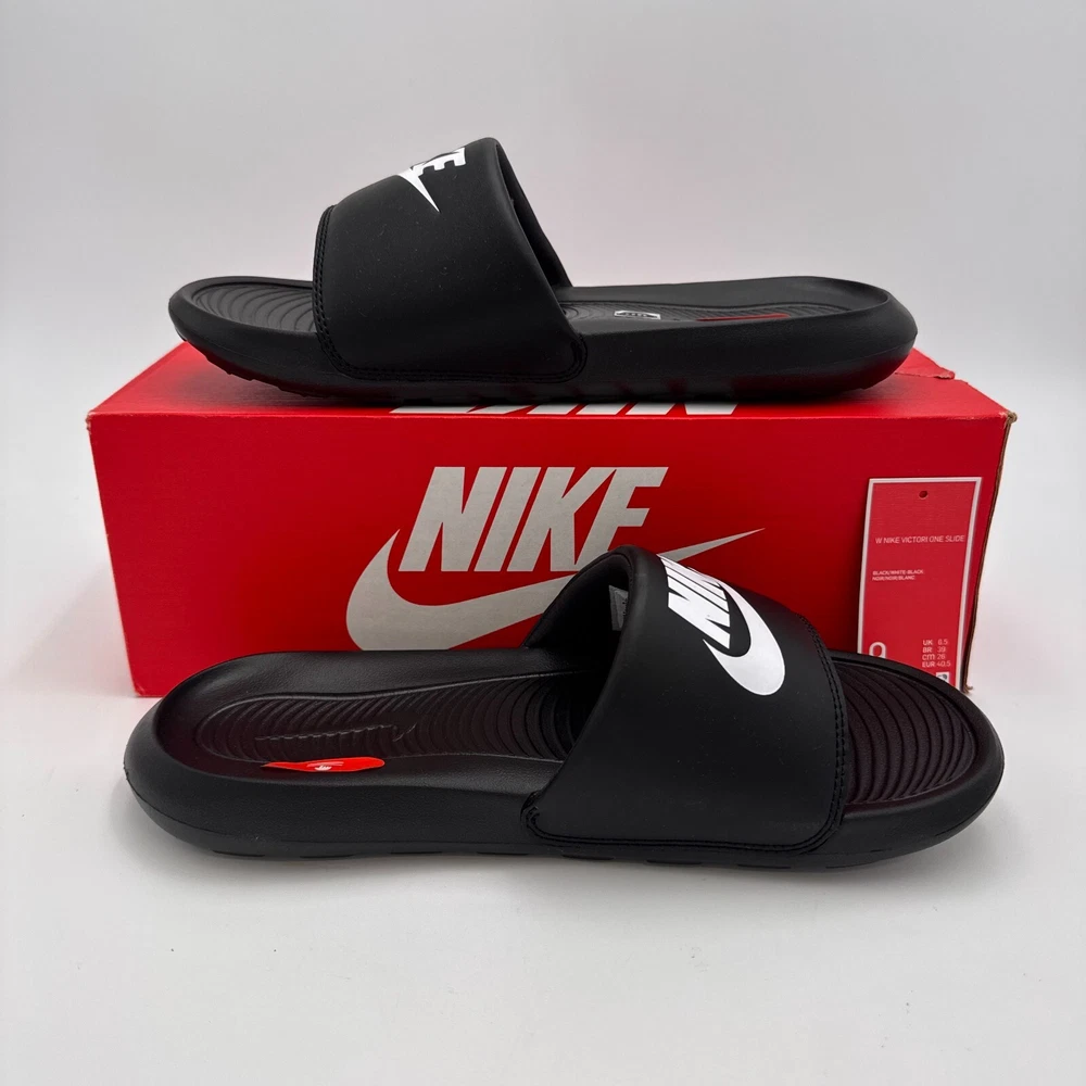 Size 9W Nike Victori Slide Slip On Black/White - CN9677-005 BRAND NEW Elevate your casual style with these chic Nike Victori Slide slip-on sandals. Featuring a synthetic upper material, these black sandals with white accents are perfect for any woman on the go. The slip-on closure provides easy wear, making them perfect for those lazy summer days. These sandals are a must-have for any fashion-forward woman and are perfect for any occasion. The size 9W fits comfortably, and the stylish design is sure to turn heads. Don't miss out on the opportunity to add these Nike Victori Slide slip-on sandals to your shoe collection. FAST AND FREE SHIPPING FEEL FREE TO REACH OUT WITH QUESTIONS OR CONCERNS