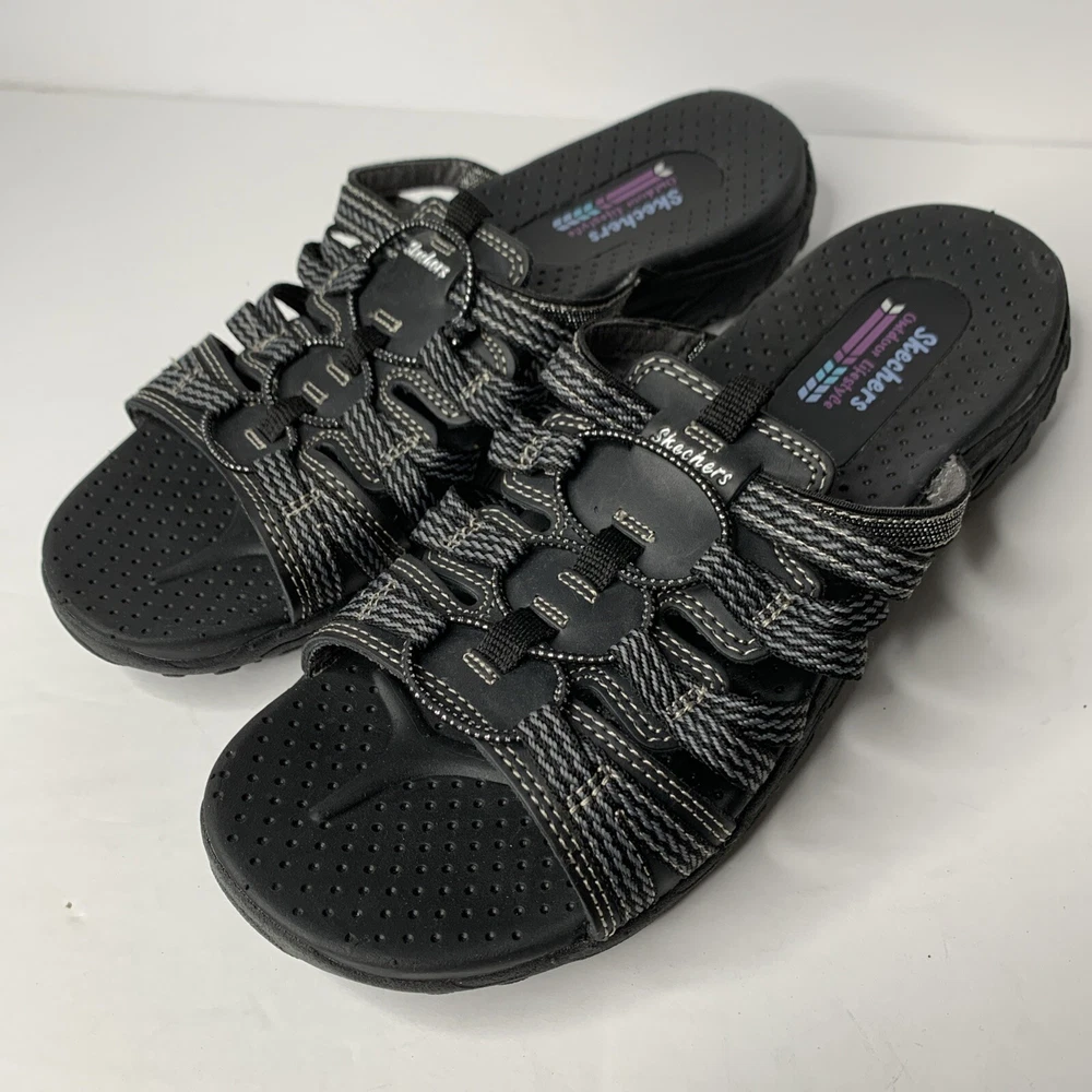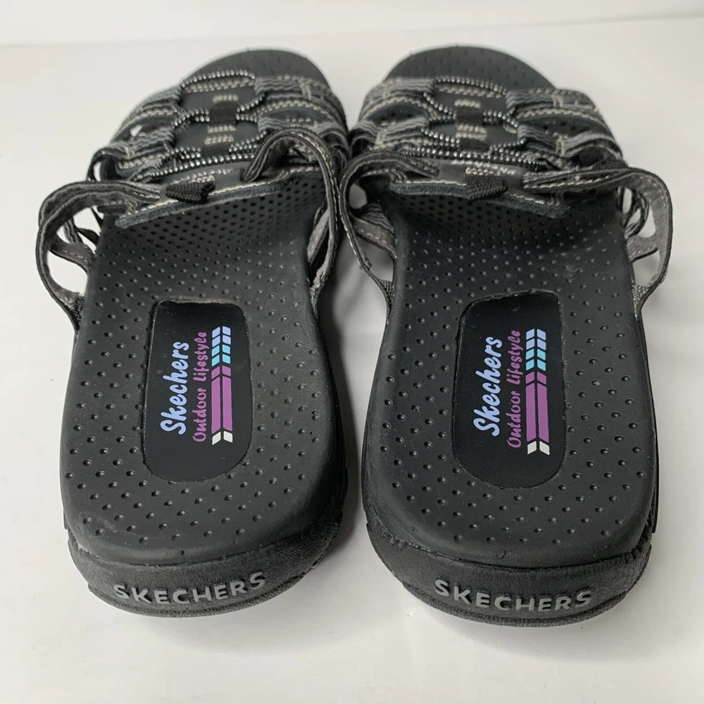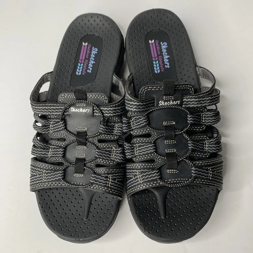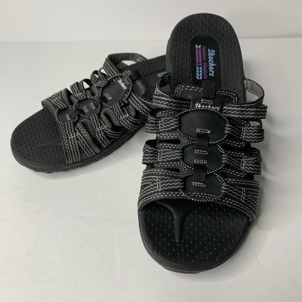 These Skechers 40873 Reggae Repetition sandals are black slip-on slides in women's size 8. They feature a low heel, cushioned insole, breathable fabric lining, and a rubber outsole. The design includes the Skechers logo and is perfect for casual comfort, outdoor activities, and travel. Made with leather uppers, they embody a nature and sports theme from the Skechers Outdoor Lifestyle product line.