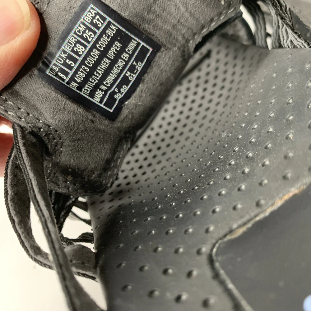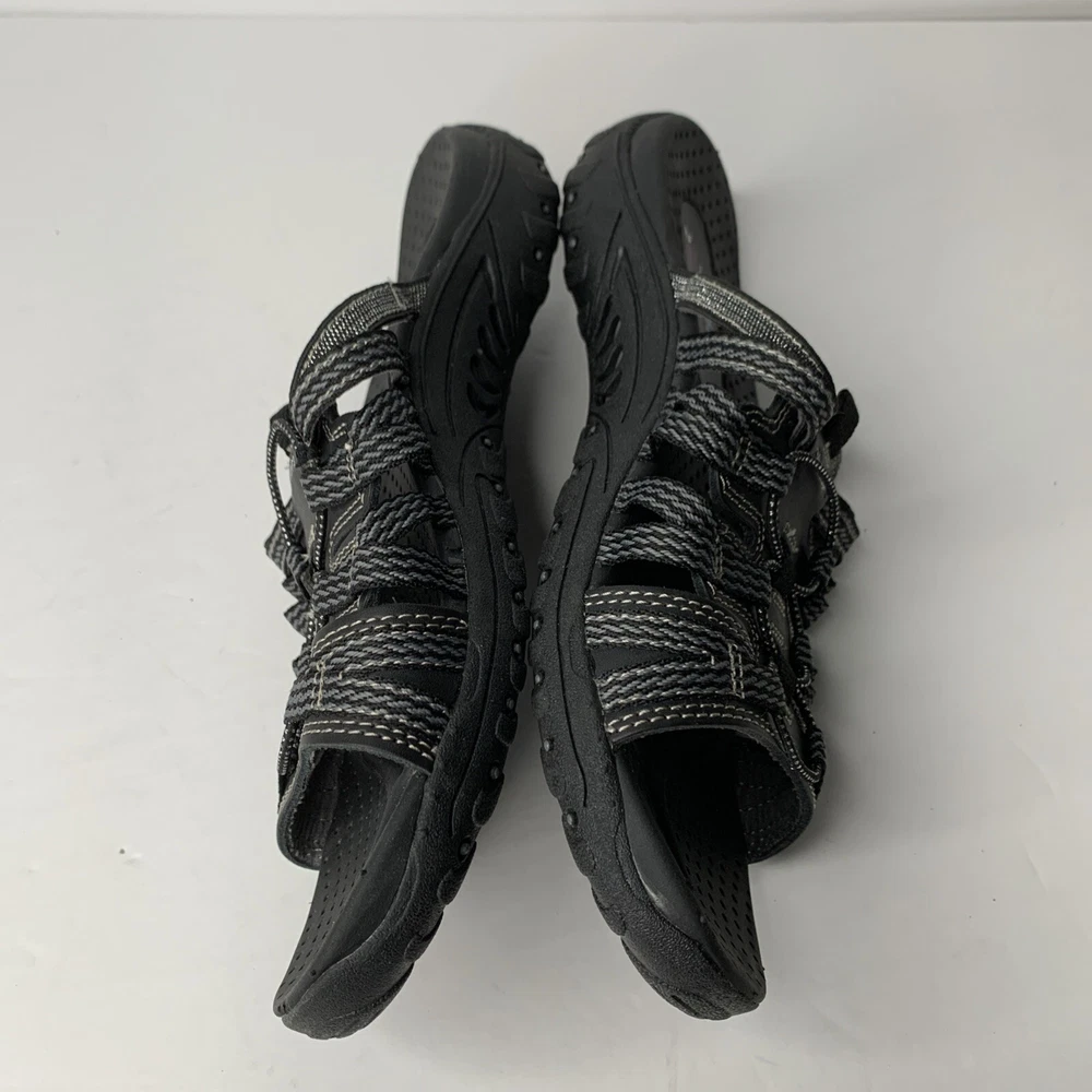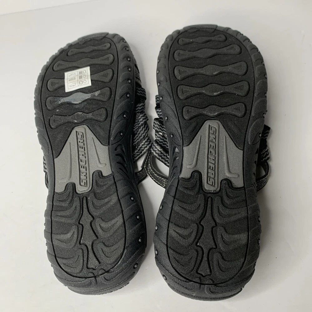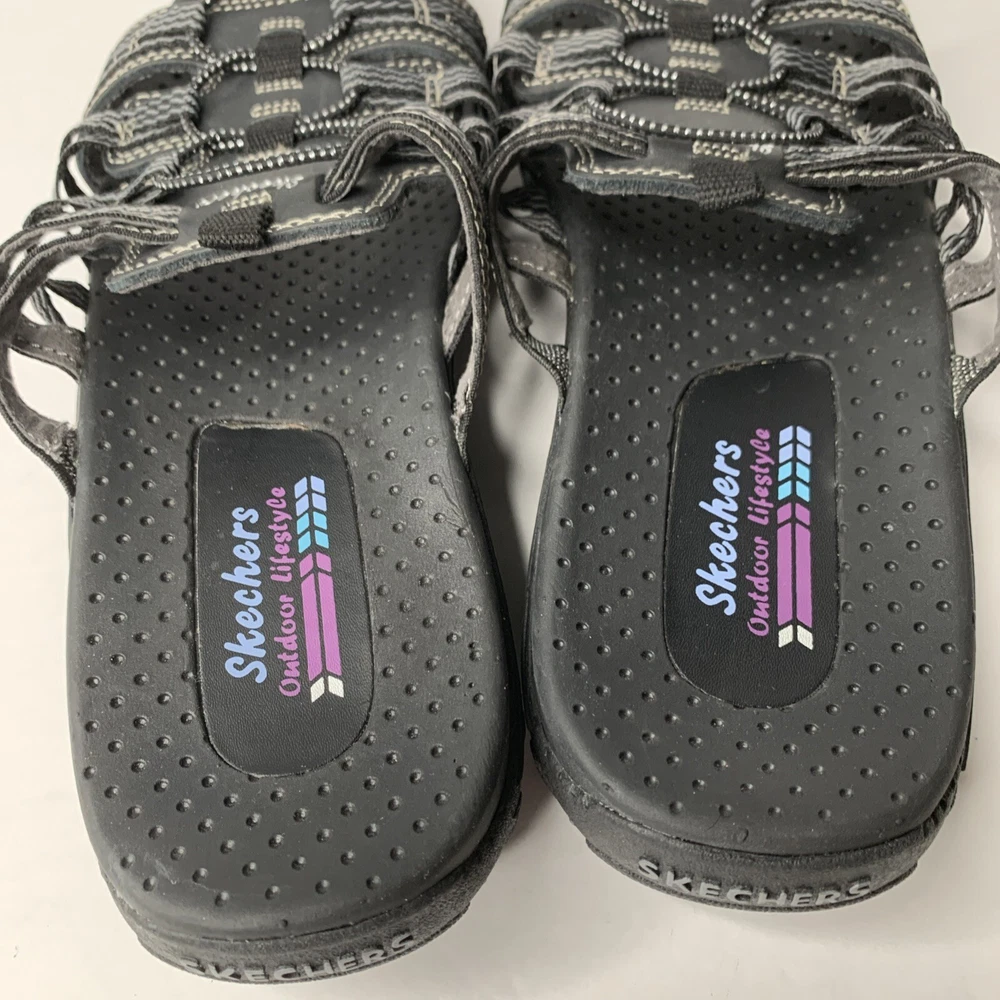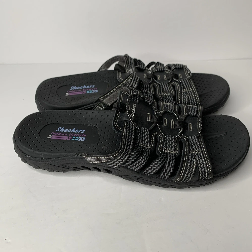 These Skechers 40873 Reggae Repetition sandals are black slip-on slides in women's size 8. They feature a low heel, cushioned insole, breathable fabric lining, and a rubber outsole. The design includes the Skechers logo and is perfect for casual comfort, outdoor activities, and travel. Made with leather uppers, they embody a nature and sports theme from the Skechers Outdoor Lifestyle product line.