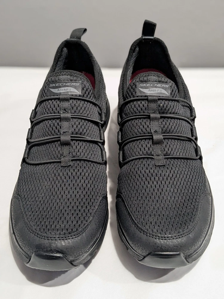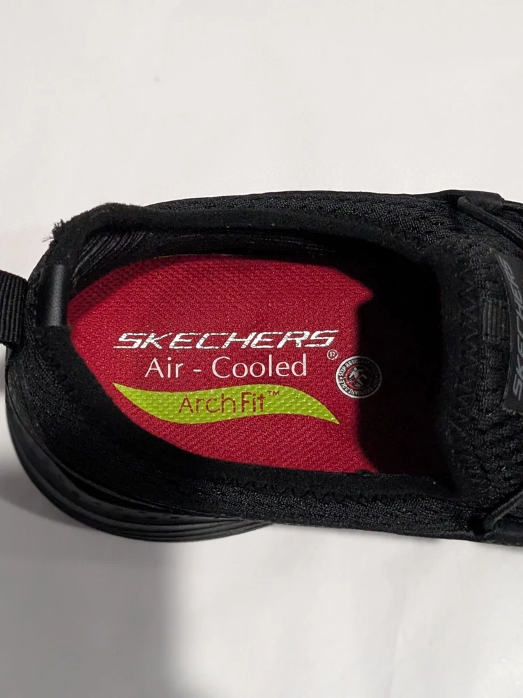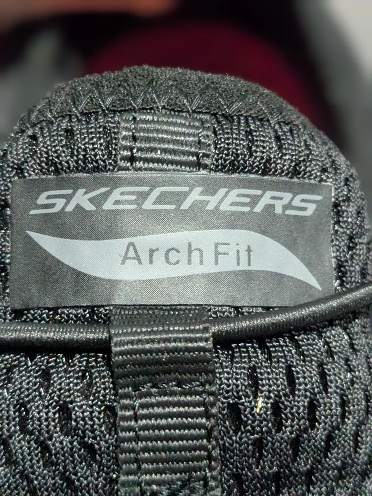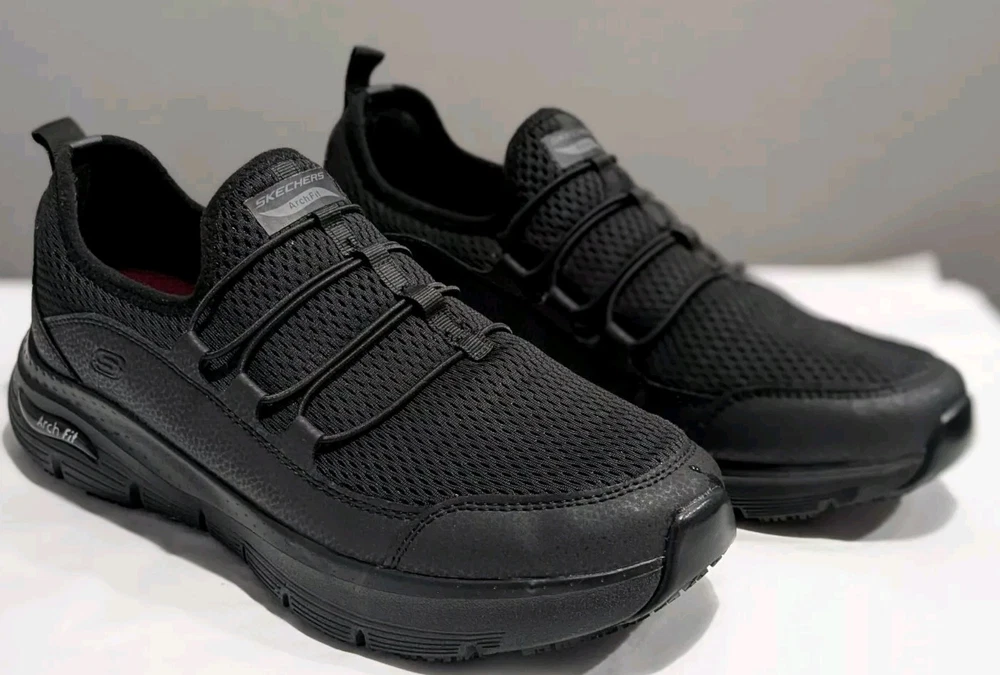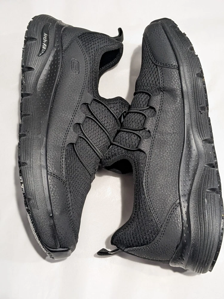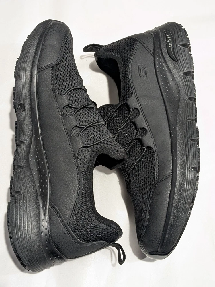 Skechers Arch Fit Slip-On work shoes for women in black, size 11 (UK 8, EU 41). Features include slip-resistant outsoles, W width, synthetic upper material, and Arch Fit technology for comfort. The model number is 108063W.
