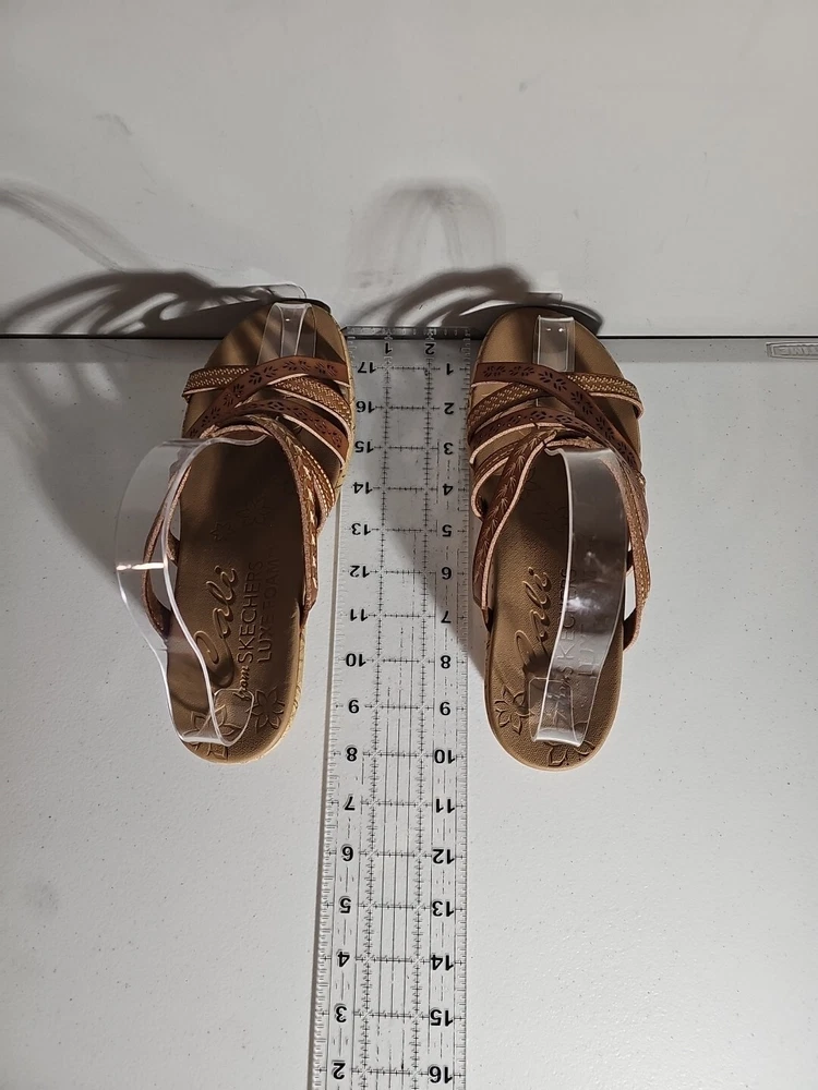 Elevate your casual comfort with these Skechers Beverlee Tiger Posse Wedge Slide Strappy Sandals in Women's Size 9. These sandals feature a slip-on closure and adjustable strap for a secure fit. The rubber outsole provides traction and durability, while the cushioned insole offers comfort and support. With a solid pattern and brown color, these sandals are perfect for summer, fall, and spring. The faux leather lining material and manmade upper material add to the durability and comfort. The Skechers Beverlee product line is known for its strappy design and casual comfort, making these sandals a great addition to any wardrobe. Super cute, worn once;)