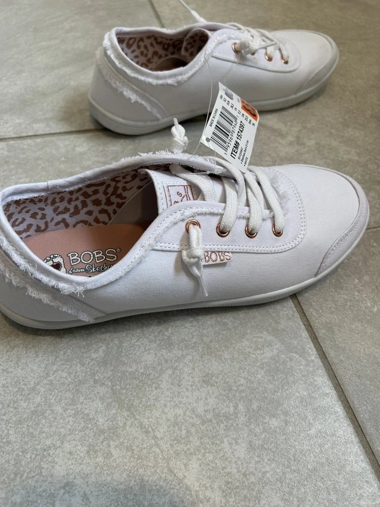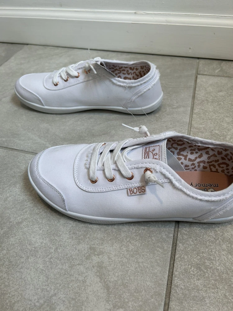 These Skechers Bobs B Cute slip-on shoes are designed for women in a casual style. They feature memory foam for added comfort, have a white color, and come in a US size 8. The upper material is fabric, and they have a B width. Perfect for a comfortable and stylish sneaker option.
