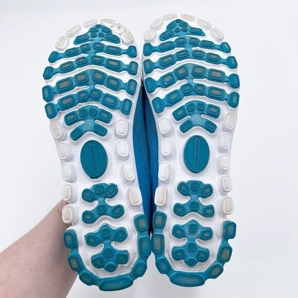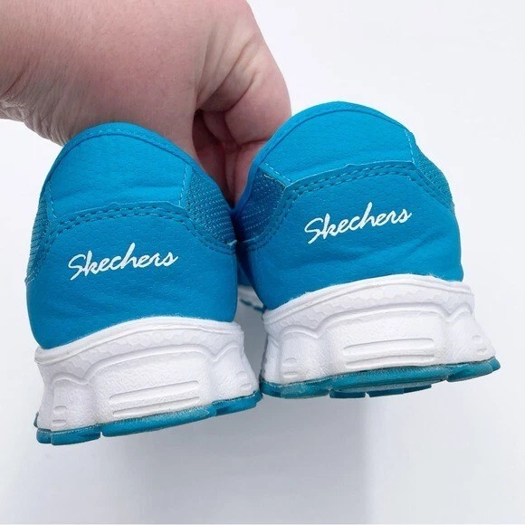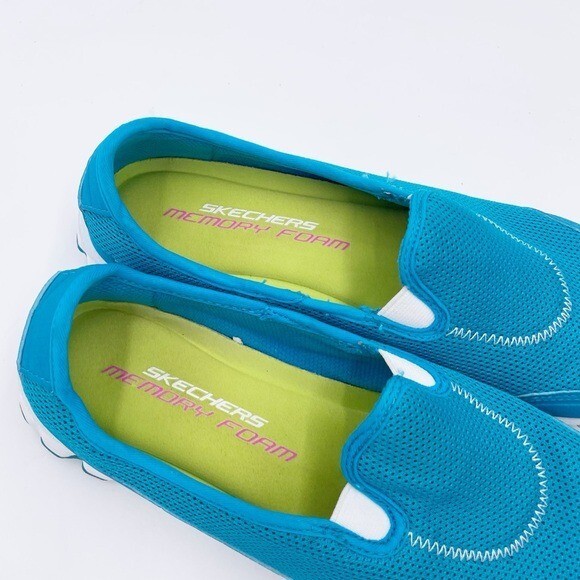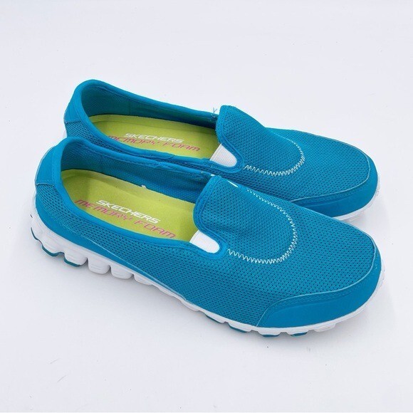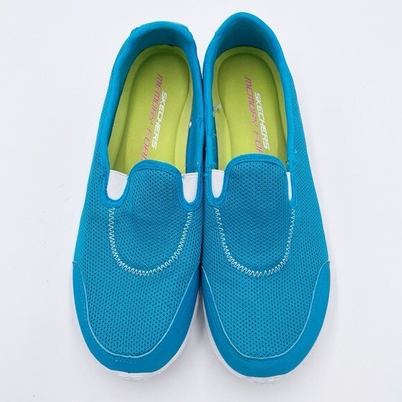 Skechers Memory Foam Go Walk Slip On Sneakers Bright blue and white with lime green insoles Slip on styling Comfort shoes Great for walking Size 9 Excellent pre-owned condition