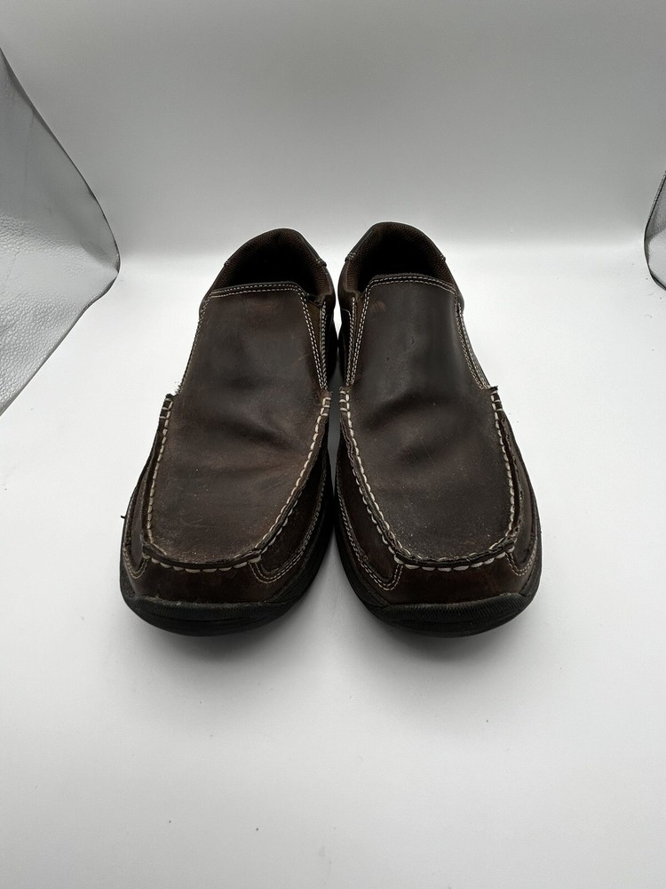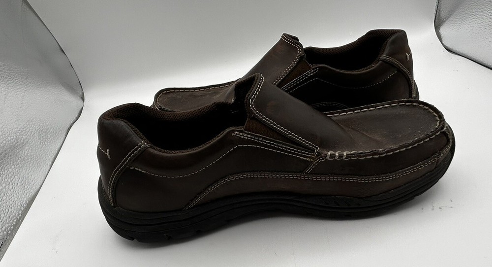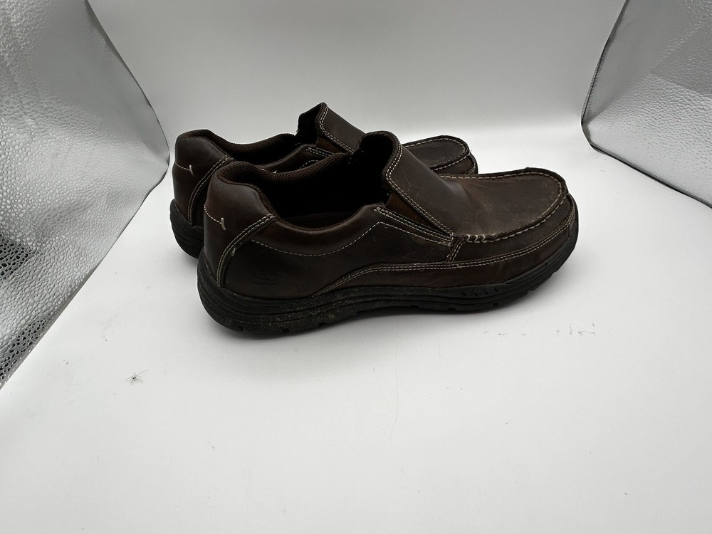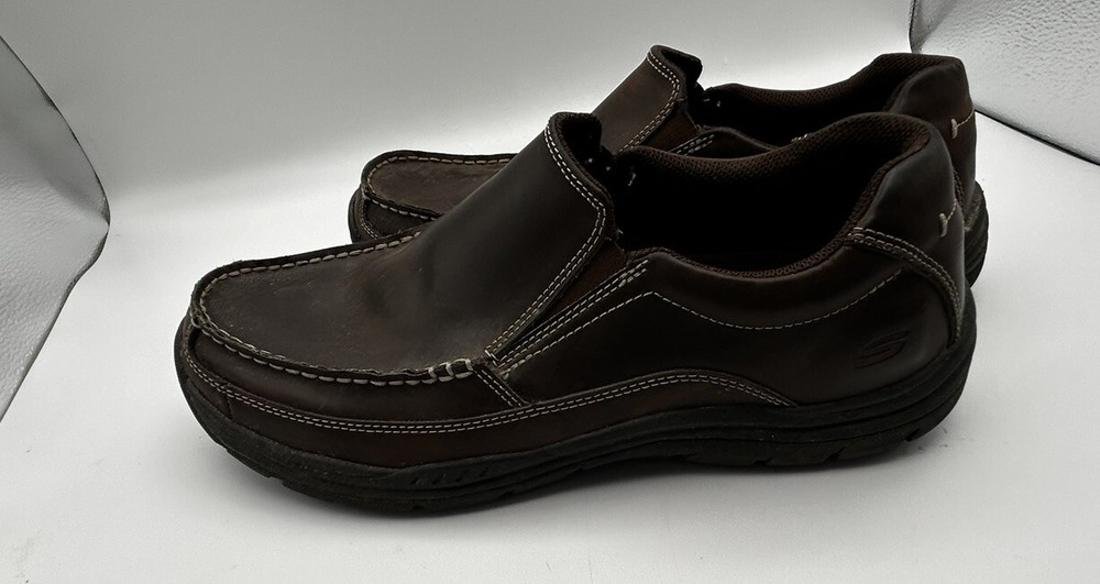 Elevate your casual shoe game with these Skechers relaxed fit memory foam slip-on loafers. The brown leather upper material paired with a round toe shape and synthetic outsole material gives a stylish and comfortable fit for any occasion, whether it be travel or casual wear. The cushioned, lightweight, and breathable features make these shoes perfect for all seasons, from winter to summer. These Skechers loafers come in a men's size 9.5 and foam insole material. The solid pattern and Skechers relaxed fit product line make these shoes a reliable and fashionable addition to any wardrobe. No matter if you're running errands or going on a trip, these shoes will provide the comfort and support you need.