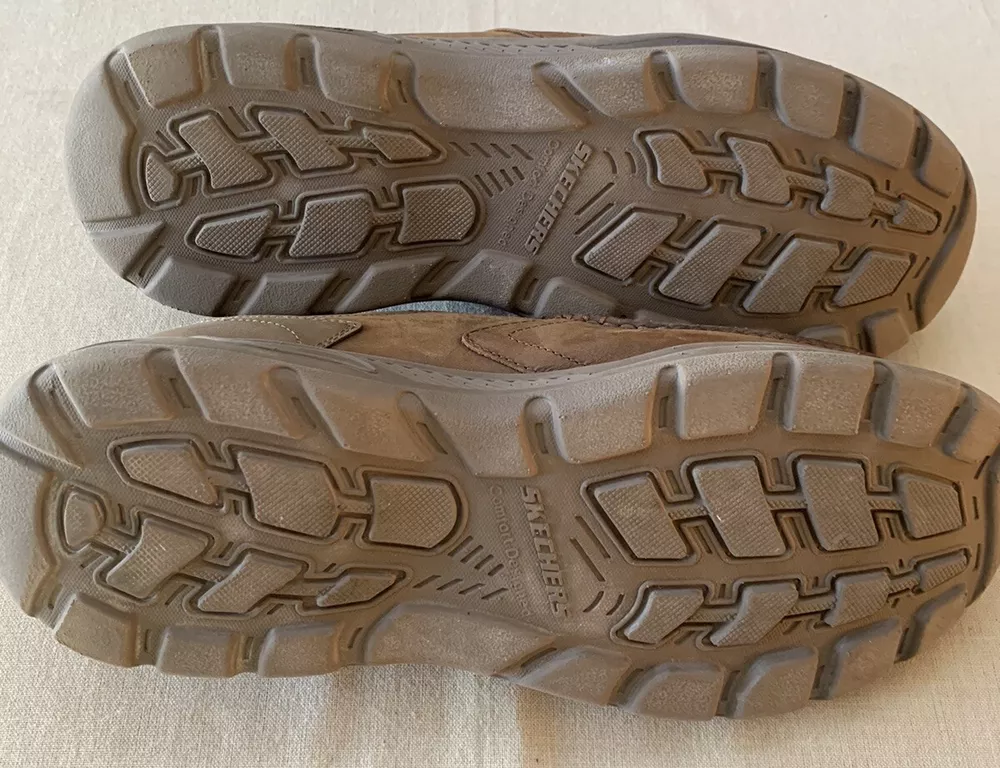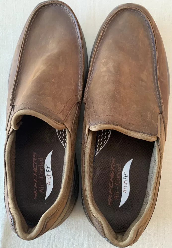 These Skechers slip-on shoes for men are made of brown leather, featuring an almond toe and a slip-resistant leather outsole. They have arch support, cushioning, and a comfortable padded lining. The shoes are size 14 in US measurements and have an almond toe shape. Perfect for travel, casual outings, or workwear, they combine style and comfort in a versatile design.