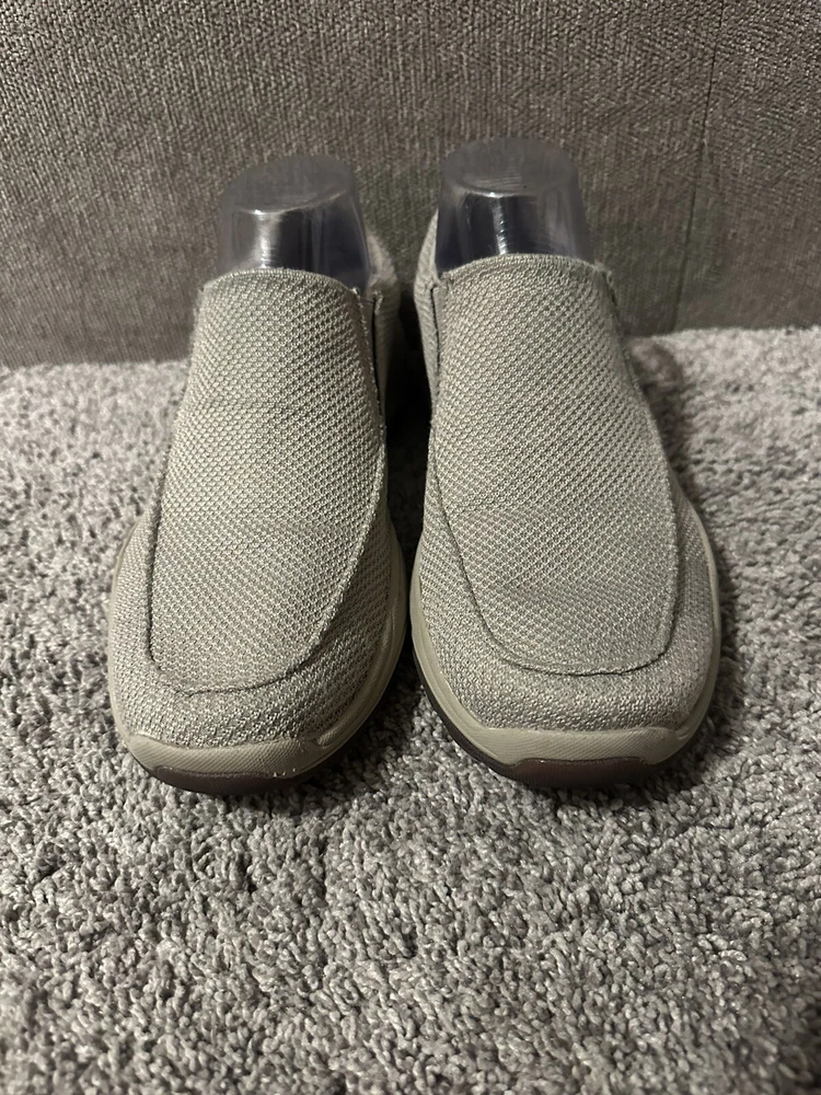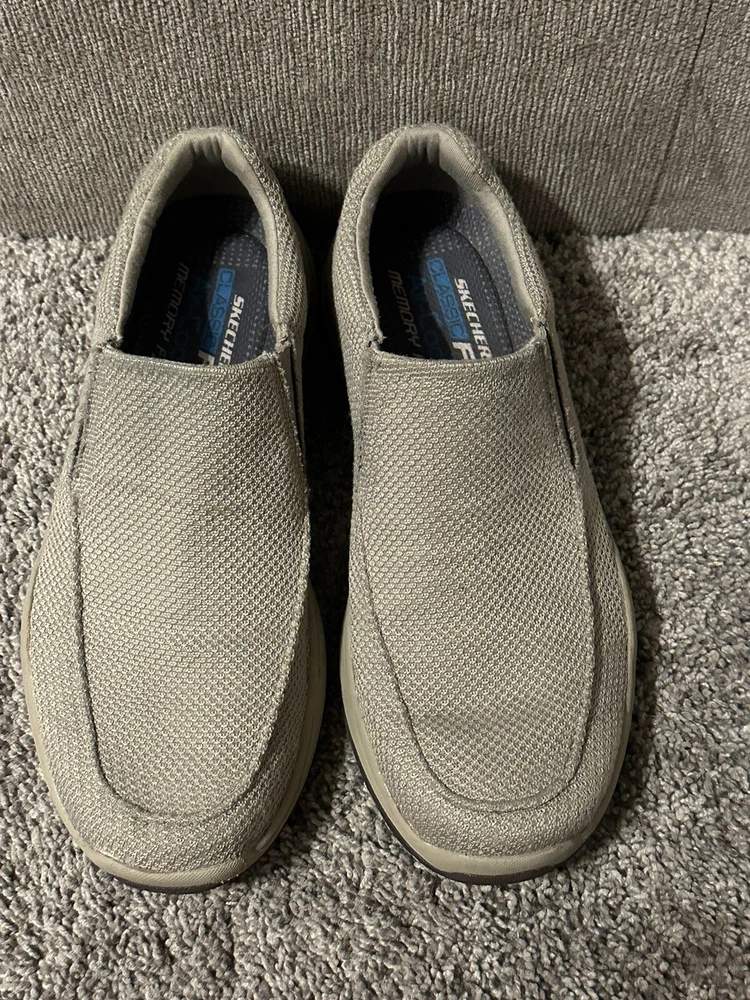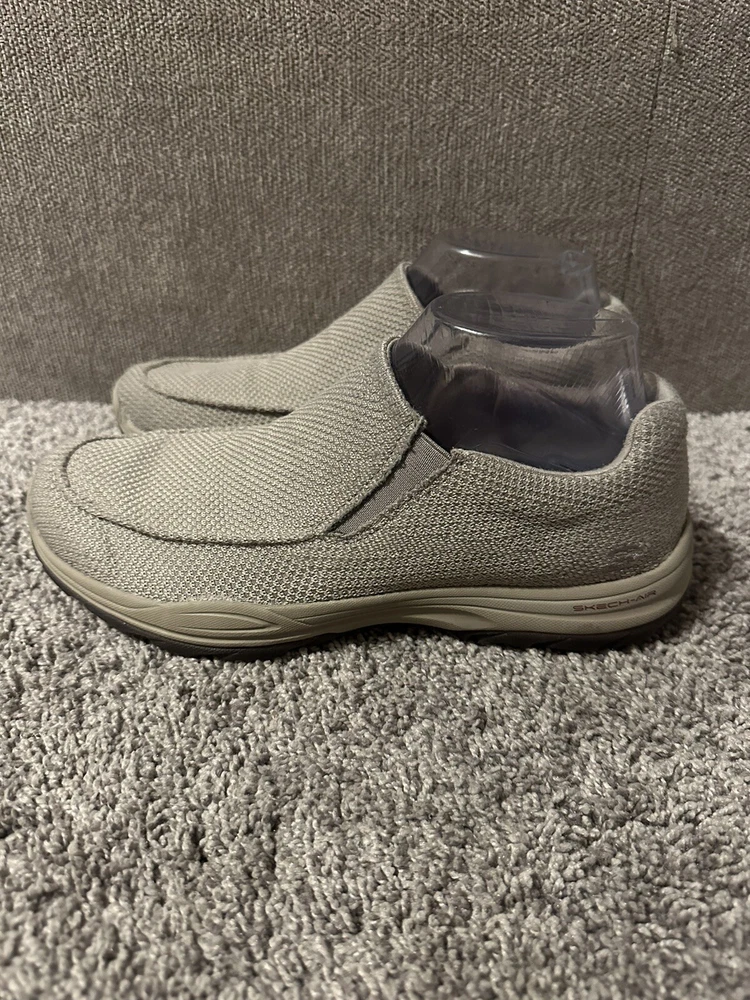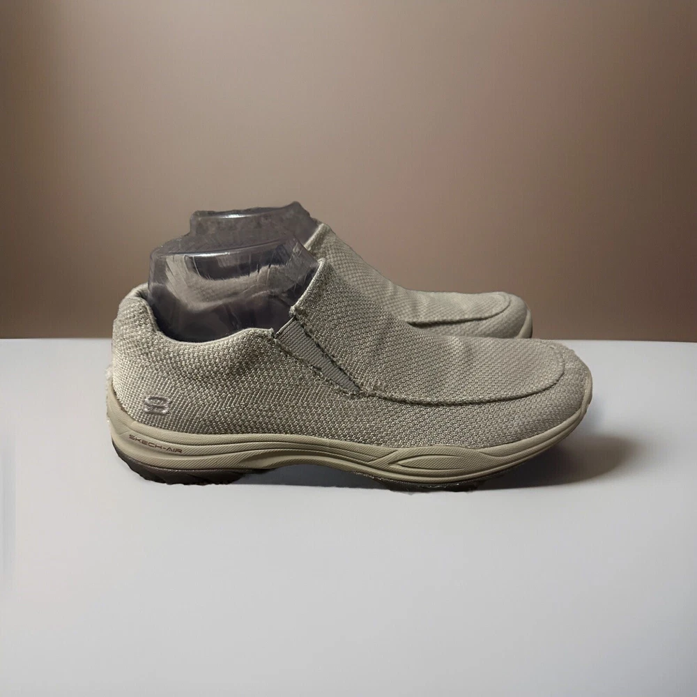 Elevate your casual shoe game with these Skechers Air Cooled Memory Foam slip-on sneakers in a classic beige color. These sneakers feature a synthetic upper material with a fabric lining, making them comfortable for all-day wear. The rubber outsole provides traction and durability, while the memory foam features add to the comfort and support. The sneakers are designed with a slip-on closure, making them easy to wear and take off. They are available in UK shoe size 5.5, US shoe size 6.5, and EU shoe size 39. These Skechers sneakers are perfect for any casual occasion and will keep your feet cool and comfortable throughout the day. Preowned Good Condition