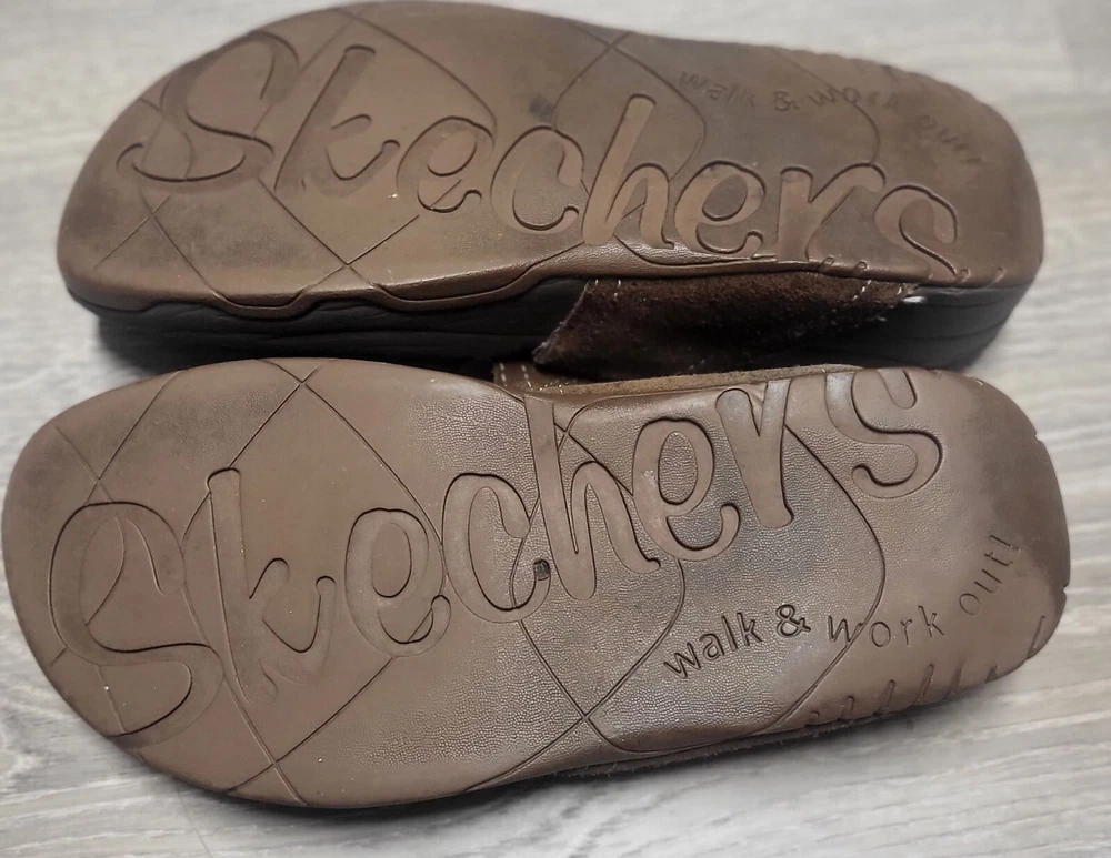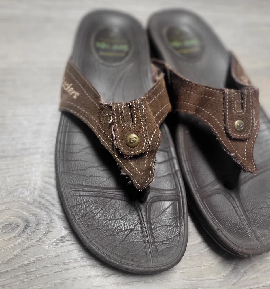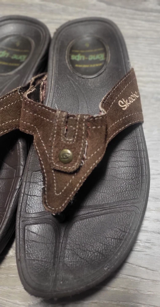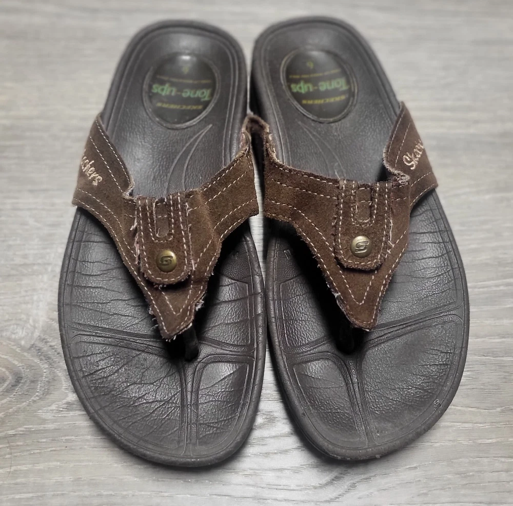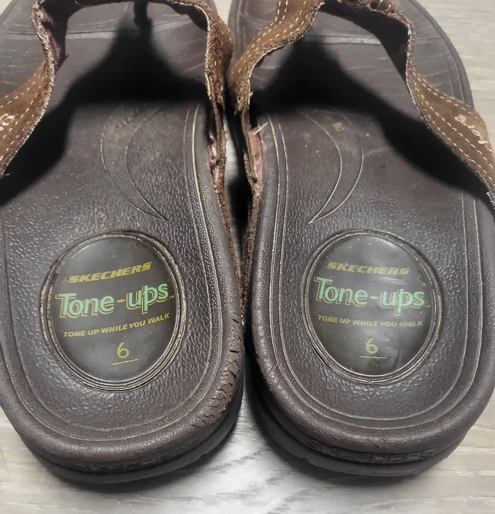 Step up your exercise game with these stylish Skechers Tone Ups Moonrock flip flops! These pre-owned sandals feature slip-on closure, low wedge heel, and synthetic outsole for comfort and durability. The brown suede leather upper with solid pattern adds a touch of elegance, while the synthetic insole provides toning benefits for your feet. The Skechers Tone Ups product line is known for its quality and reliability, making these flip flops a great addition to your shoe collection. Available in US shoe size 6 for women.