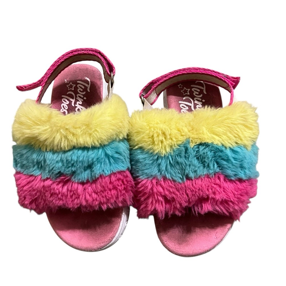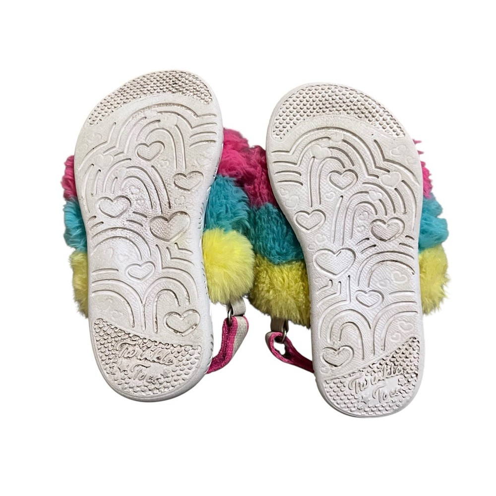 The Sketchers Twinkle Toes Light Up Sandals in size 9 are a fun and vibrant choice for little girls. Lights have been tested and work. Light pattern shows in the fuzzy parts of shoes. Do have some wear but lots of life left.