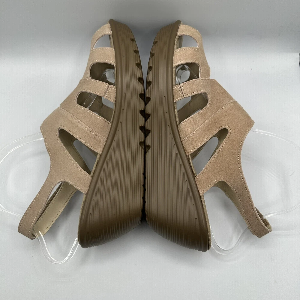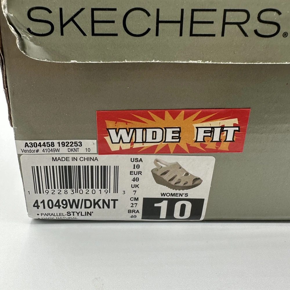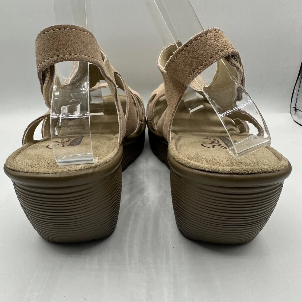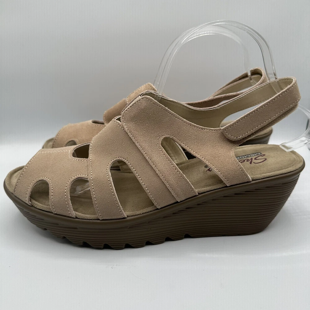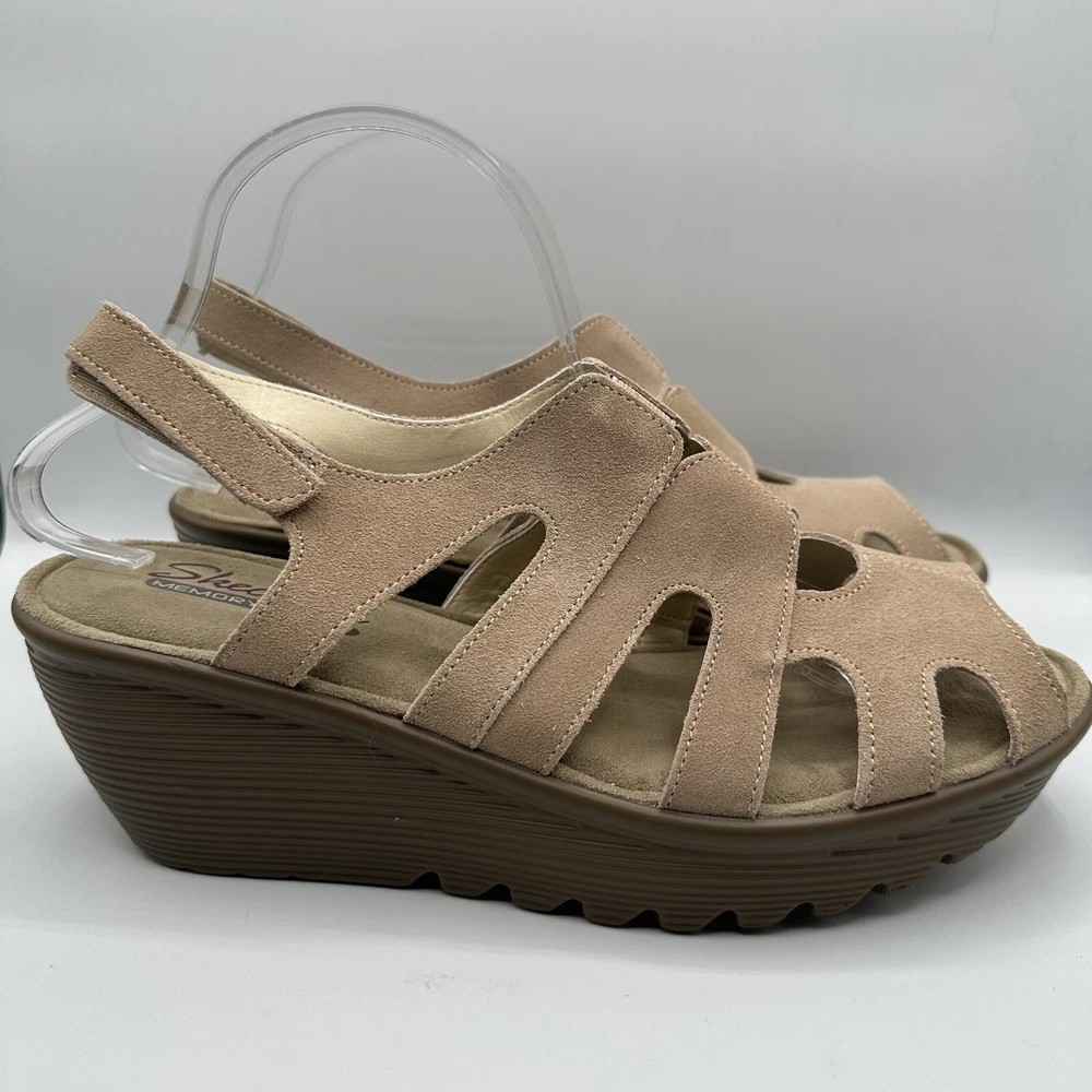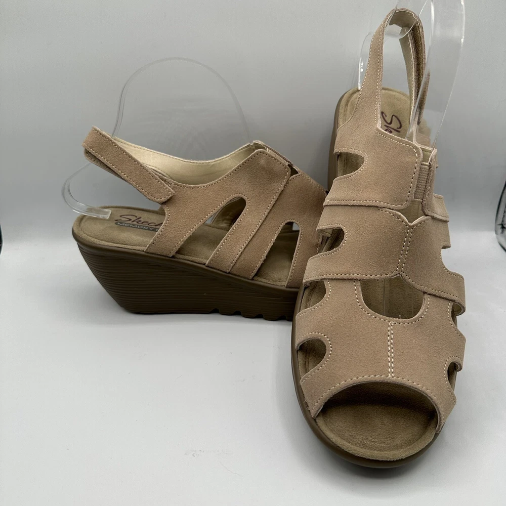 Skechers Women’s 10 Tan Memory Foam Parallel Stylin Wedge Heel Slingbacks Suede New with box, no flaws. Elevate your shoe game with these stunning Skechers Women's Memory Foam Parallel Stylin Wedge Heel Slingbacks. The tan-colored suede upper material and adjustable hook and loop strap make these sandals perfect for any occasion, whether it's a wedding, party, or a casual day out. The breathable features and wedge heel style ensure maximum comfort that lasts all day long. These sandals come in a UK shoe size 7, US shoe size 10, and EU shoe size 40. They have a solid pattern and a vintage-free design. The features of these sandals make them perfect for outdoor activities during spring and summer seasons. Add a touch of style to your wardrobe with these Skechers slingbacks.