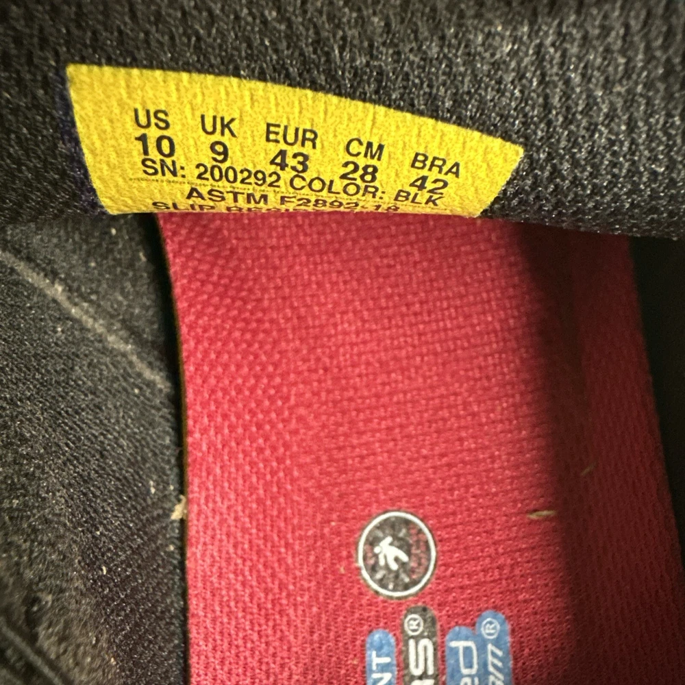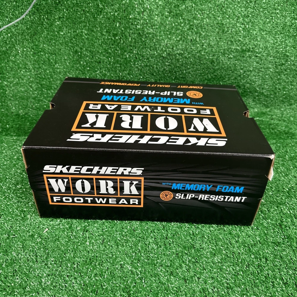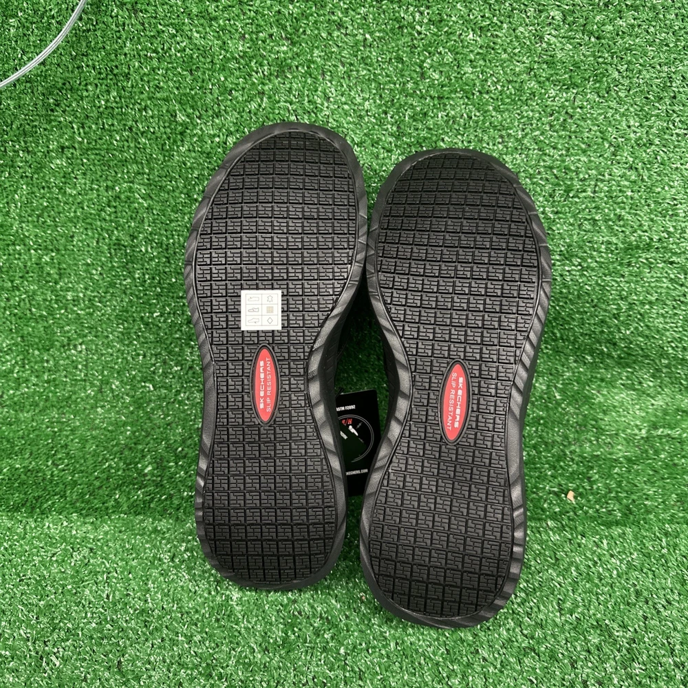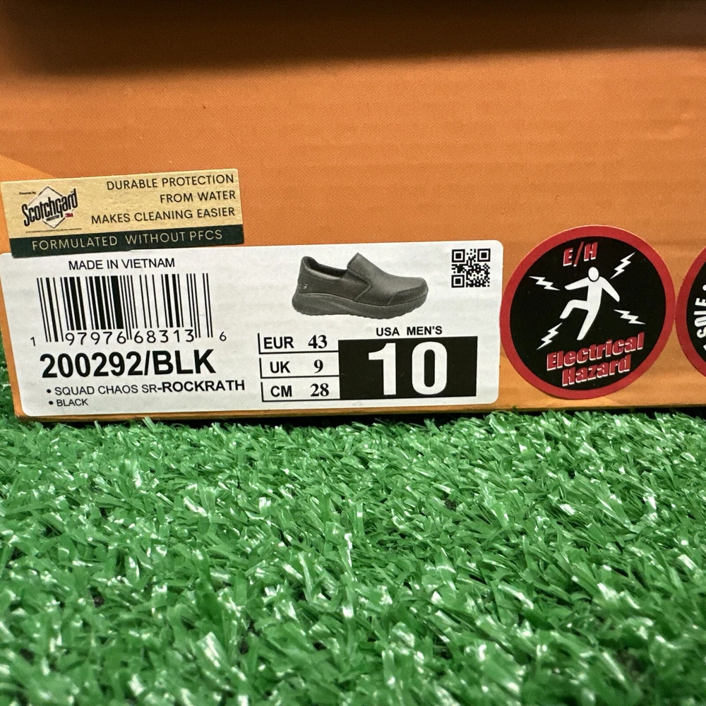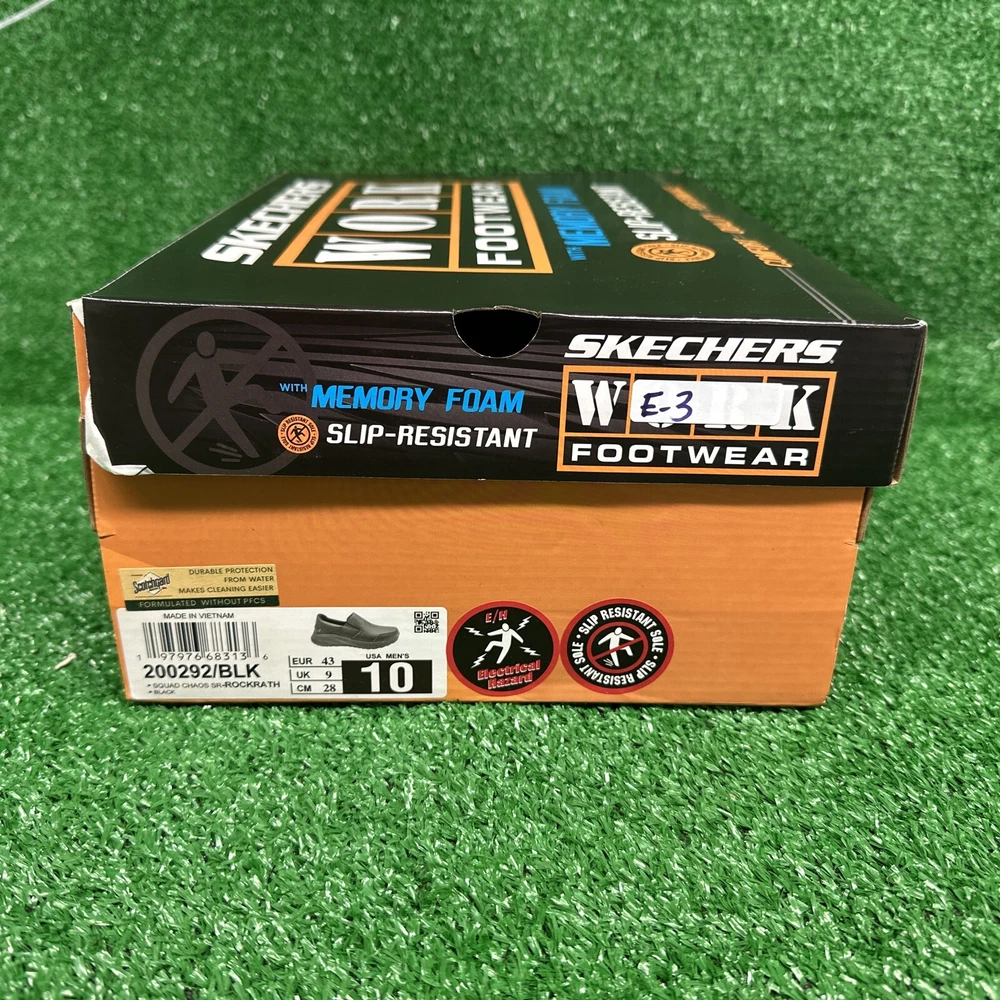 This is a pair of men's Skechers slip-on casual shoes in black, featuring the Rockrath model from the Skechers Relaxed Fit product line. The shoes are designed to be slip-resistant and have a synthetic upper material. They are in US shoe size 10 and are ideal for work environments requiring slip-resistant footwear. SKU- E3 Date- 02/05/25 Listed by-LM Condition- NWB Shade/size- 10/ black Inspected to the best of our abilities and looks to be in good condition. **Item has sticker for SKU purposes**