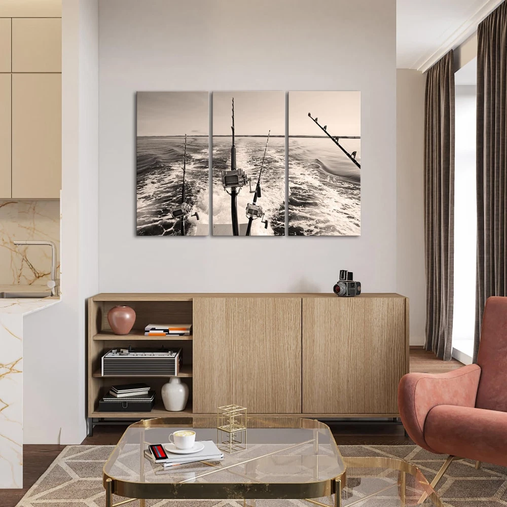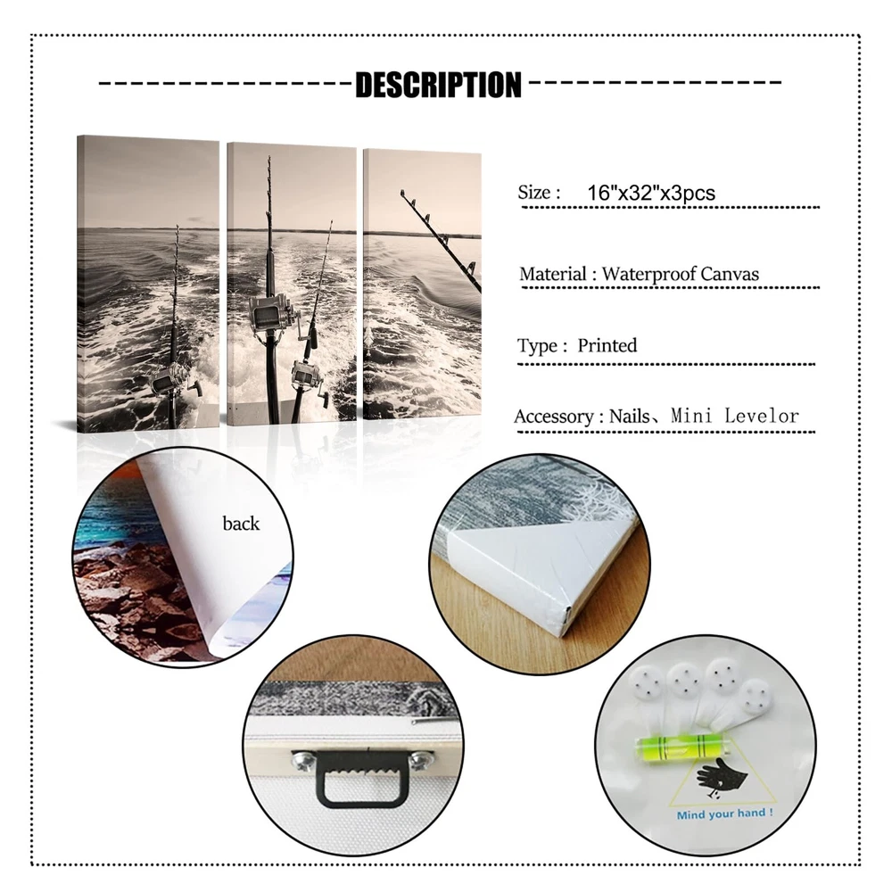 SkenoArt 3 Piece Fishing Canvas Wall Art Fishing Rod Pictures Ocean Seascape Wall Paintings Retro Beige Artwork for Living Room Bedroom Fishing Tackle Prints Home Decor Framed Product Details Recommended Uses For Product: Decorative purposes in fishing or ocean-themed rooms or spaces Color Family: Beige Orientation: Landscape Color: Brown Item Shape: Rectangular Pattern: Printed Style: Retro Theme: Nature Wall Art Form: Painting Room Type: Living Room Mounting Type: Wall Mount Frame Type: Framed Special Features: Waterproof Manufacturer: SkenoArt Number of Items: 3 Brand Name: SkenoArt Material: Canvas Paper Finish: Watercolor Frame Material: Wood Size: 32Wx48L Item Dimensions L x W: 48"L x 32"W Unit Count: 3.0 Count Size:16x32inchx3PCS (40cmx80cmx3PCS).The Size is Customizable. Professional artwork is used for a sharp hi-resolution image. Canvas printed with high resolution by the latest and most advanced color technology has the characteristics of durability, waterproof and moisture-proof The canvas artwork already stretched on solid wooden frames, gallery wrapped, hooks and accessories attached, ready to hang. Real product might be slightly different from the on-line product image due to the computer color display differences. About US and Our Product As a professional art work supplier, We are committed to bringing customers the best selection of canvas prints in the world. Our canvas is digitally printed using the latest printing equipments for reproductions, the materials used are friendly environmentally and each product is made by hand.