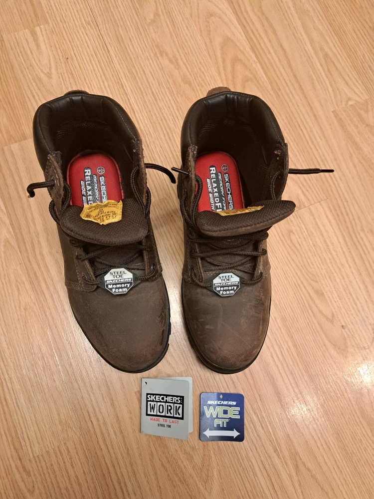 I bought these boots and never wore them outside of trying them on. I bought them for work but i never needed them. They got moved around my mud room a bit so they have some minor scuffs. I lost the box. Shipped next day. Thanks for looking!
